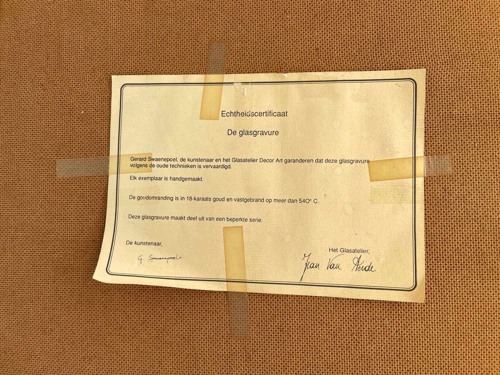Szklana grawerowana tablica Belgia ok. 1980 Gandawa pozłacana, certyfikat 47х 39cm