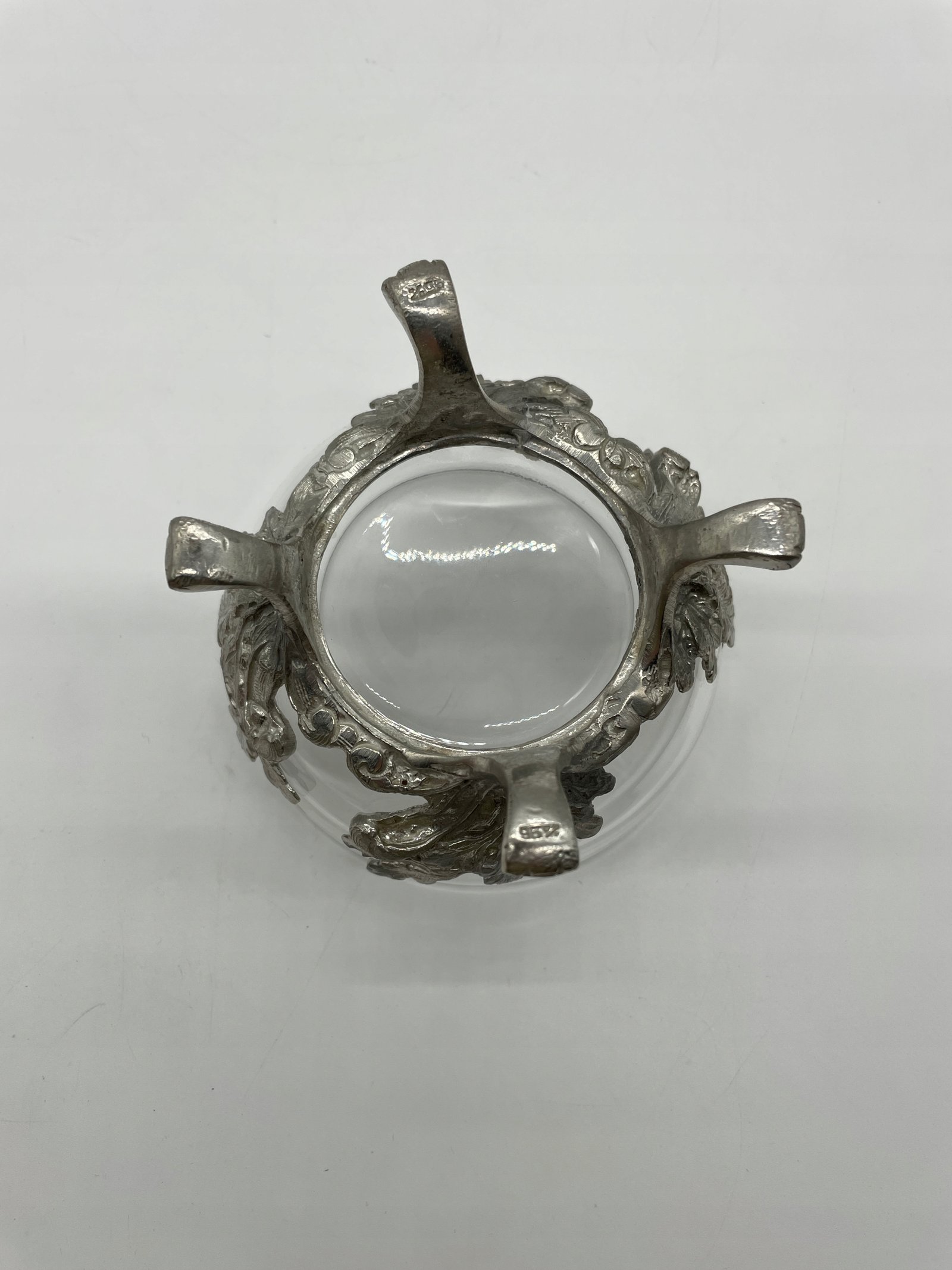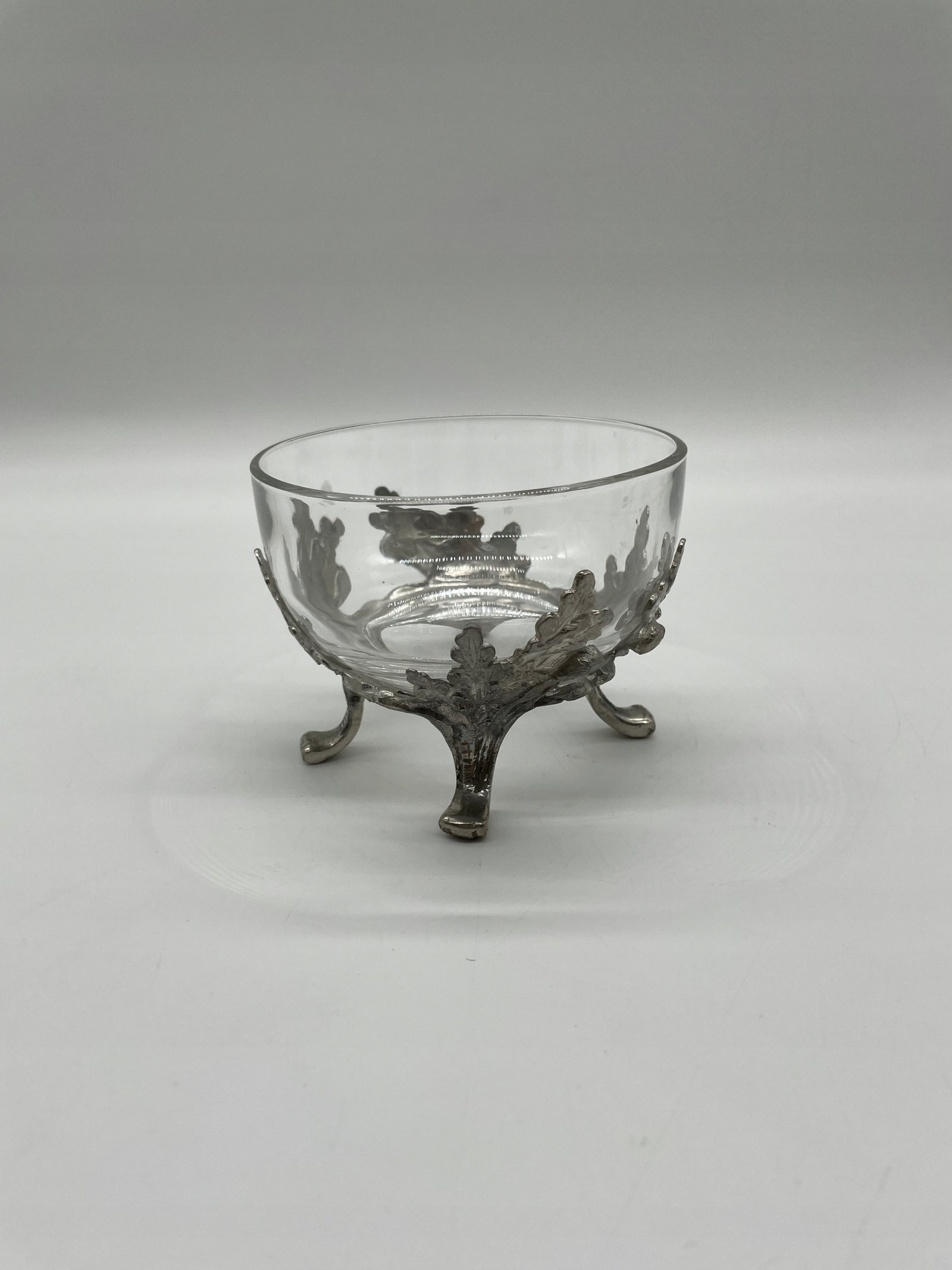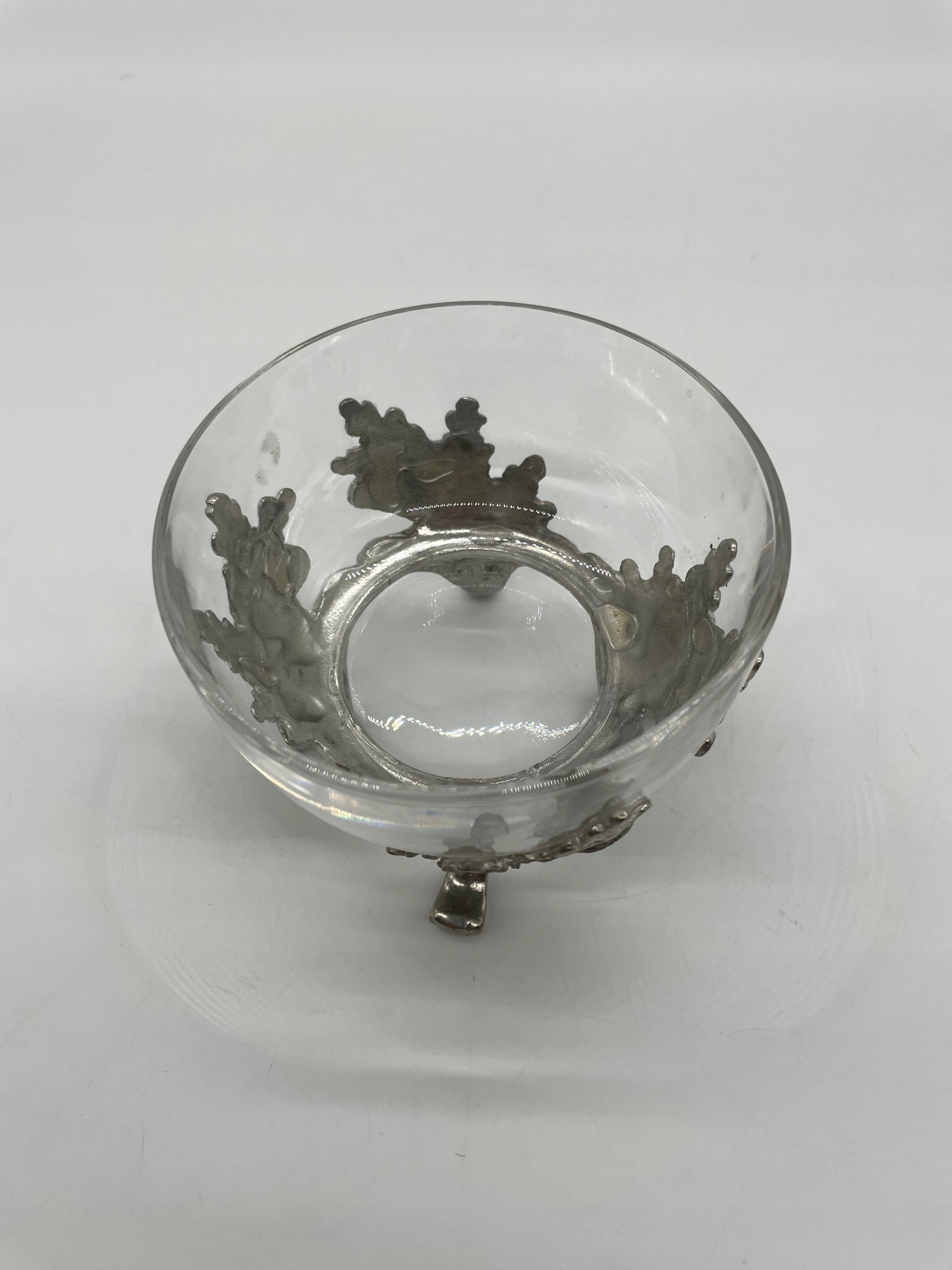 Szklana miseczka na nóżkach z dekoracją, srebro 95%, 8,5×11 cm