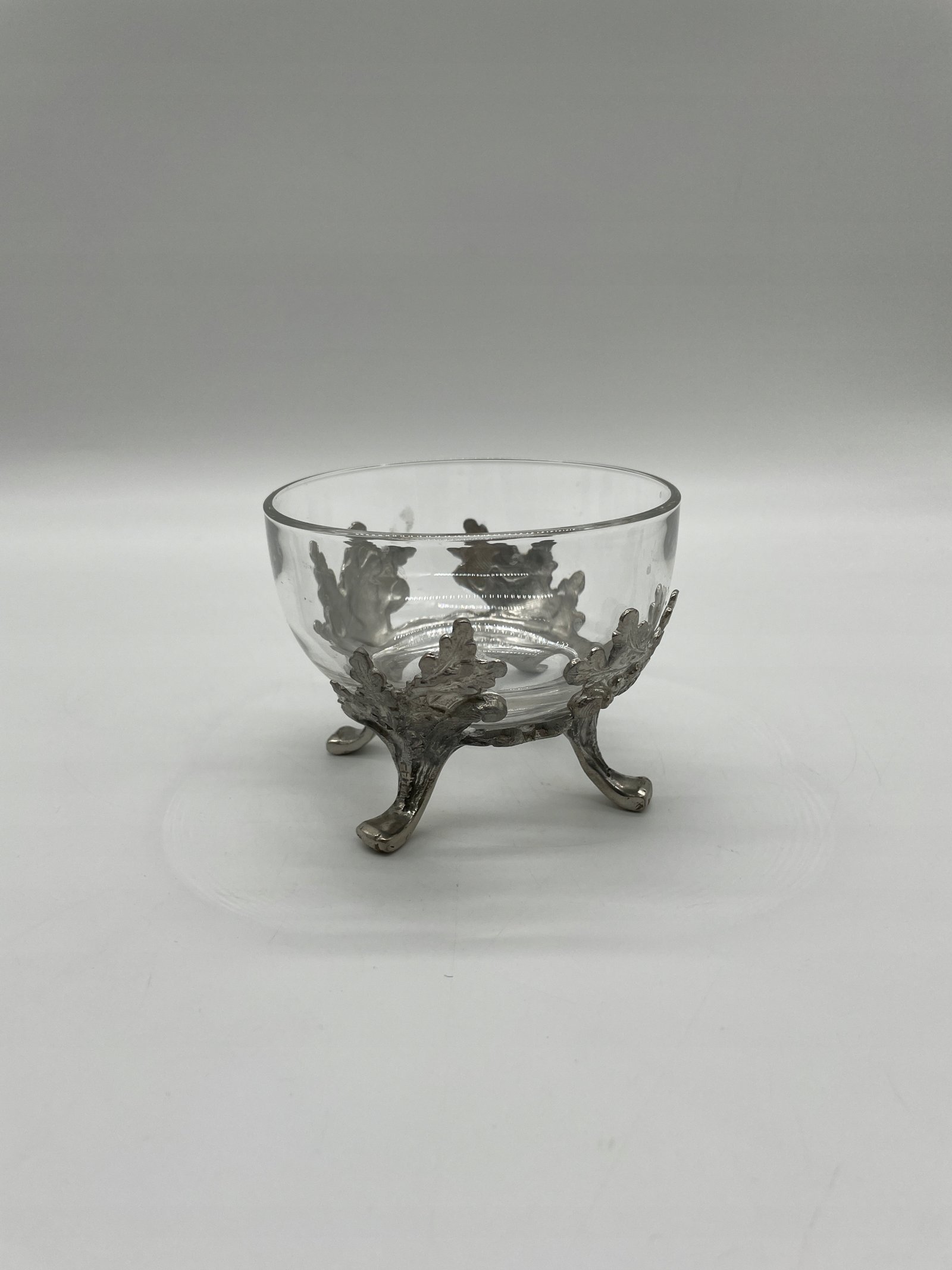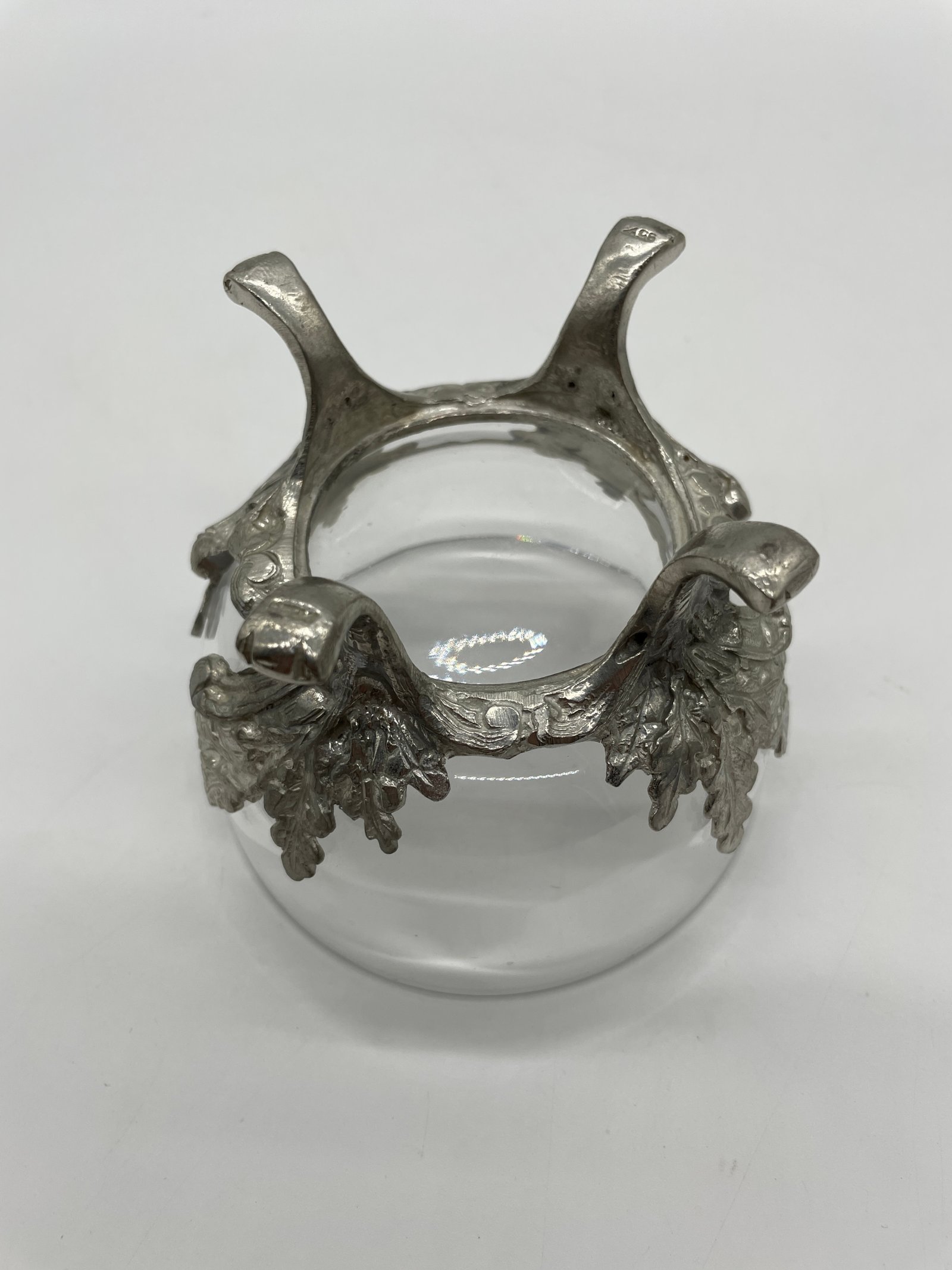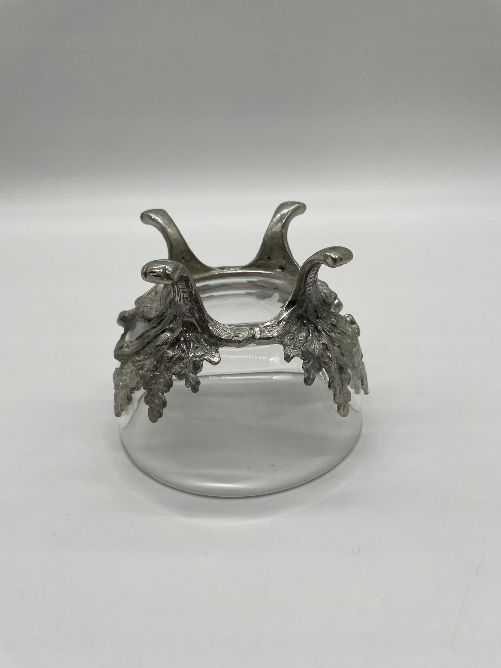 Szklana miseczka na nóżkach z dekoracją, srebro 95%, 8,5×11 cm