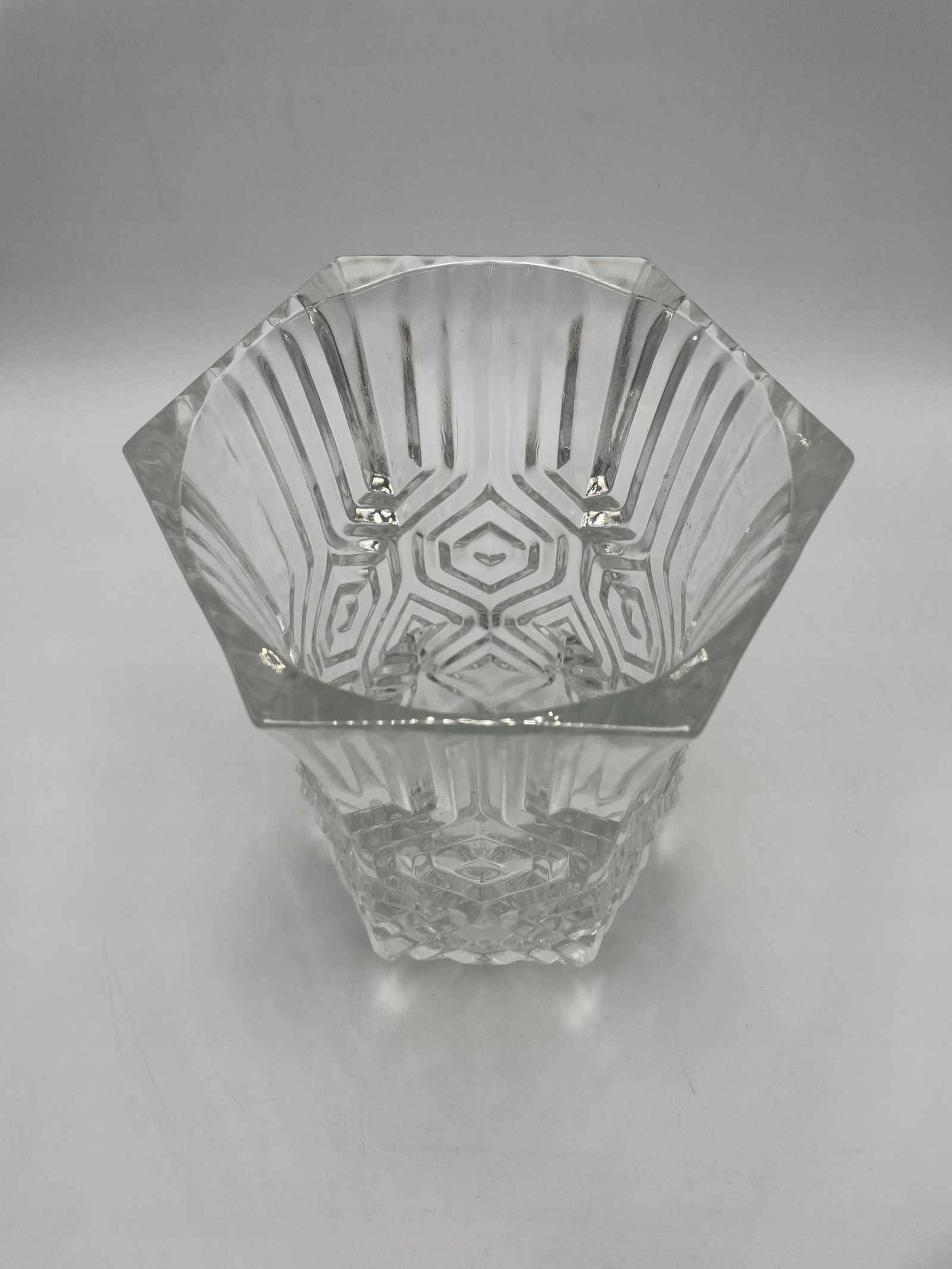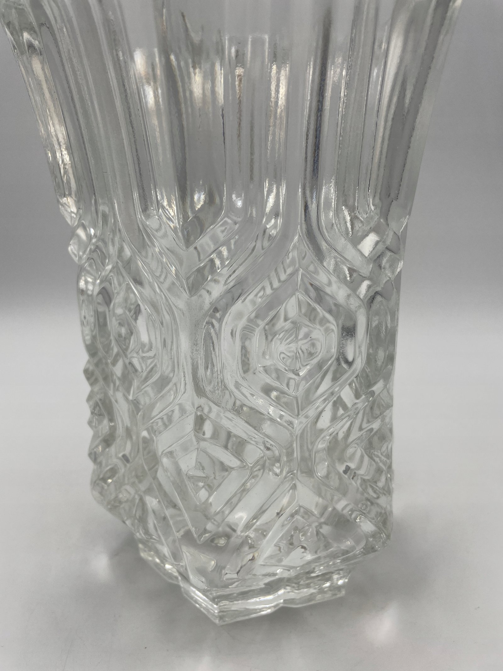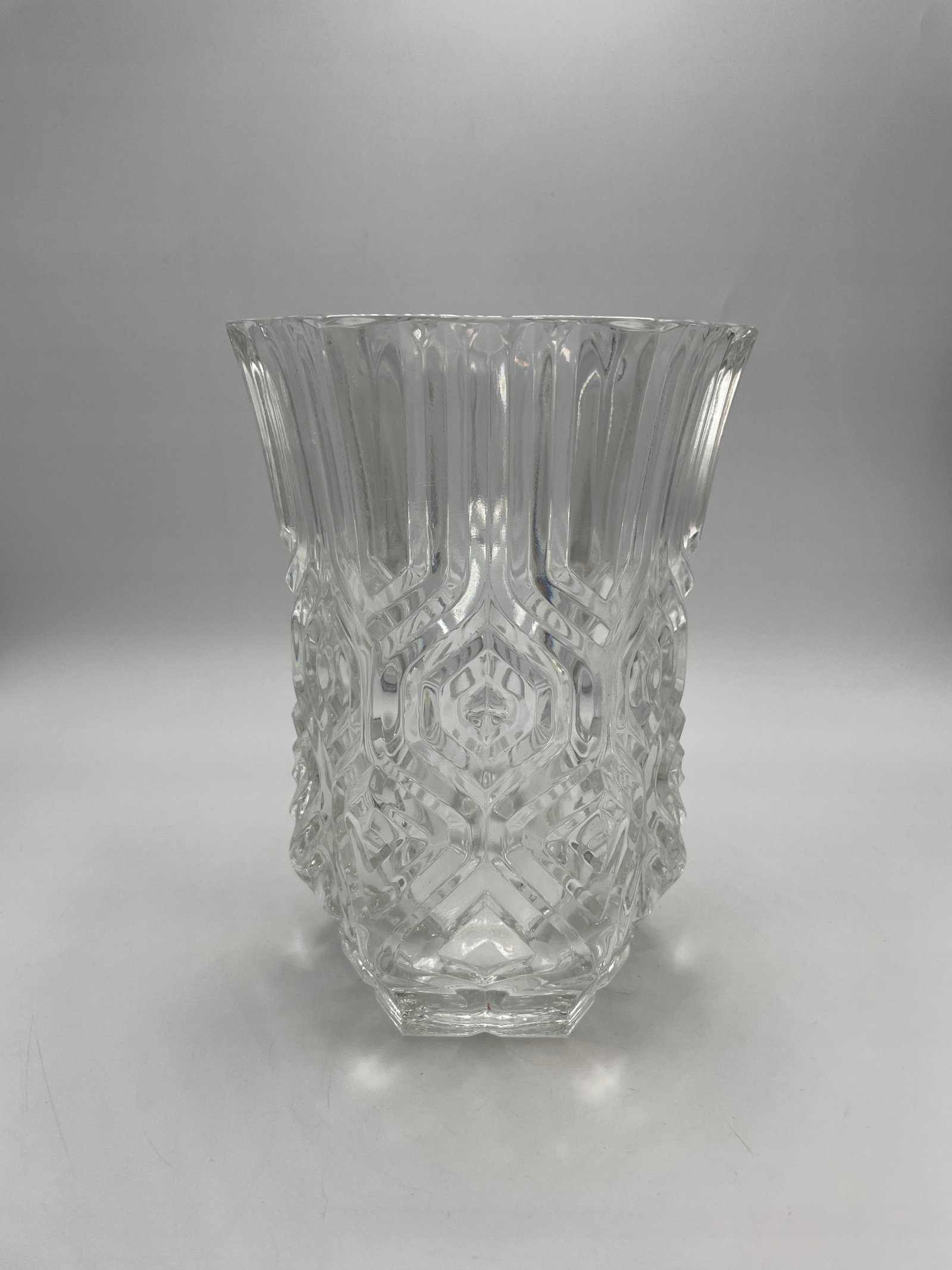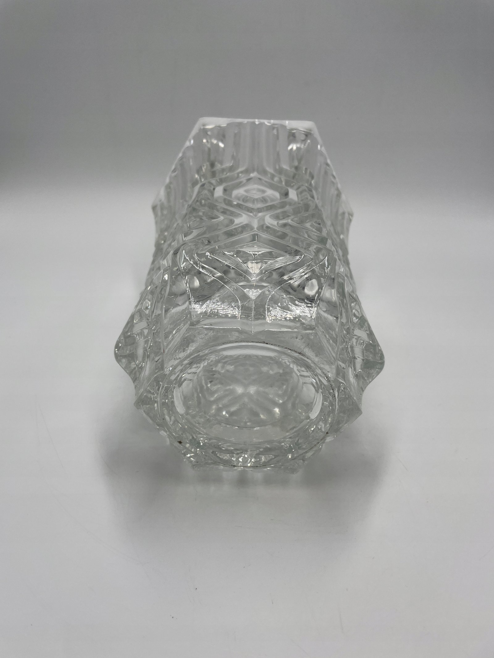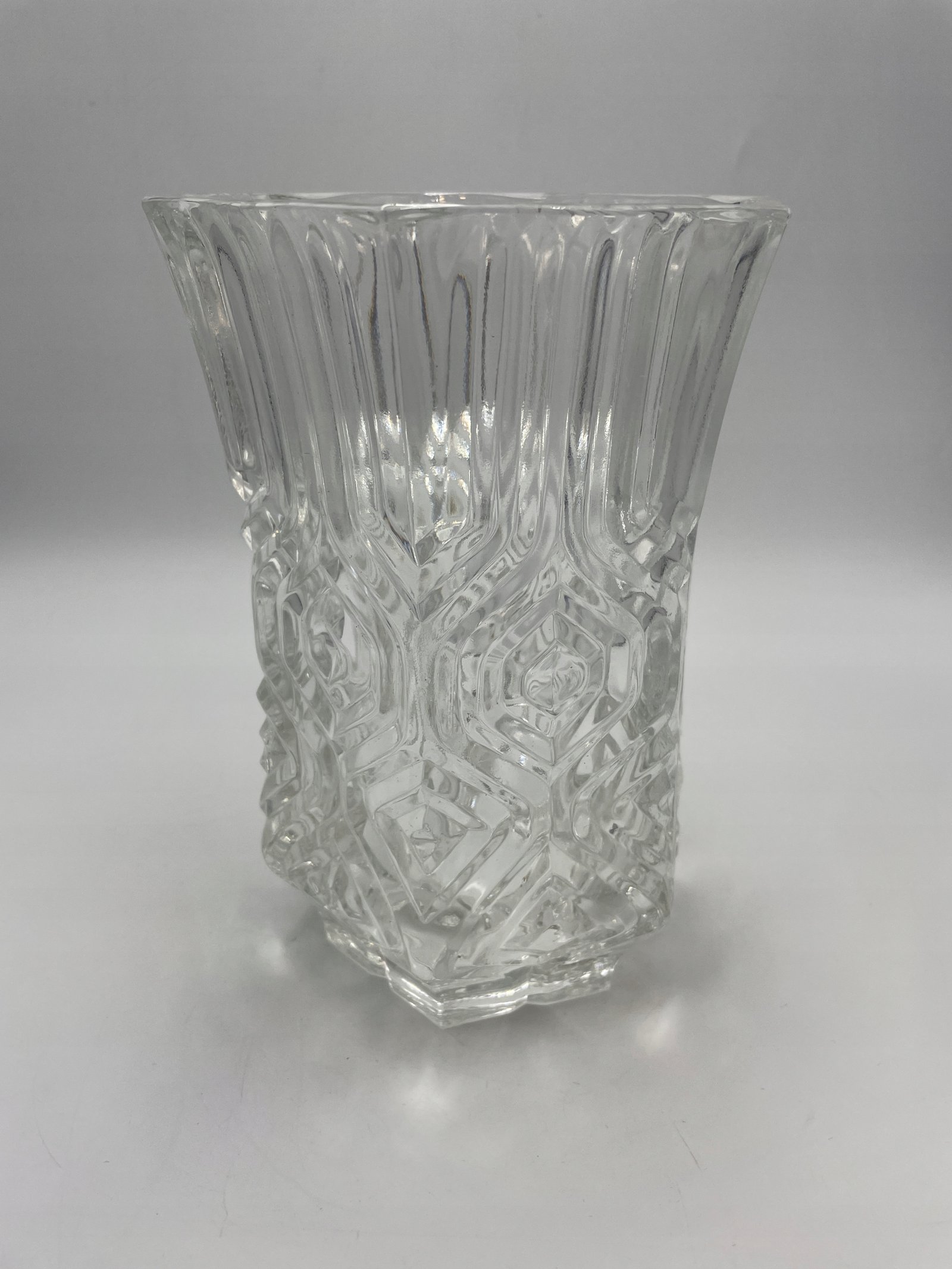 Elegancka szklana waza o wyjątkowym, geometrycznym wzorze. Przezroczyste szkło o bogatej strukturze załamuje światło, nadając wazonowi efekt głębi i blasku. Dzięki szerokiemu otwarciu i stabilnej podstawie idealnie nadaje się do kwiatów ciętych lub dekoracyjnych kompozycji.