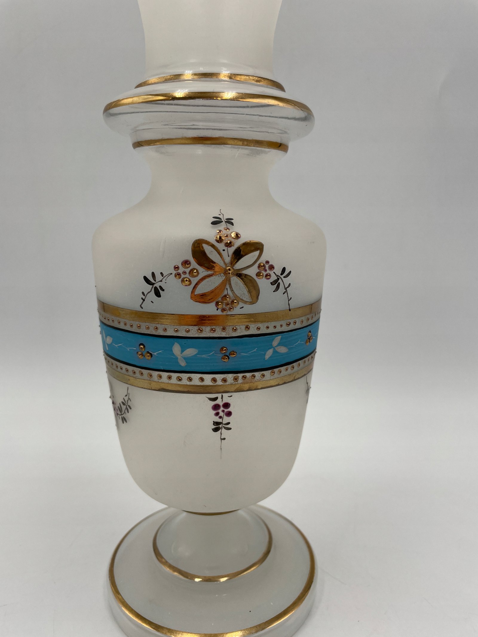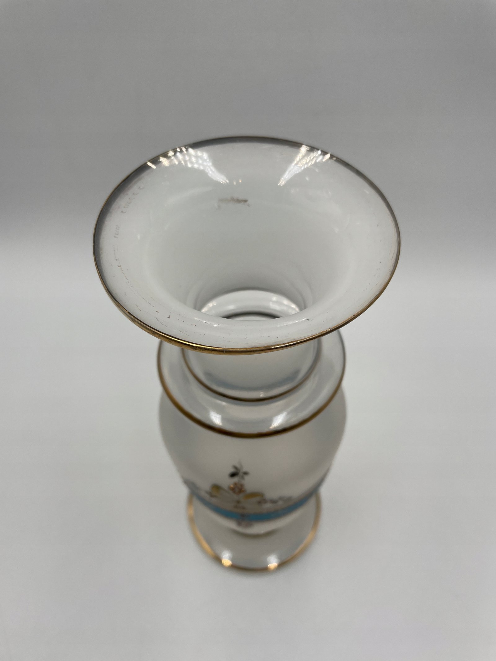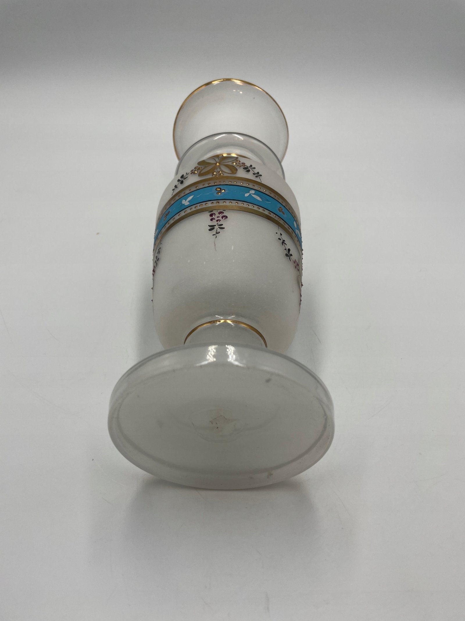Dekoracyjny wazon ze szkła, wysokość 24 cm, średnica 8,5 cm. Wazon wykonany jest z delikatnego szkła ozdobionego ręcznie malowanymi motywami kwiatowymi oraz ornamentem w odcieniach złota i błękitu. Subtelne zdobienia nadają mu elegancji i klasycznego uroku. Brzegi u góry i u podstawy oraz ozdobny pasek są precyzyjnie zaznaczone złotymi liniami. Piękne wzornictwo i harmonijna kolorystyka sprawiają, że wazon świetnie komponuje się z klasycznymi wnętrzami.