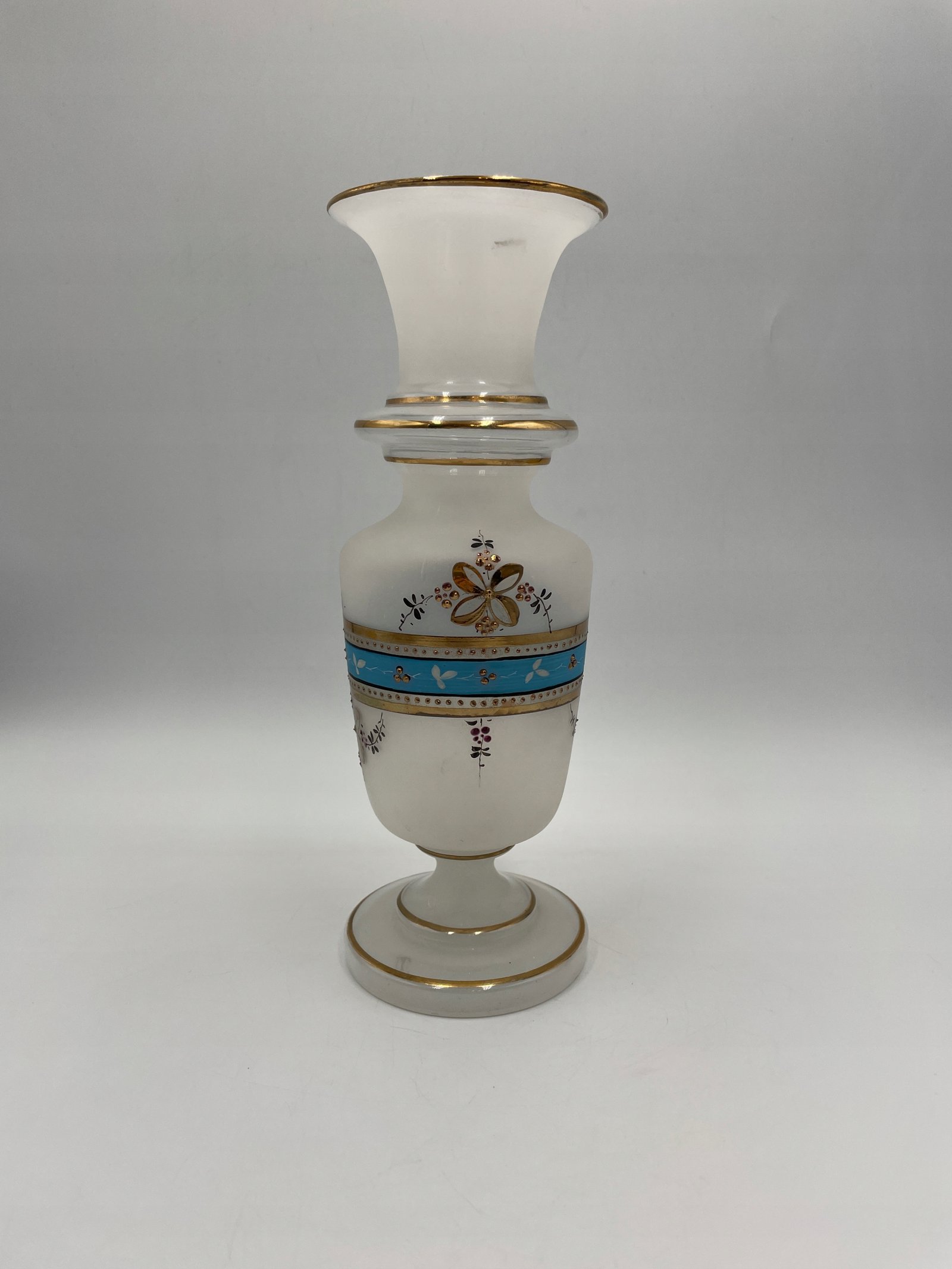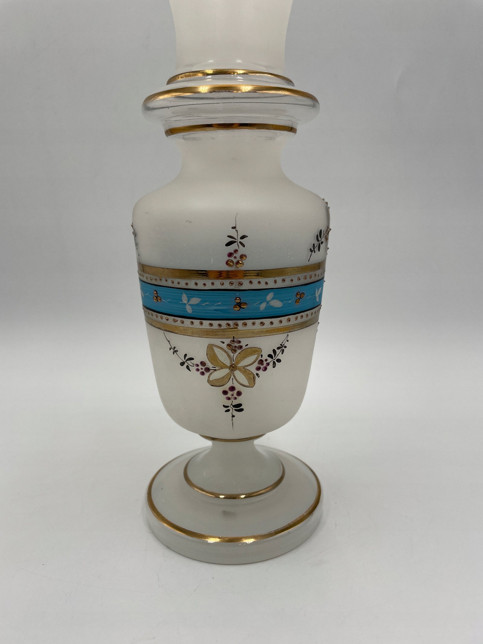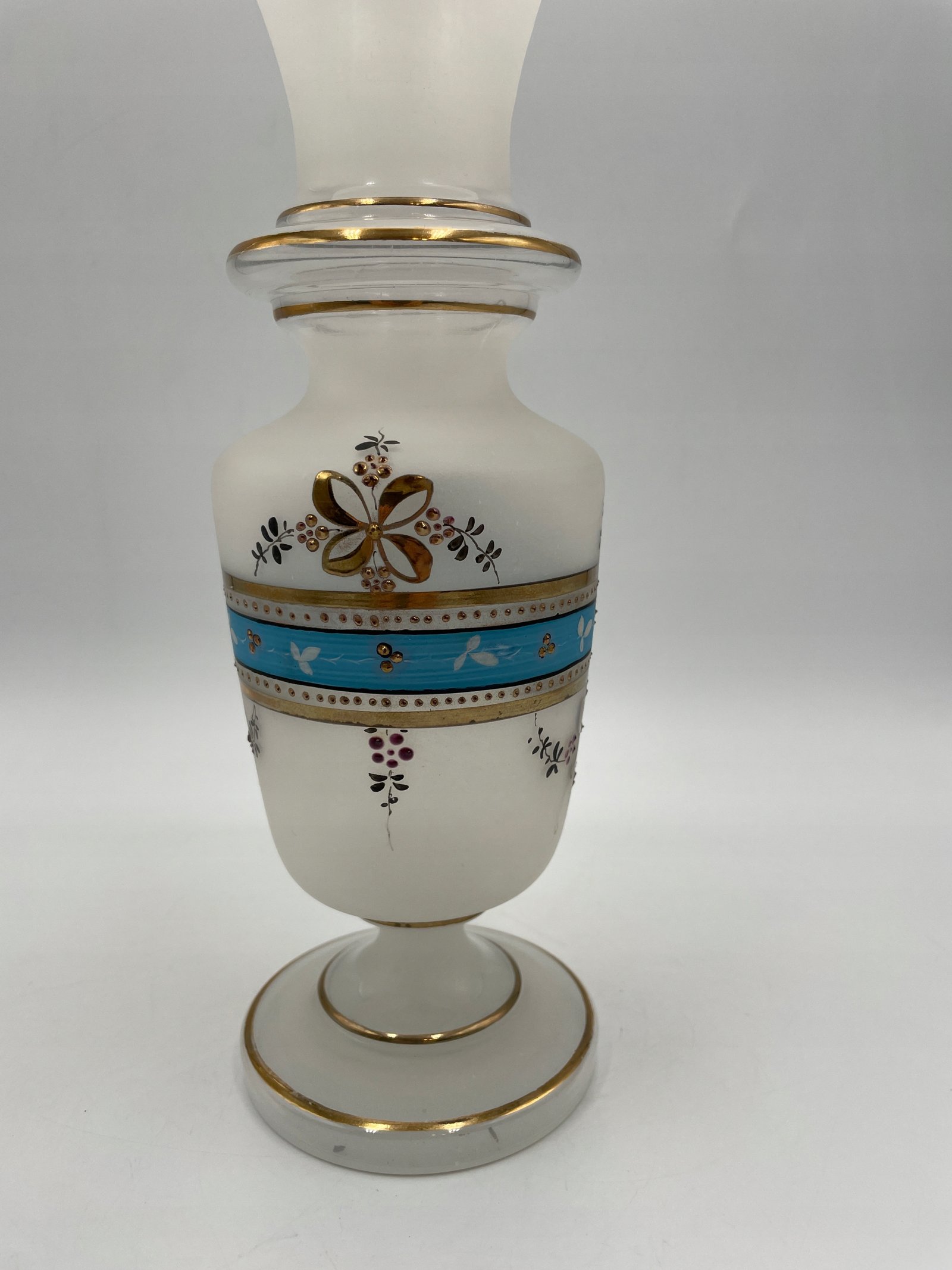 Dekoracyjny wazon ze szkła, wysokość 24 cm, średnica 8,5 cm. Wazon wykonany jest z delikatnego szkła ozdobionego ręcznie malowanymi motywami kwiatowymi oraz ornamentem w odcieniach złota i błękitu. Subtelne zdobienia nadają mu elegancji i klasycznego uroku. Brzegi u góry i u podstawy oraz ozdobny pasek są precyzyjnie zaznaczone złotymi liniami. Piękne wzornictwo i harmonijna kolorystyka sprawiają, że wazon świetnie komponuje się z klasycznymi wnętrzami.