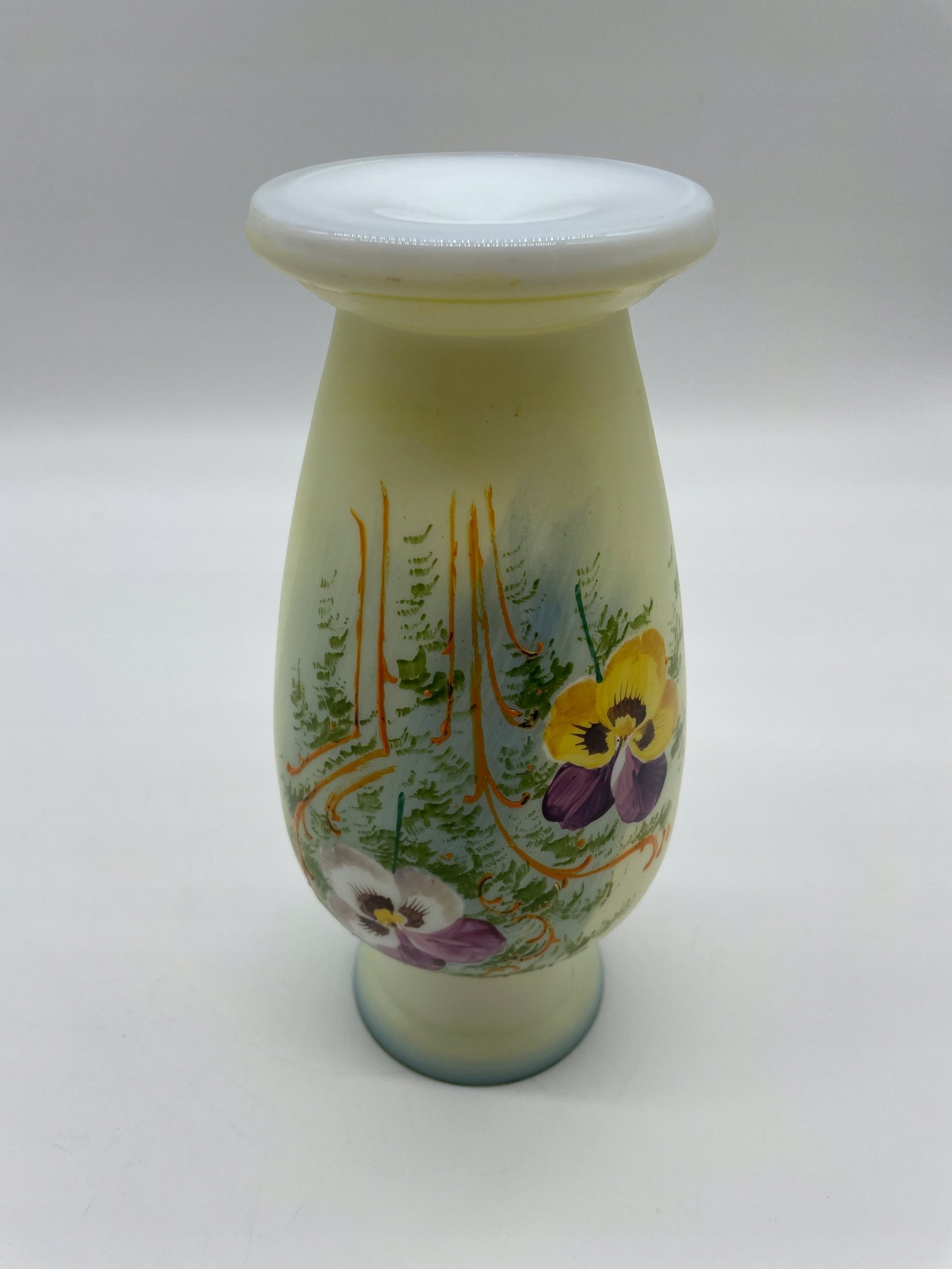 Dekoracyjny wazon wykonany z opalowego szkła, zdobiony ręcznie malowanym motywem bratków. Subtelna pastelowa kolorystyka z zielonymi i pomarańczowymi detalami roślinnymi. Klasyczny kształt z rozszerzającą się górą i stabilną podstawą. Wysokość: 22 cm, szerokość: 9 cm.