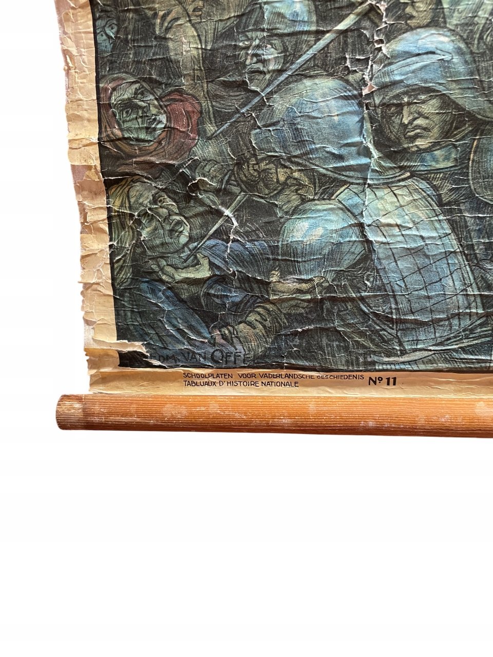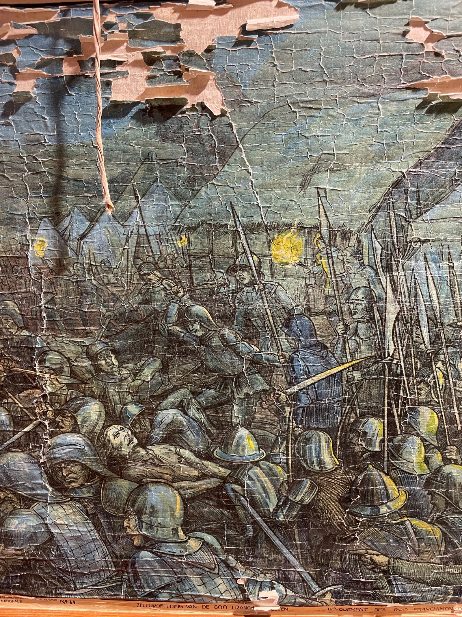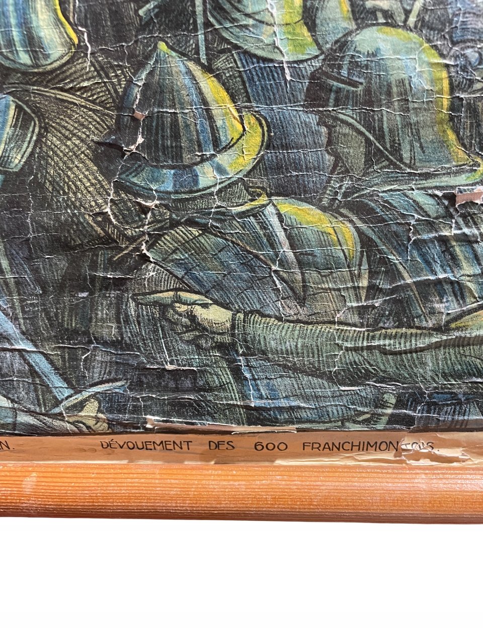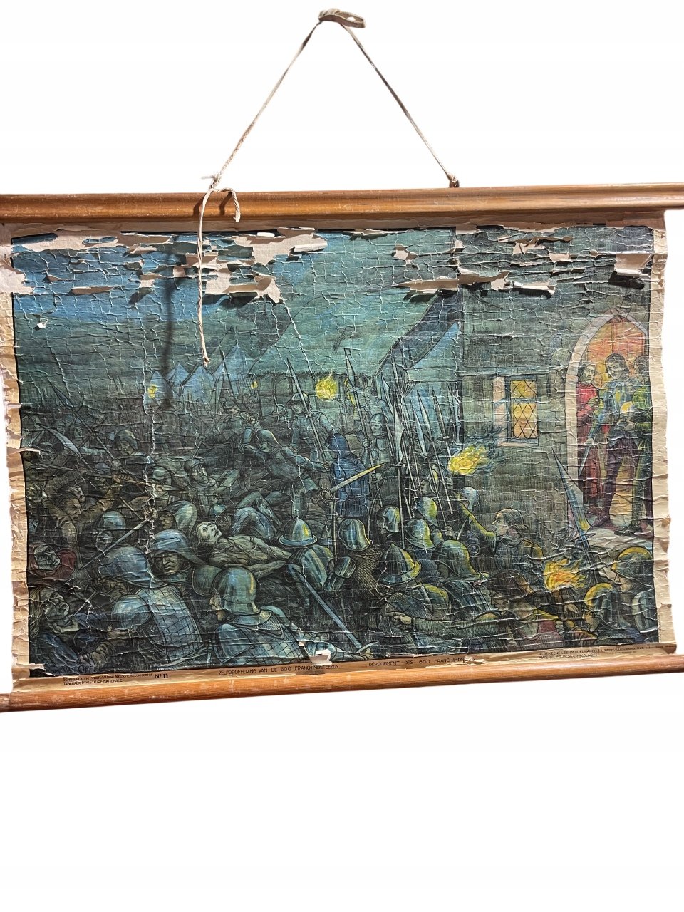 Na zdjęciu widoczny jest belgijski szkolny plakat dydaktyczny z serii historycznej zatytułowany „Dévouement des 600 Franchimontois” („Poświęcenie 600 mieszkańców Franchimont”). Przedstawia on scenę z historii Belgii z XV wieku, kiedy obywatele miasta Franchimont podjęli rozpaczliwą próbę oporu wobec wojsk księcia Burgundii. Plakat został wydany przez J. Baert-Vandermarliere, Schaarbeek (Bruksela), w ramach cyklu „Tablaux d’histoire nationale”, nr 11. Kompozycja pełna szczegółów – żołnierze w hełmach, pochodnie, scena bitwy. Stan zachowania słaby: liczne pęknięcia papieru, ubytki farby i widoczne ślady zniszczeń.