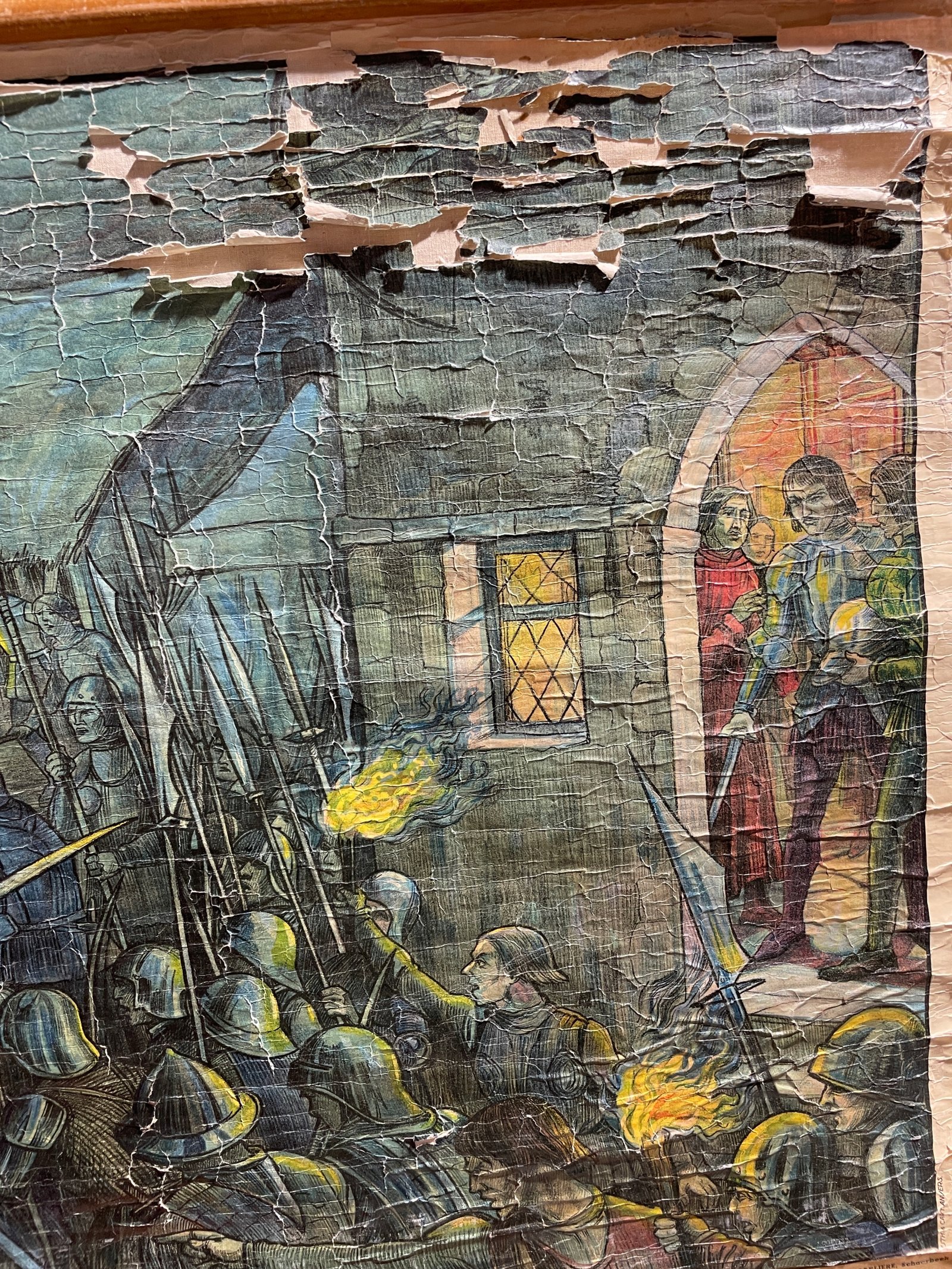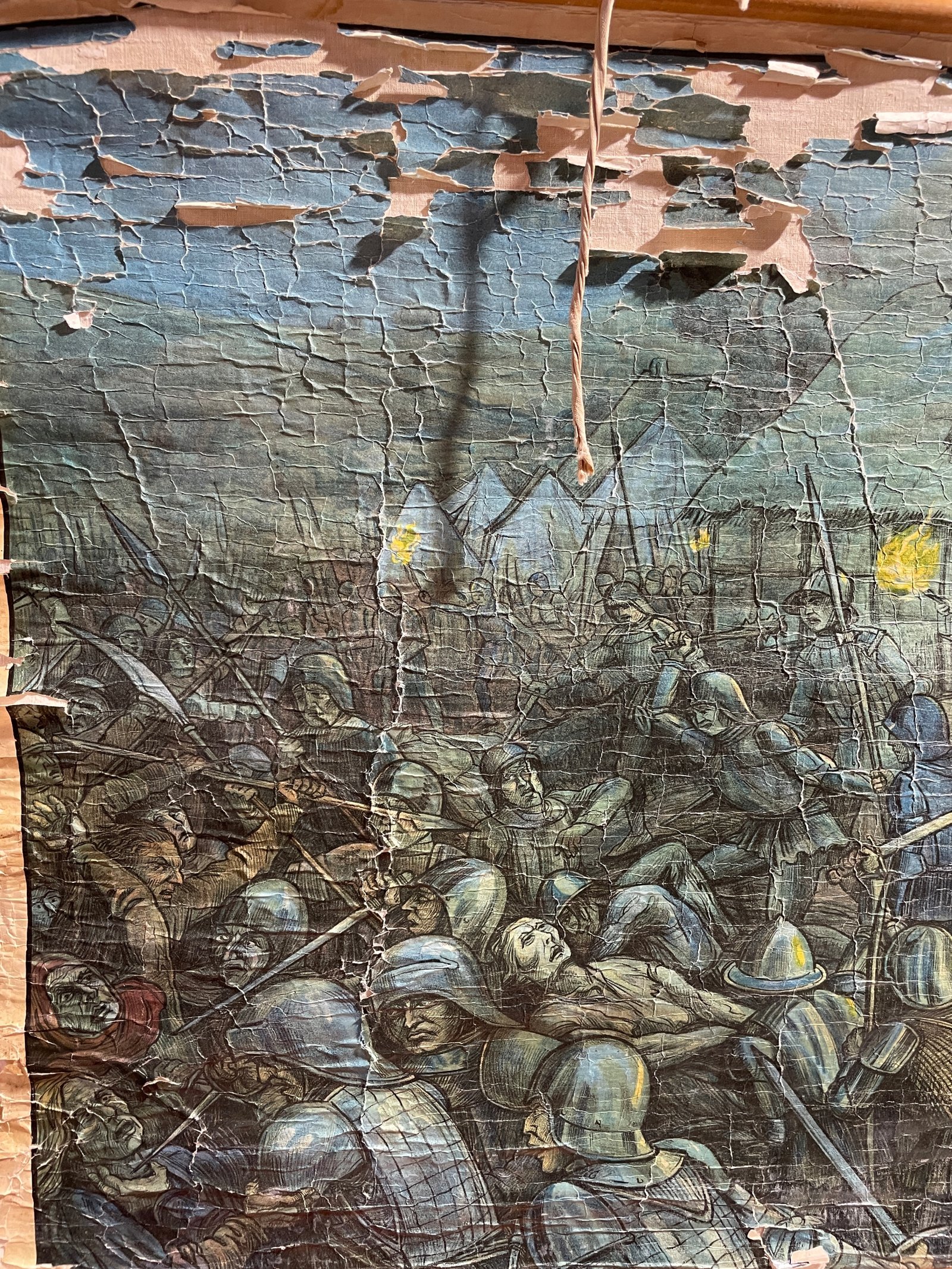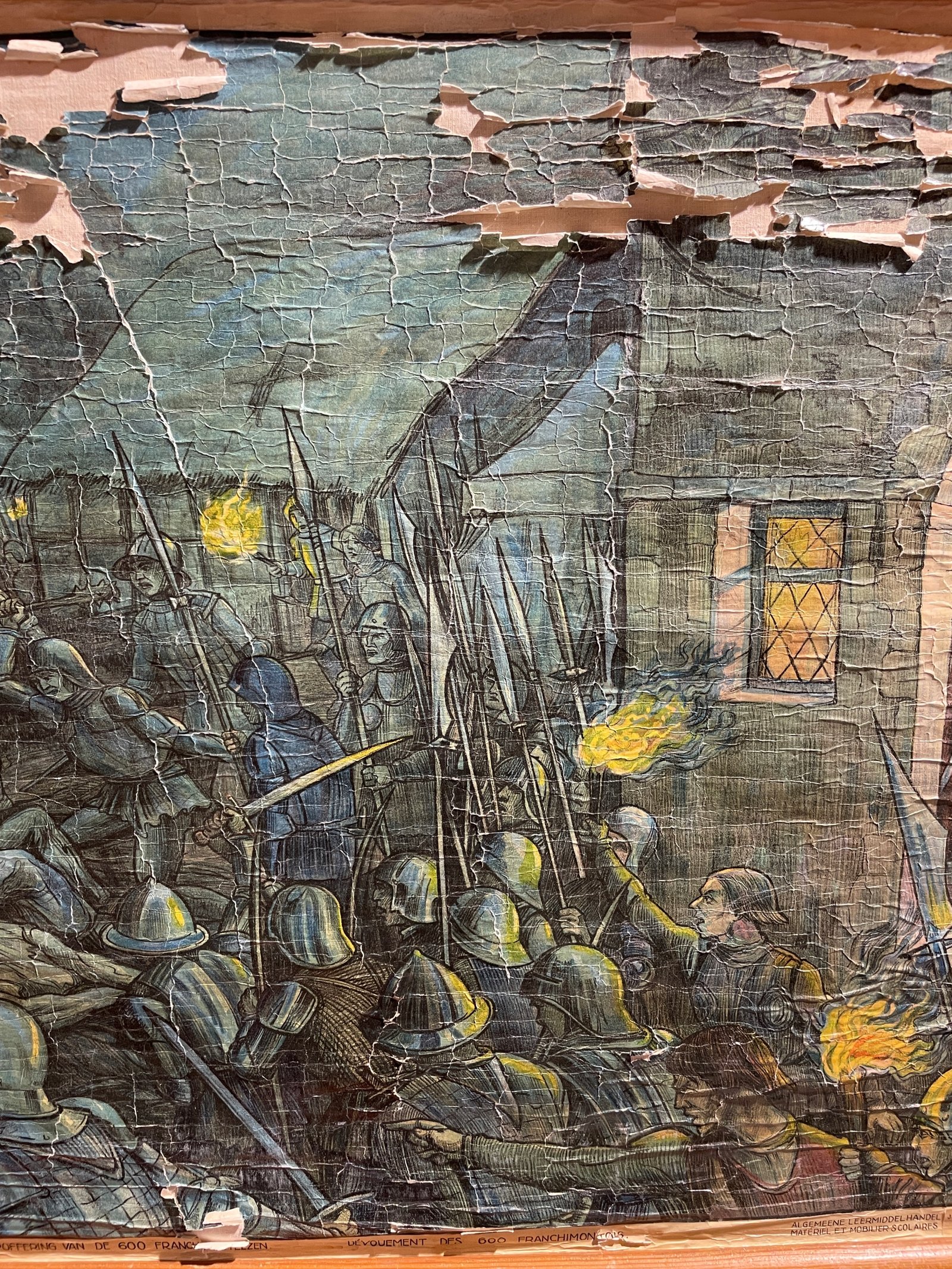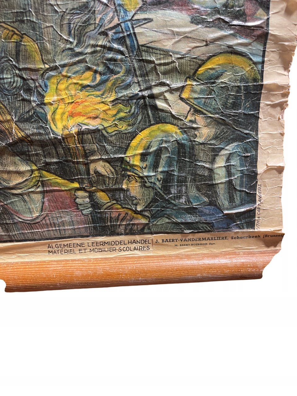 Na zdjęciu widoczny jest belgijski szkolny plakat dydaktyczny z serii historycznej zatytułowany „Dévouement des 600 Franchimontois” („Poświęcenie 600 mieszkańców Franchimont”). Przedstawia on scenę z historii Belgii z XV wieku, kiedy obywatele miasta Franchimont podjęli rozpaczliwą próbę oporu wobec wojsk księcia Burgundii. Plakat został wydany przez J. Baert-Vandermarliere, Schaarbeek (Bruksela), w ramach cyklu „Tablaux d’histoire nationale”, nr 11. Kompozycja pełna szczegółów – żołnierze w hełmach, pochodnie, scena bitwy. Stan zachowania słaby: liczne pęknięcia papieru, ubytki farby i widoczne ślady zniszczeń.
