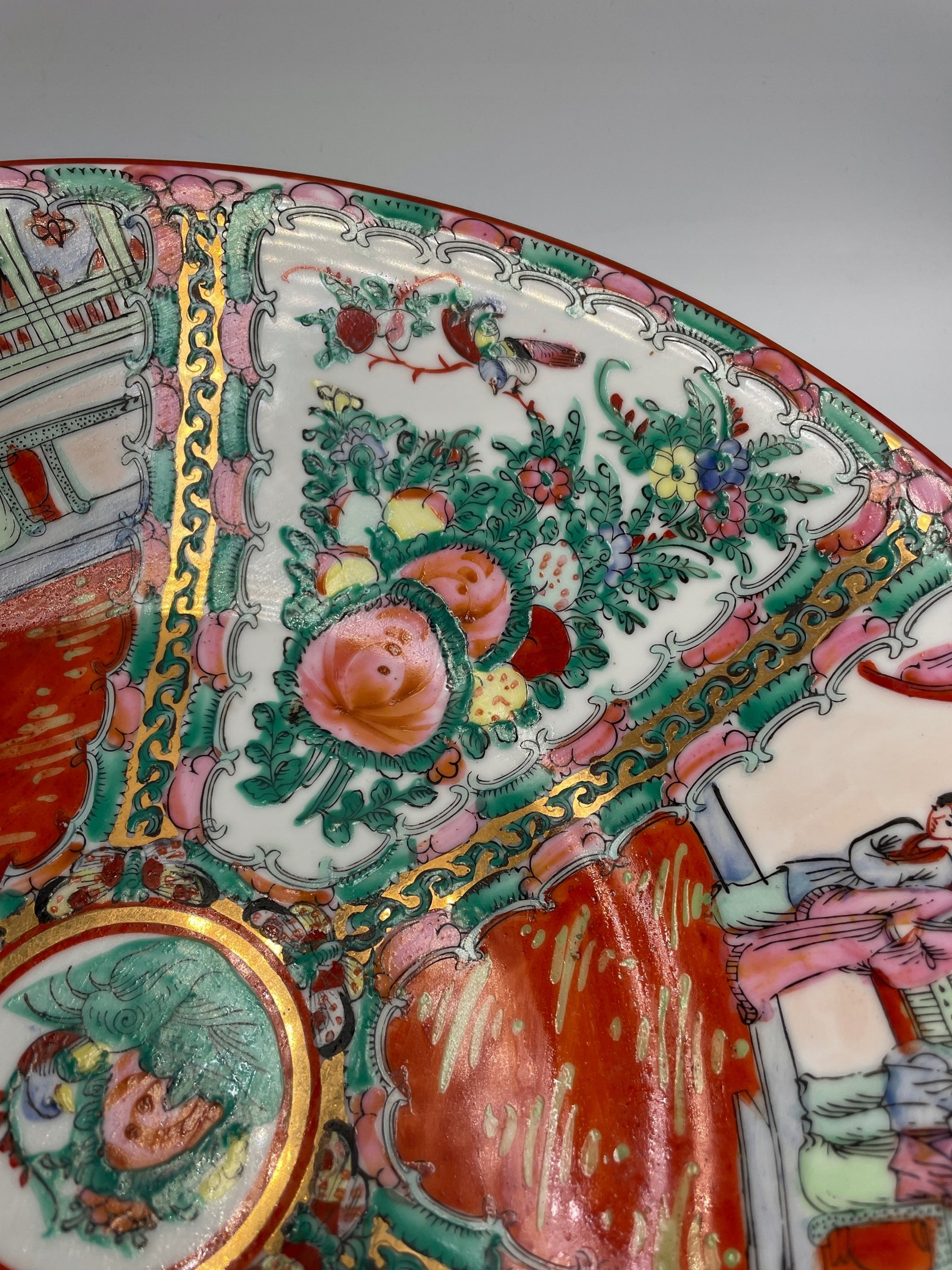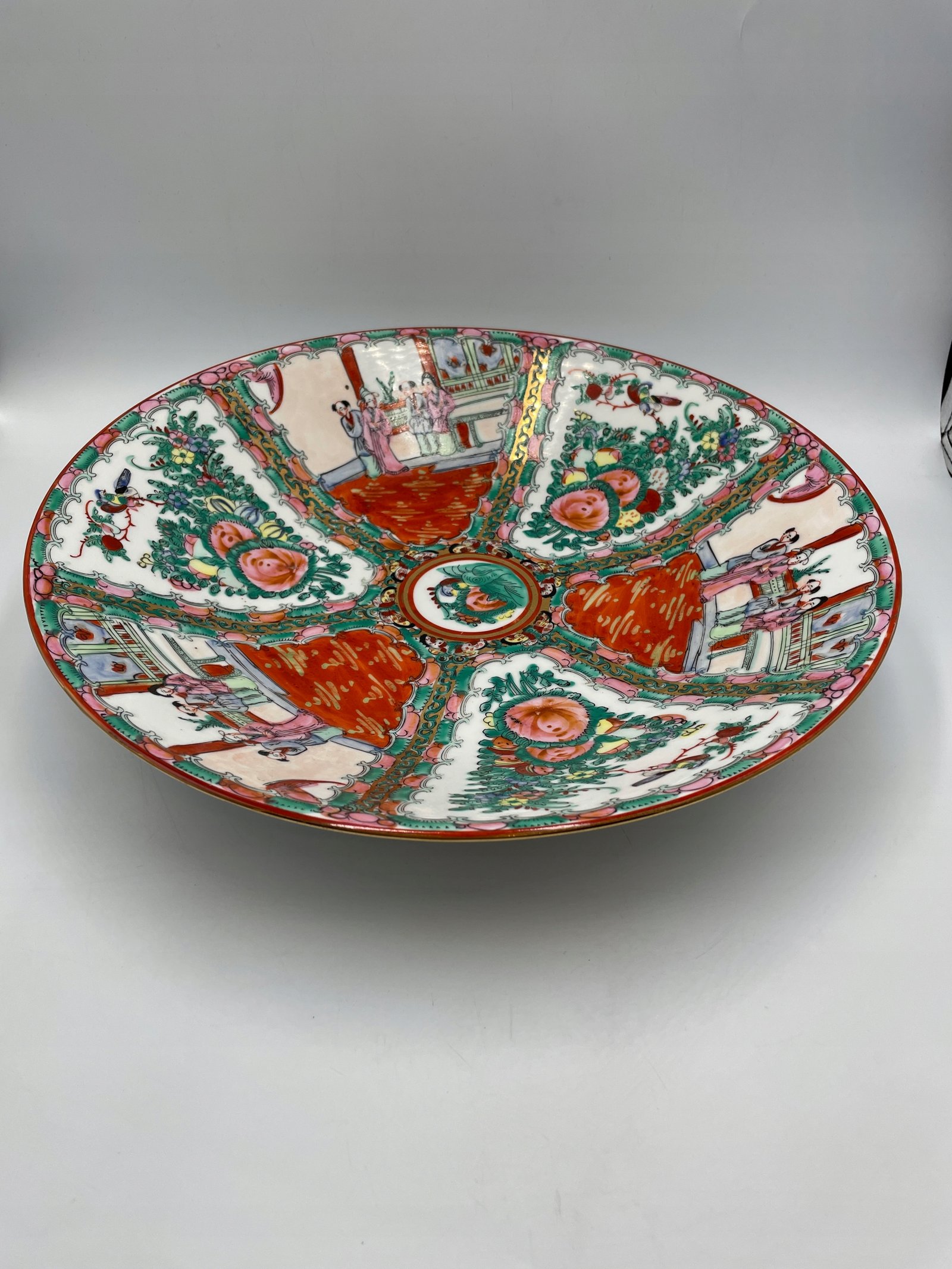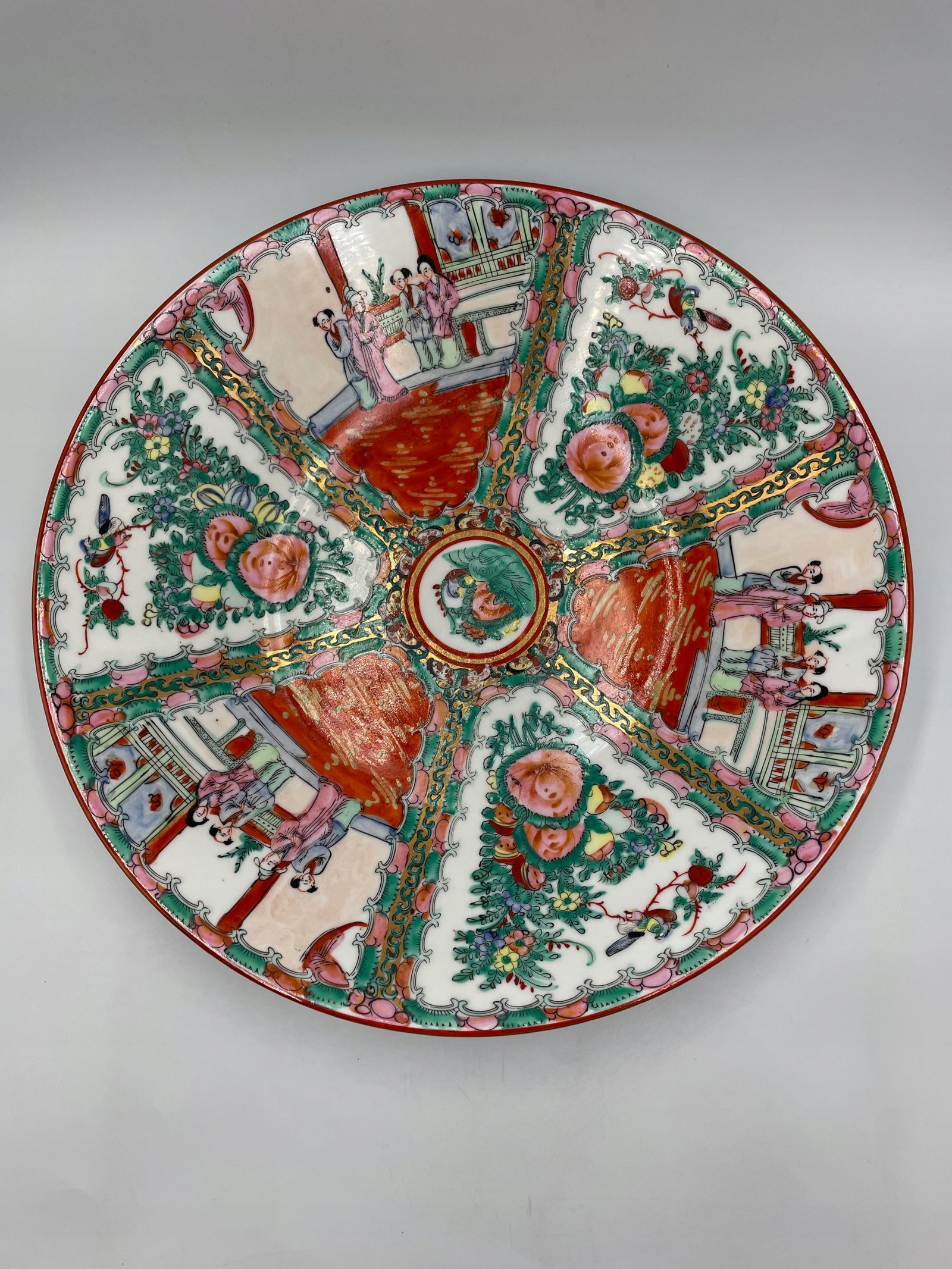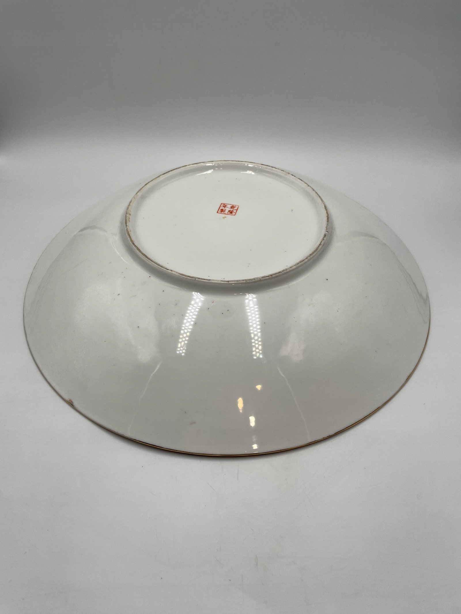 Luksusowy chiński talerz porcelanowy z ręcznie malowanymi motywami w stylu „Famille Rose” (Różowa Rodzina). Średnica talerza wynosi 36 cm, a wysokość — 7 cm.
