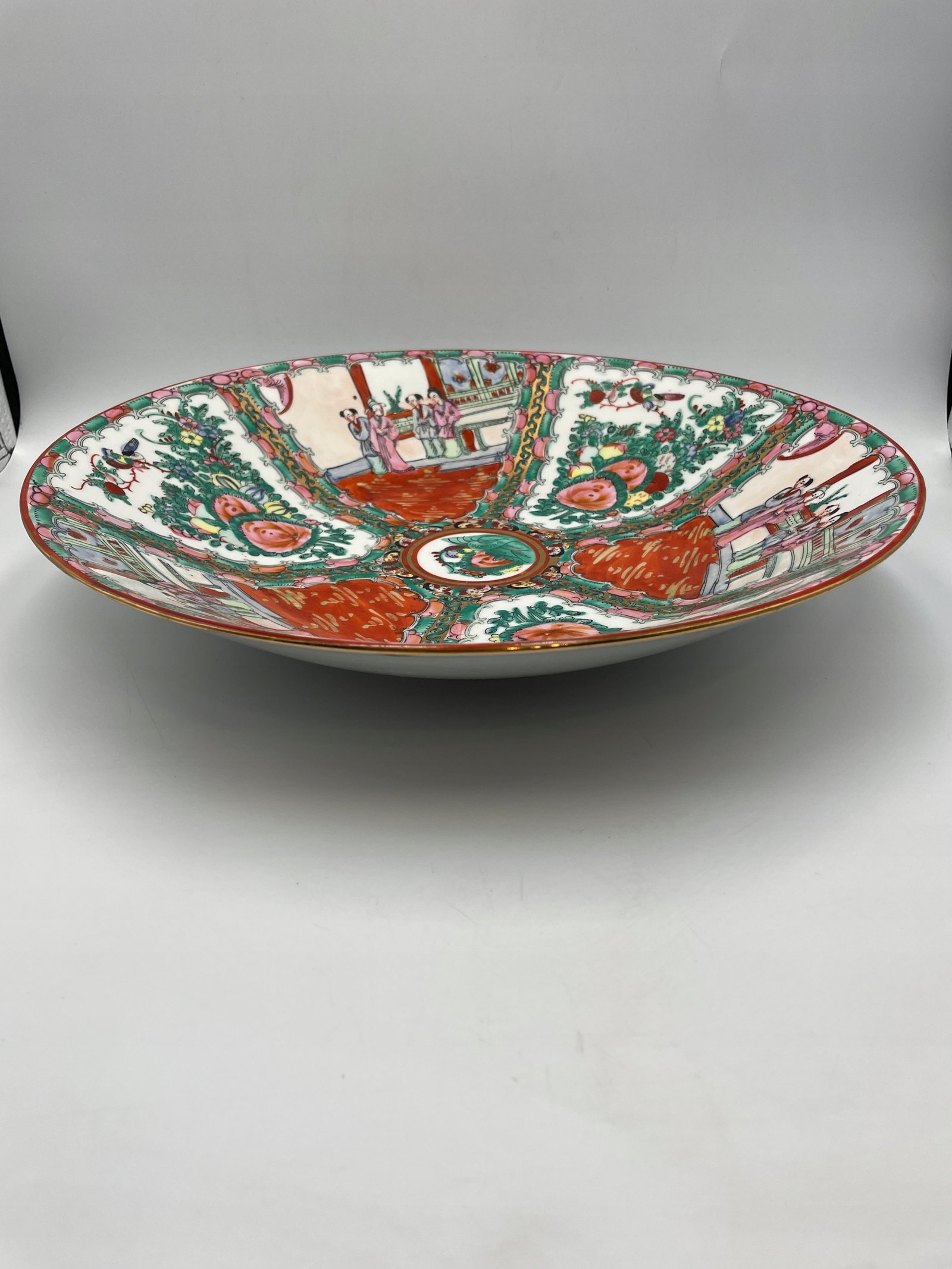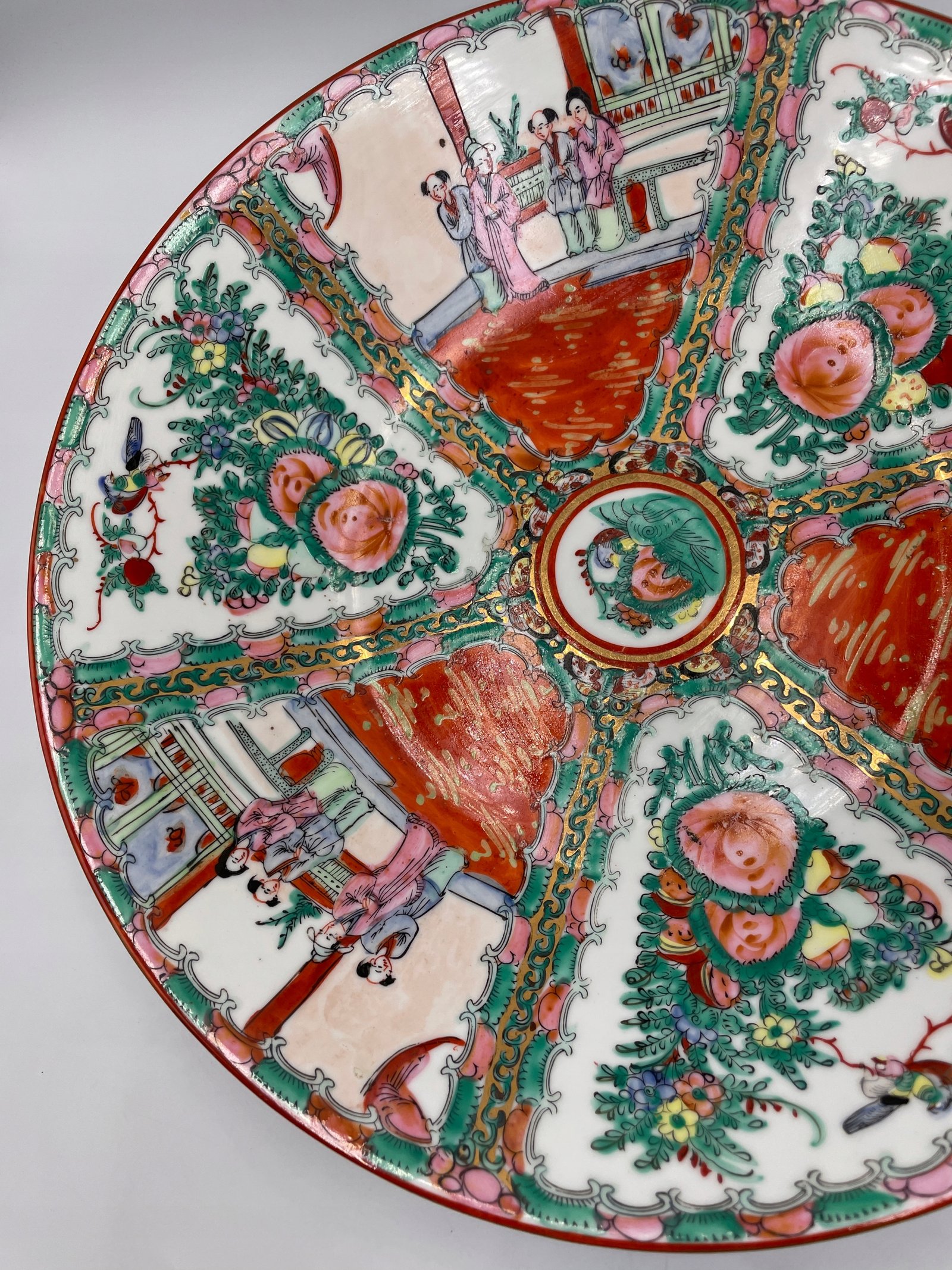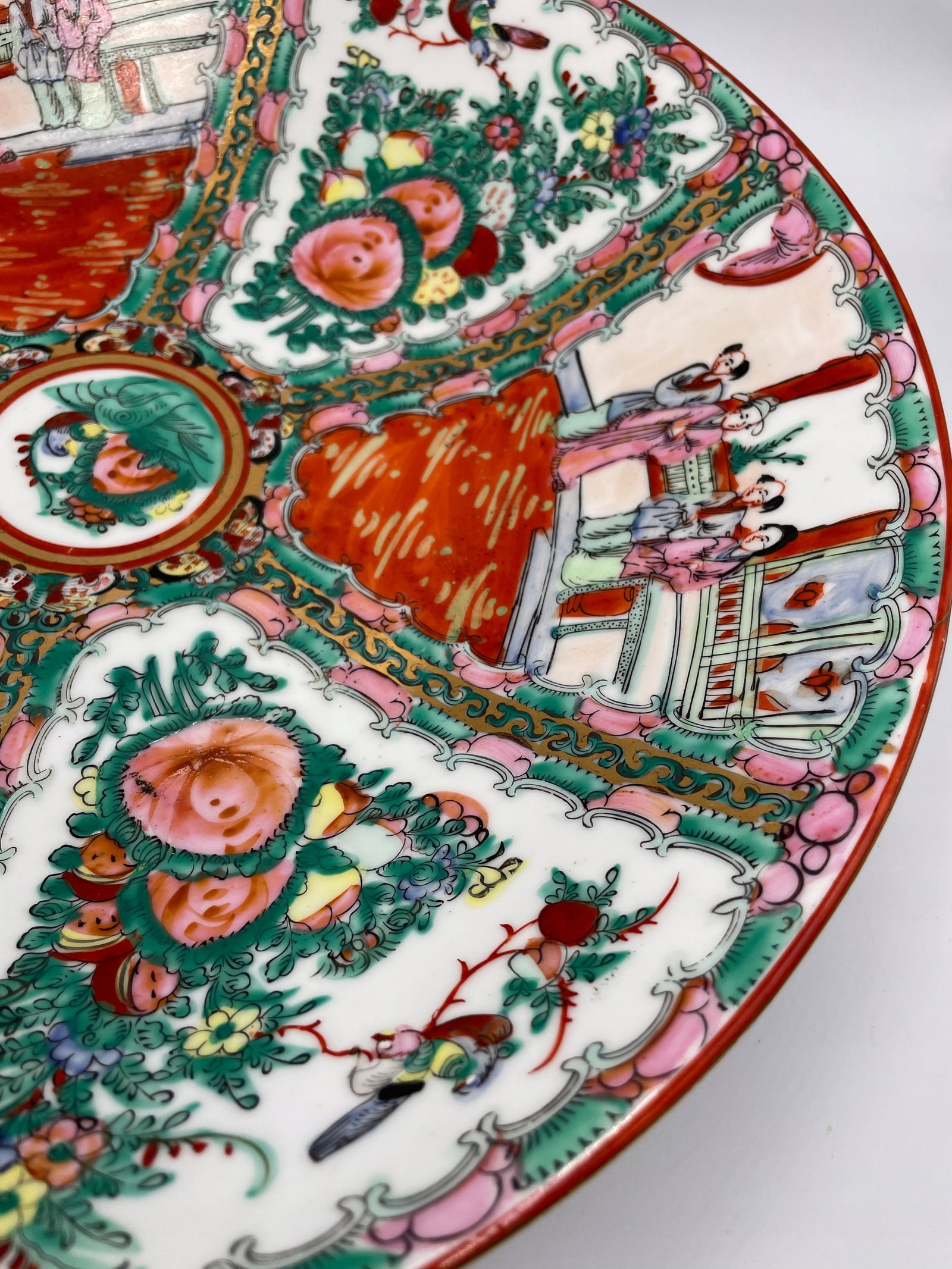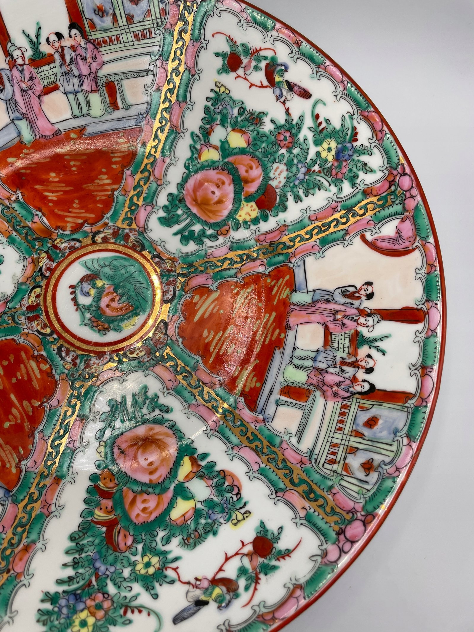 Luksusowy chiński talerz porcelanowy z ręcznie malowanymi motywami w stylu „Famille Rose” (Różowa Rodzina). Średnica talerza wynosi 36 cm, a wysokość — 7 cm.