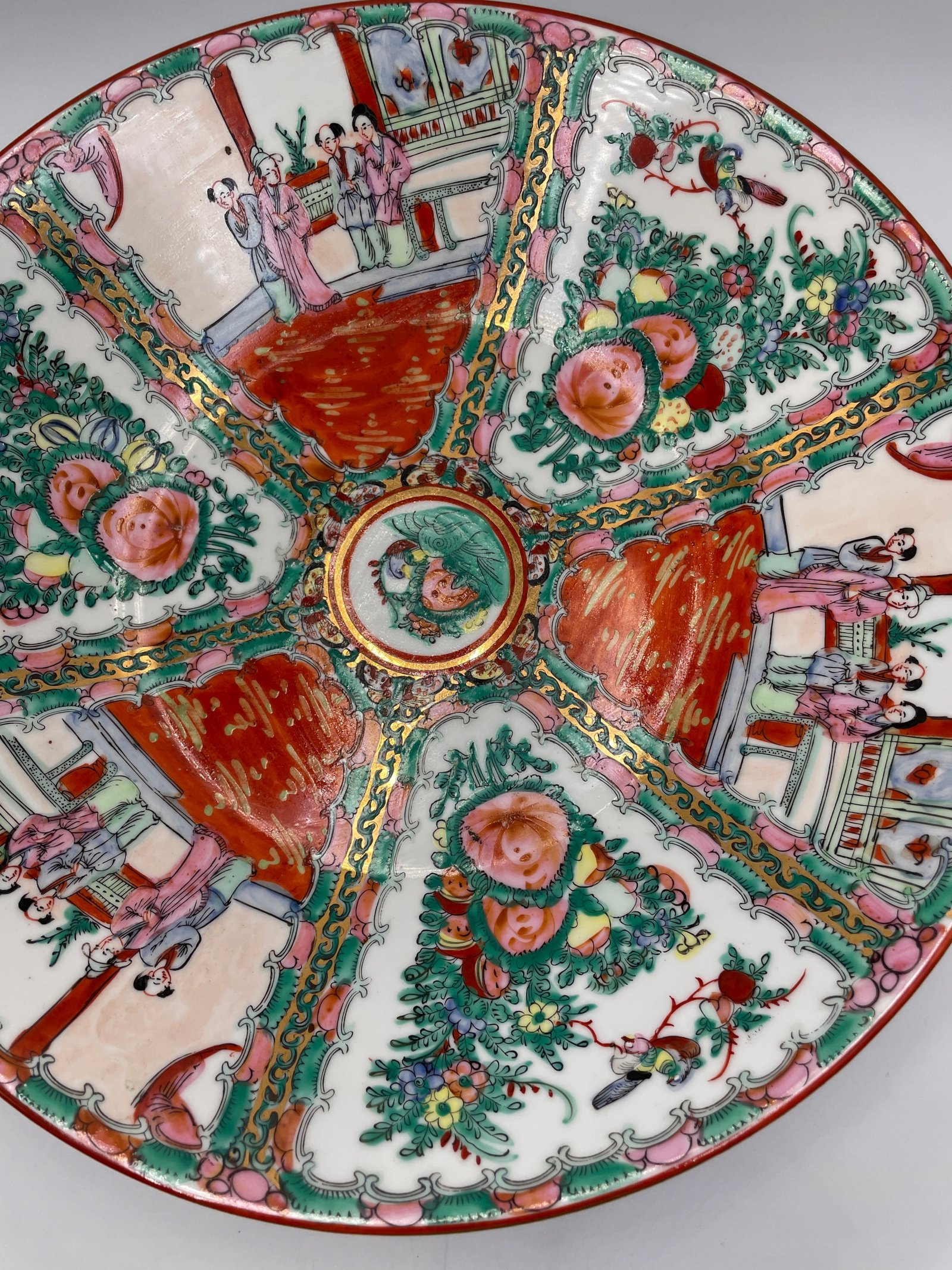 Talerz ozdobiony jest finezyjnymi scenami z życia chińskiego, motywami kwiatowymi oraz złoconymi elementami, charakterystycznymi dla stylu „Famille Rose”, który był popularny w Chinach od XVIII wieku i pozostaje ceniony do dziś.