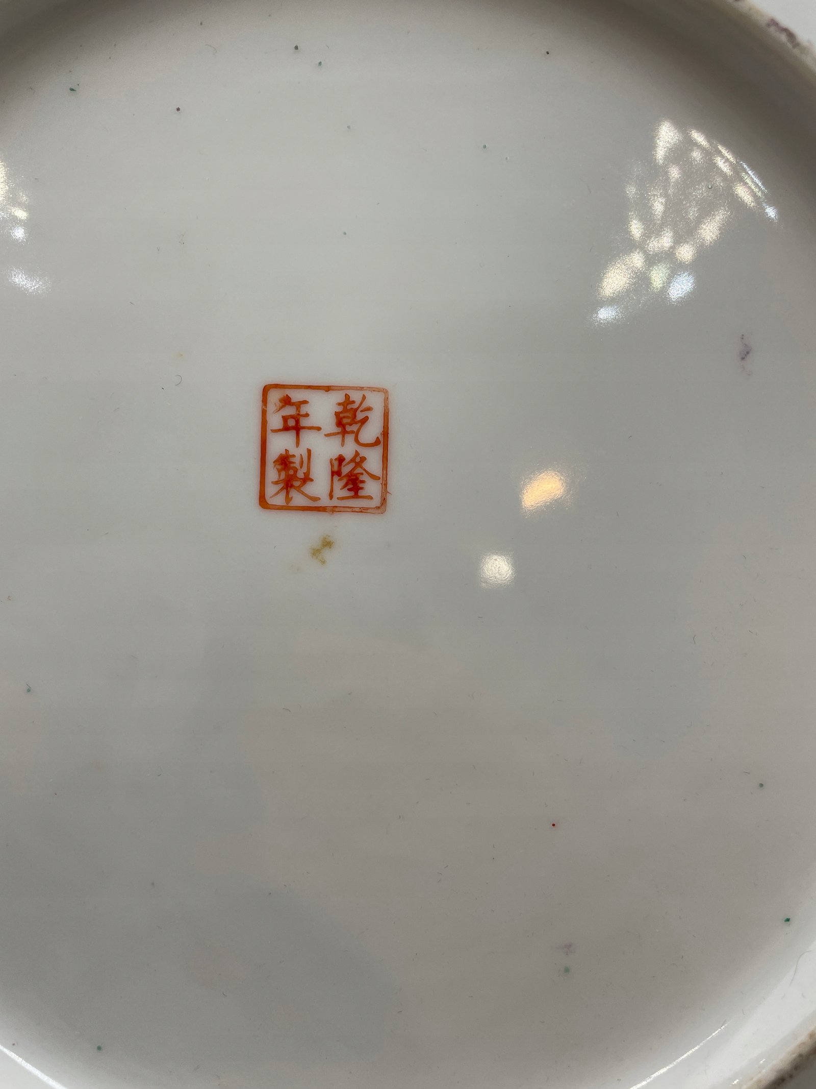 Na odwrocie talerza znajduje się znak „Qianlong Nian Zhi” (乾隆年製), co można przetłumaczyć jako „Wykonane w epoce Qianlong”. Okres panowania cesarza Qianlong (1736–1795) uważany jest za jeden z najlepszych w historii chińskiej porcelany. Należy jednak zaznaczyć, że takie oznaczenie było używane również w późniejszych reprodukcjach, dlatego do precyzyjnego określenia wieku przedmiotu może być konieczna ekspertyza.