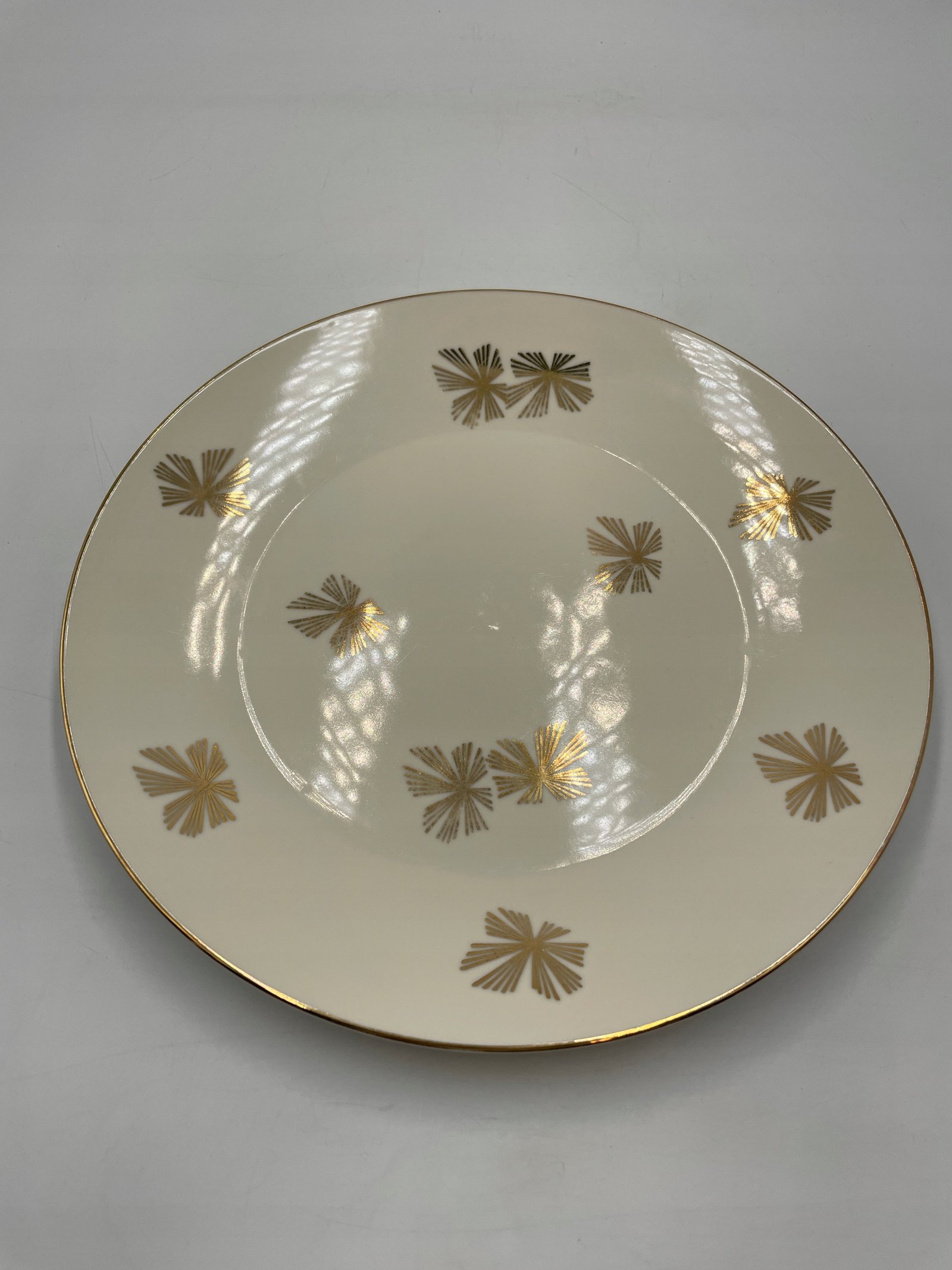 Talerz wykonany jest z porcelany, okrągły, koloru kremowo-białego, zdobiony eleganckim geometrycznym wzorem w złoto-czarnej kolorystyce, przypominającym stylizowane kwiaty. Średnica talerza wynosi 24 cm, głębokość 2,5 cm. Na spodzie posiada oznaczenie producenta „Johann Seltmann Vohenstrauß, Bavaria” oraz numer 2977. Znak producenta wskazuje na pochodzenie wyrobu z regionu Bawarii w Niemczech.