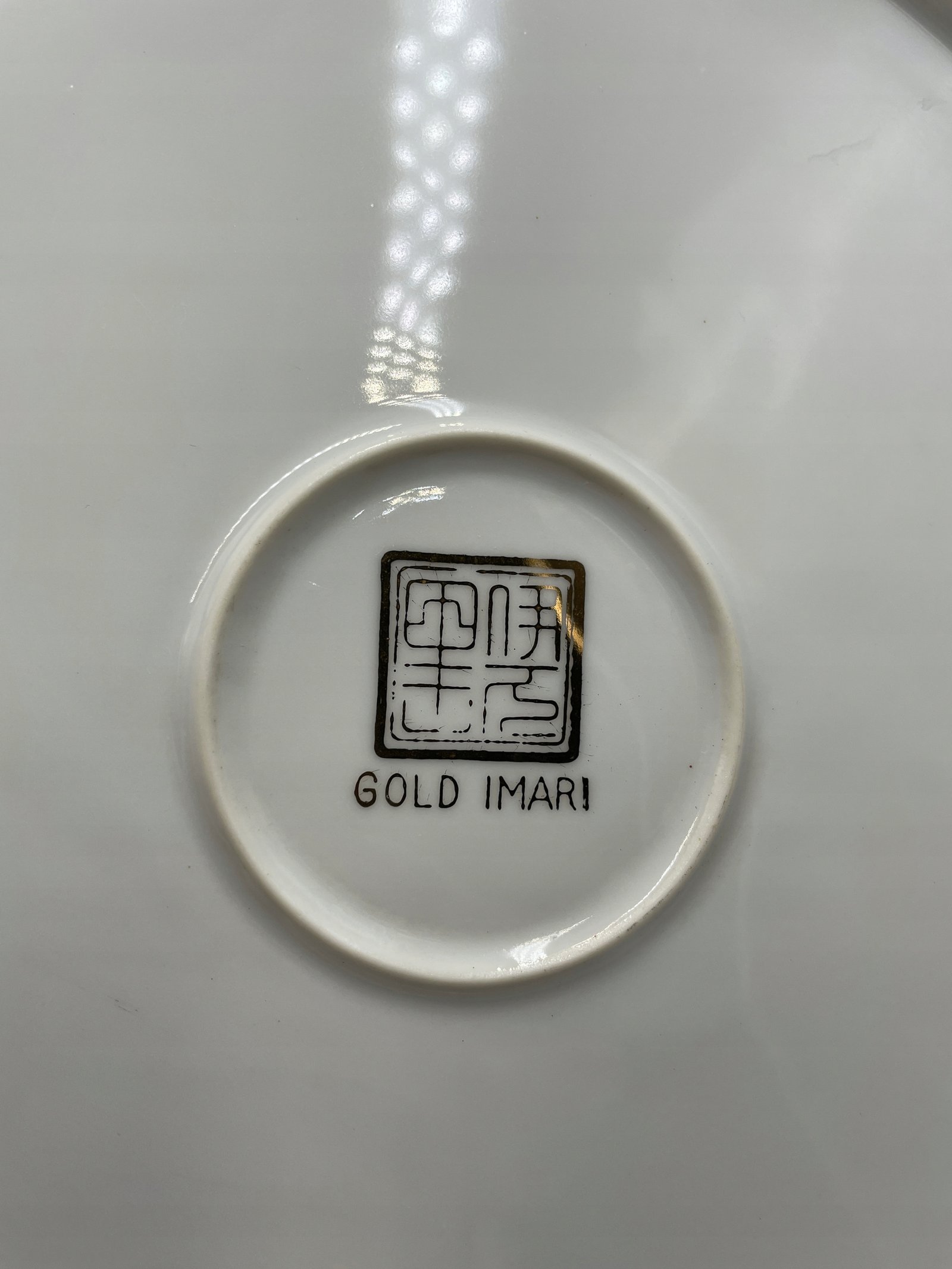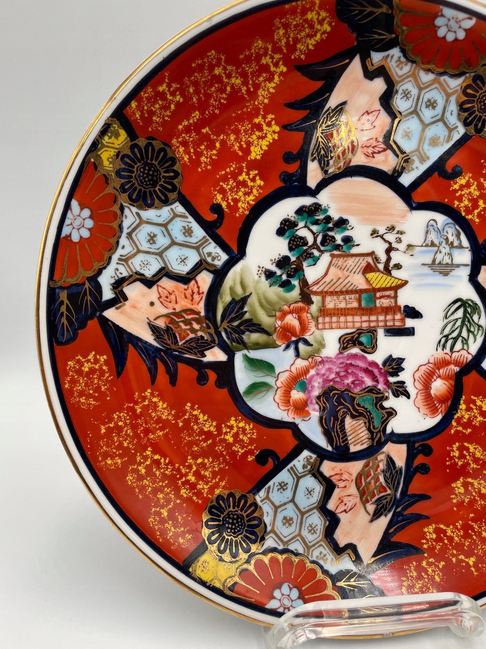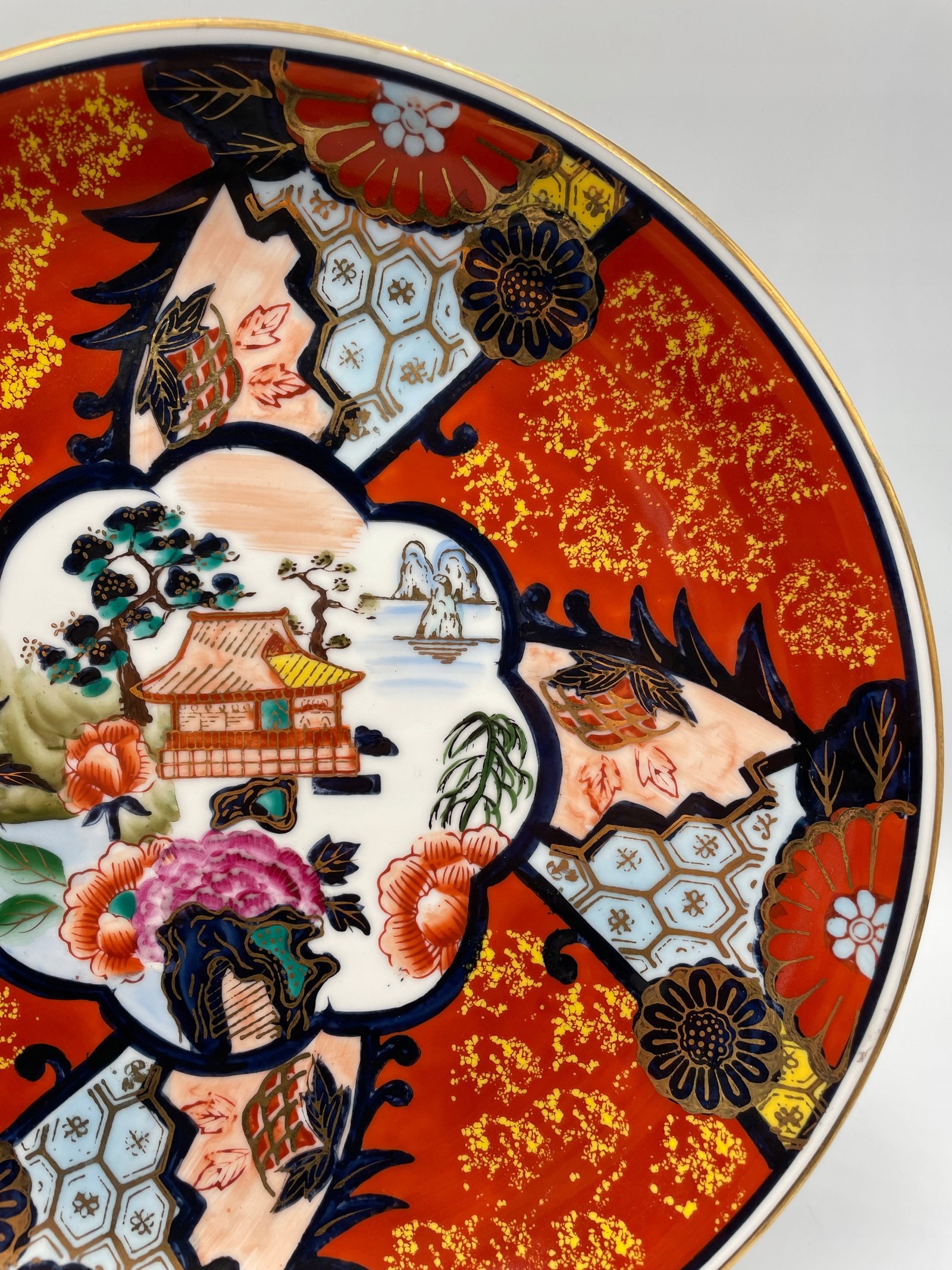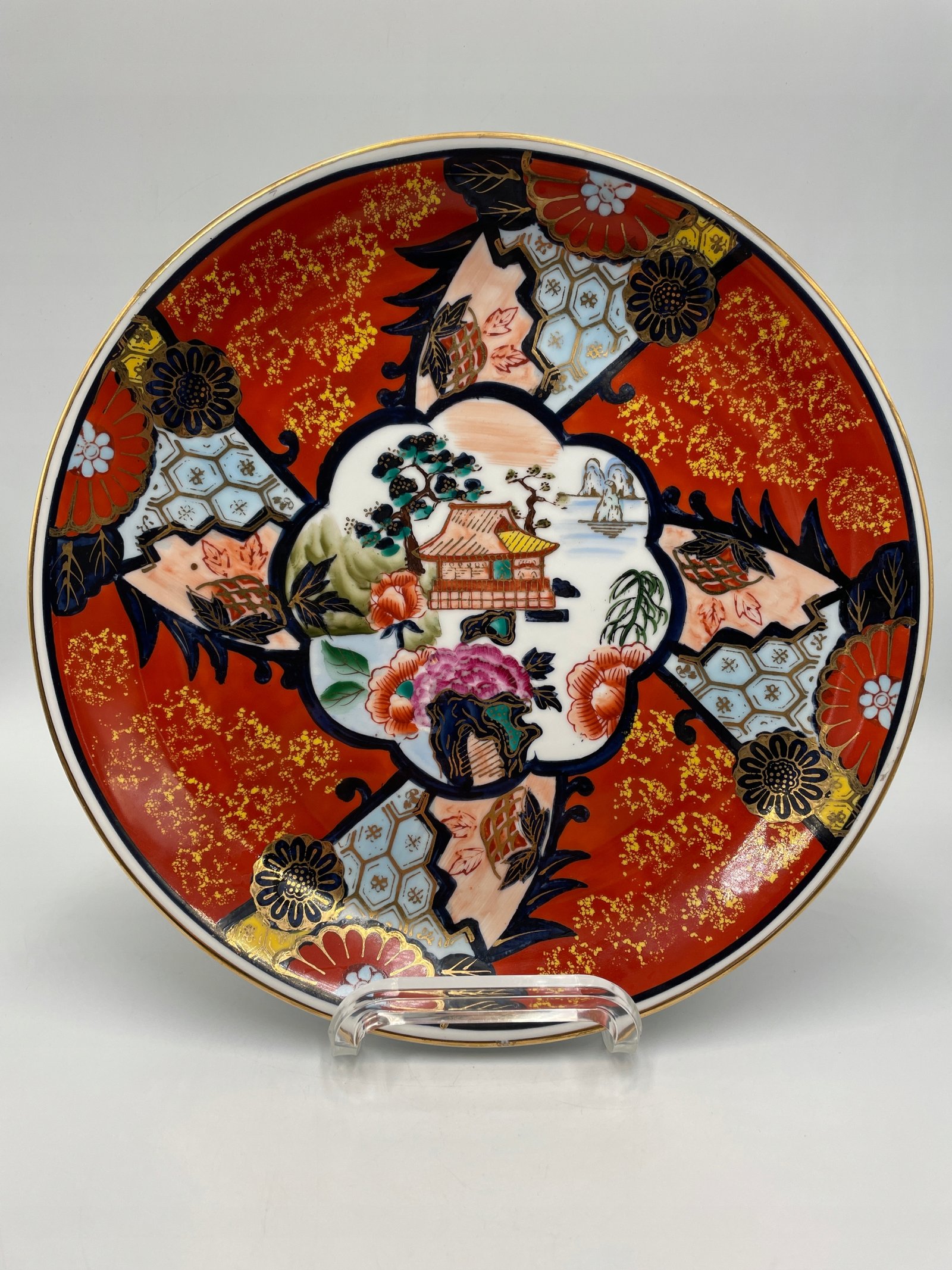 Efektowny porcelanowy talerz w stylu „Gold Imari” od japońskich mistrzów. Ozdobiony jest bogatym, intensywnym dekorem, w którym dominują czerwienie, złoto i granat. W centralnej części znajduje się scena przedstawiająca tradycyjny japoński dom, otoczony kwiatami oraz elementami natury. Brzegi talerza zdobi skomplikowany wzór geometryczno-roślinny z ręcznie malowanymi detalami i złoceniami. Wyrób wykonany jest z wysokiej jakości japońskiej porcelany i opatrzony sygnaturą „Gold Imari” na spodzie.