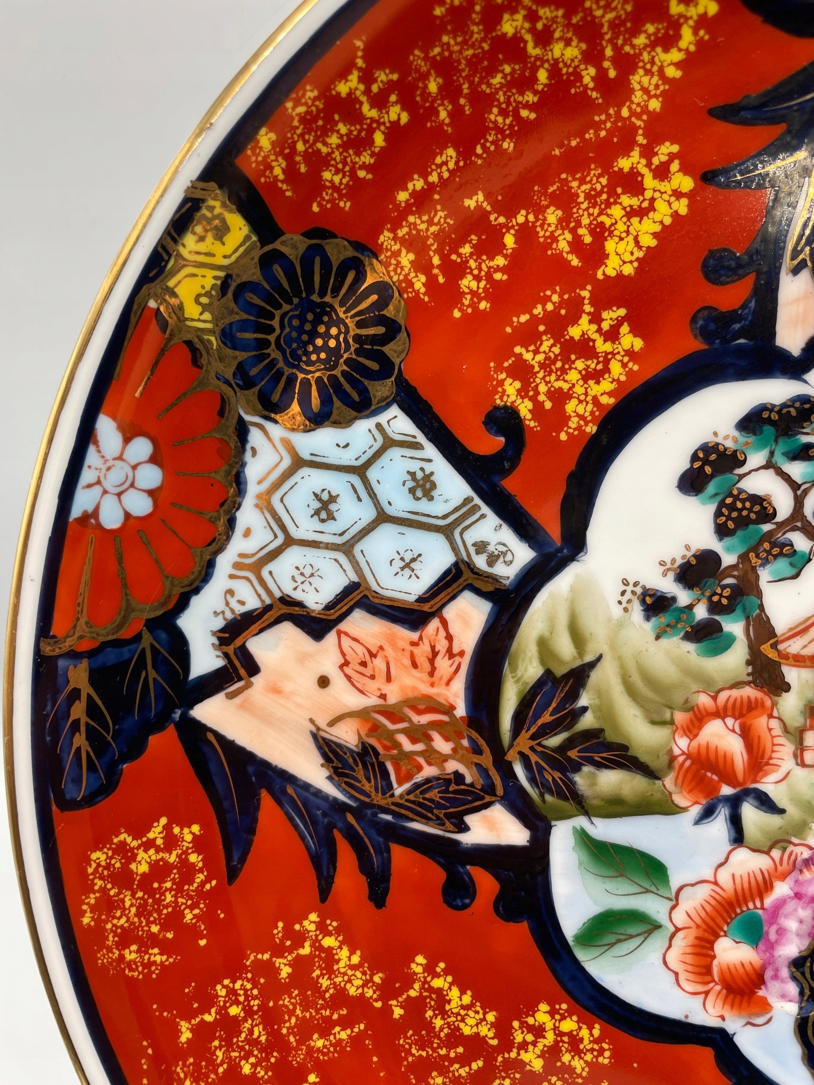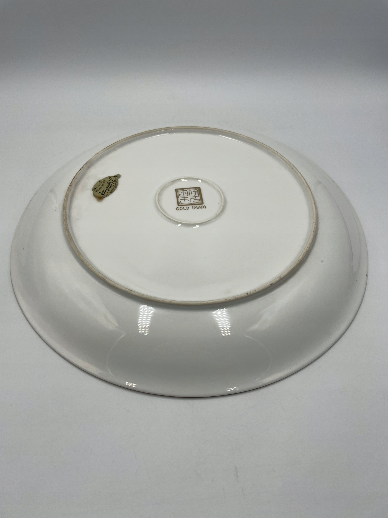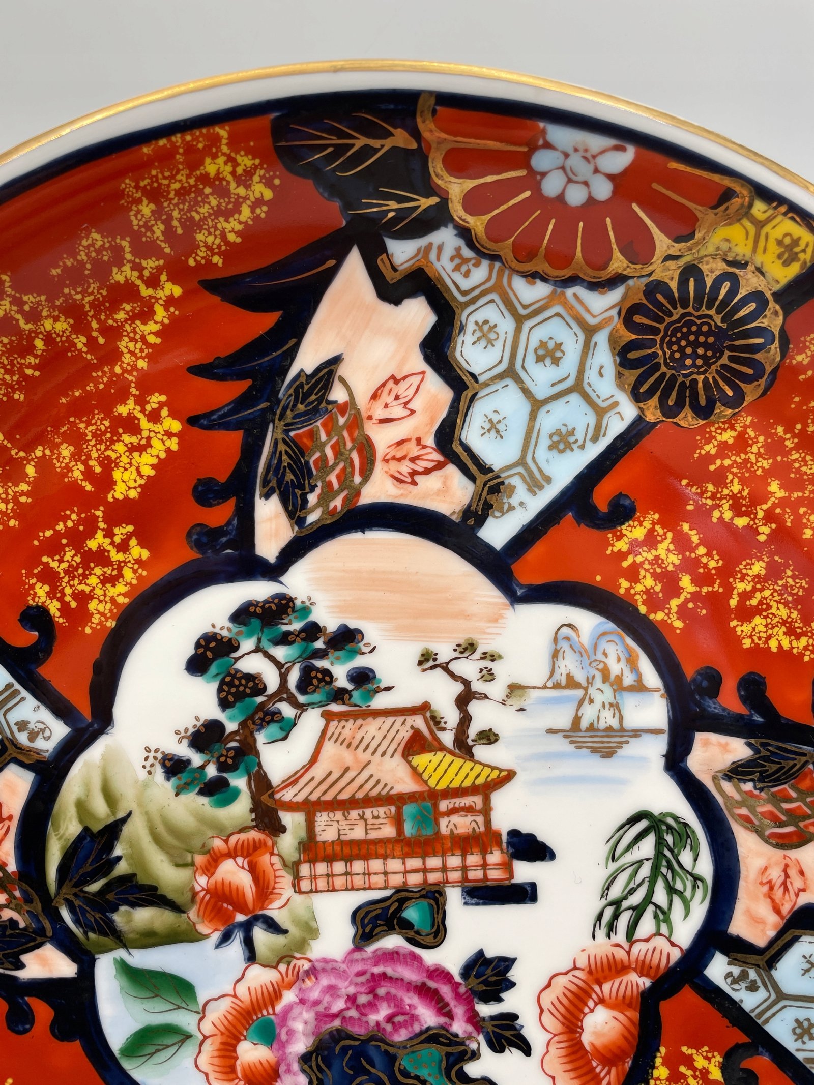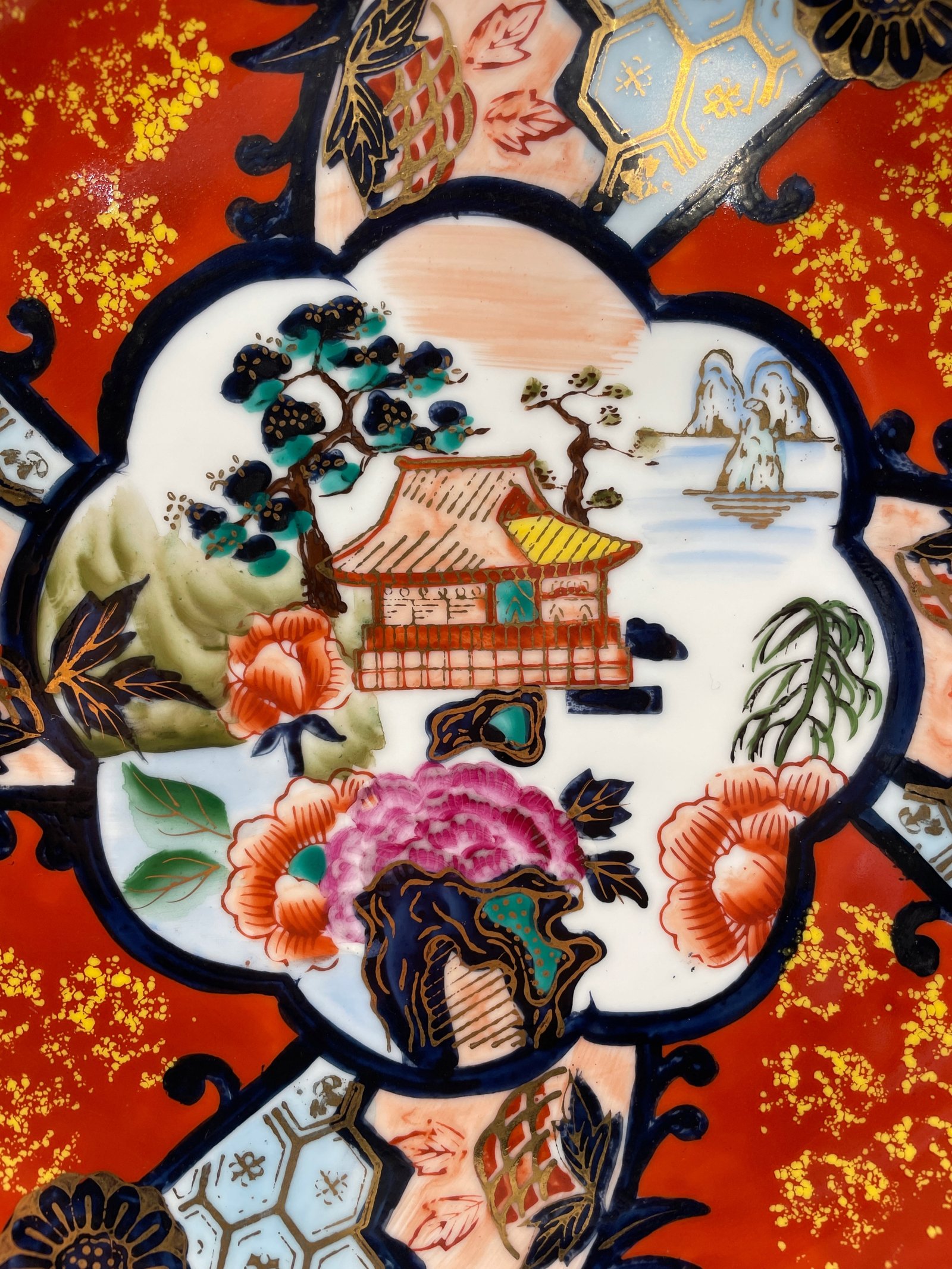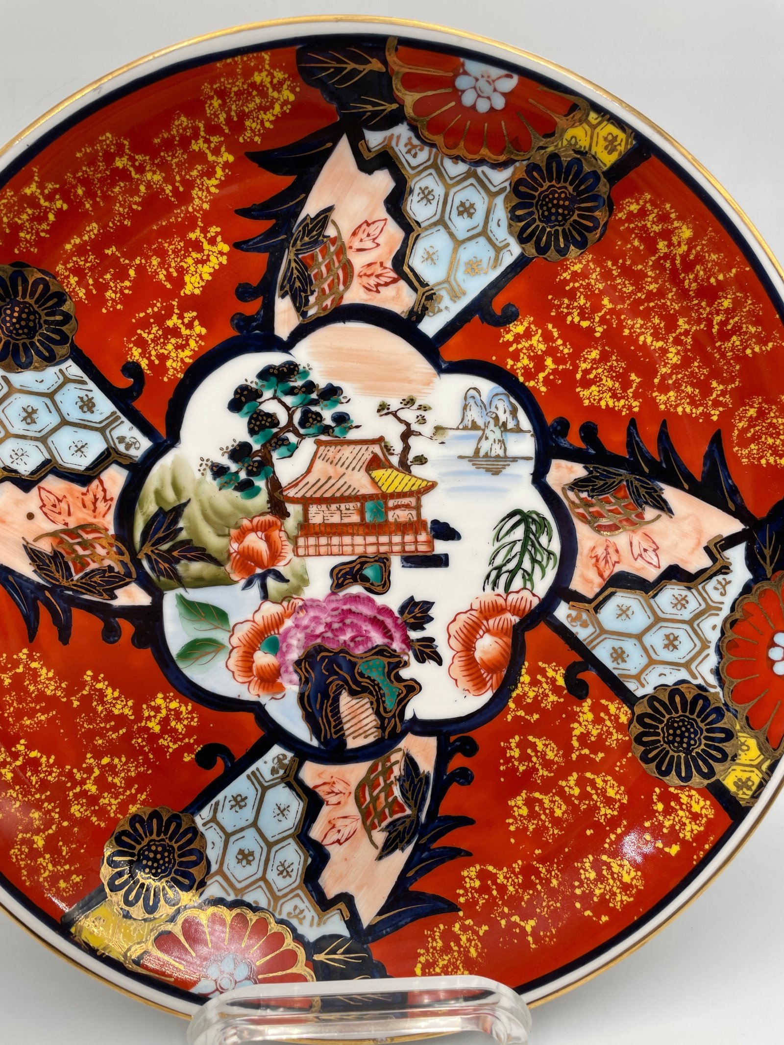 Efektowny porcelanowy talerz w stylu „Gold Imari” od japońskich mistrzów. Ozdobiony jest bogatym, intensywnym dekorem, w którym dominują czerwienie, złoto i granat. W centralnej części znajduje się scena przedstawiająca tradycyjny japoński dom, otoczony kwiatami oraz elementami natury. Brzegi talerza zdobi skomplikowany wzór geometryczno-roślinny z ręcznie malowanymi detalami i złoceniami. Wyrób wykonany jest z wysokiej jakości japońskiej porcelany i opatrzony sygnaturą „Gold Imari” na spodzie.