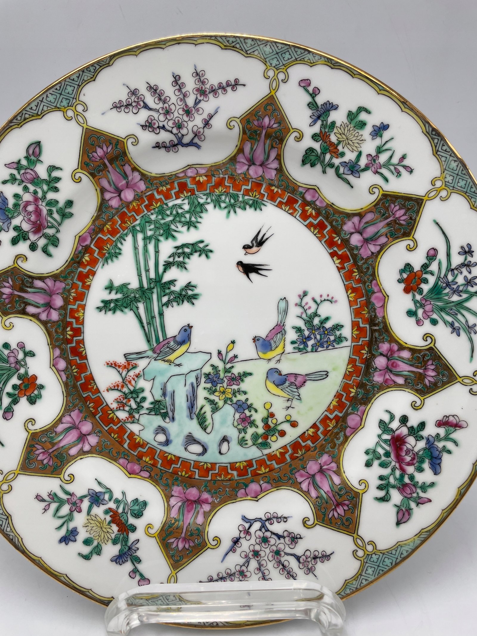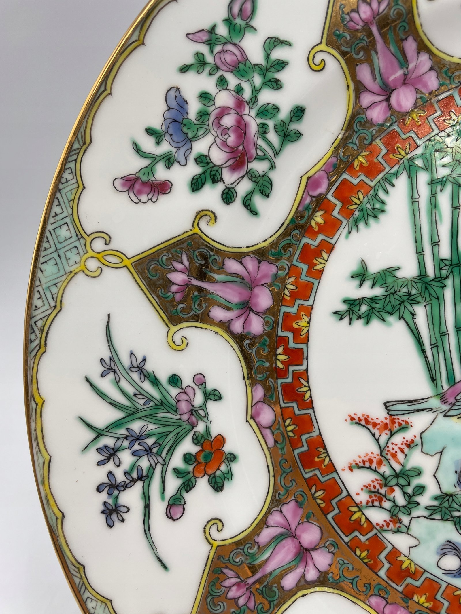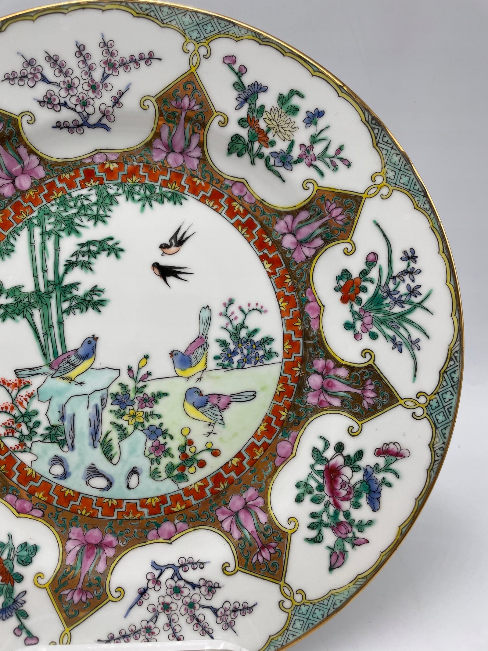 Talerz porcelanowy Chiny ptaki i kwiaty malowanie kantońskie 25,5 cm