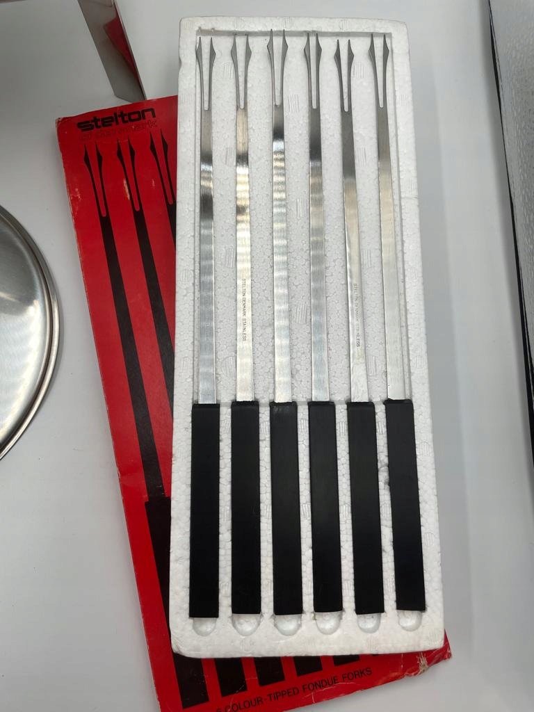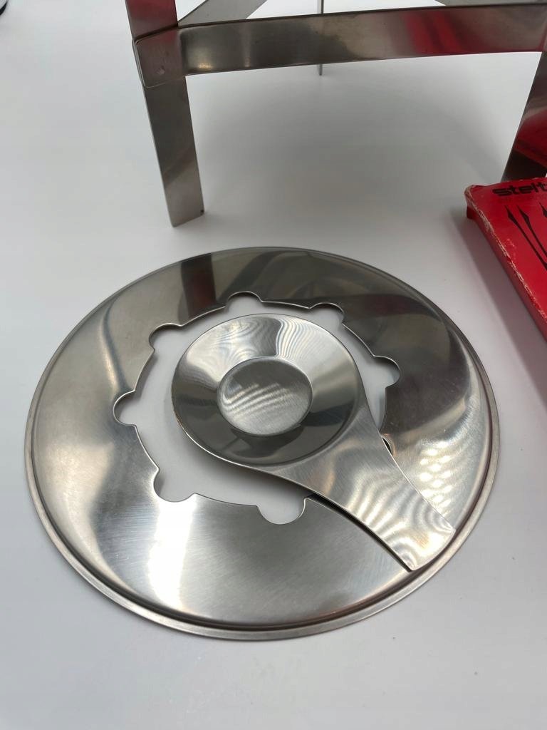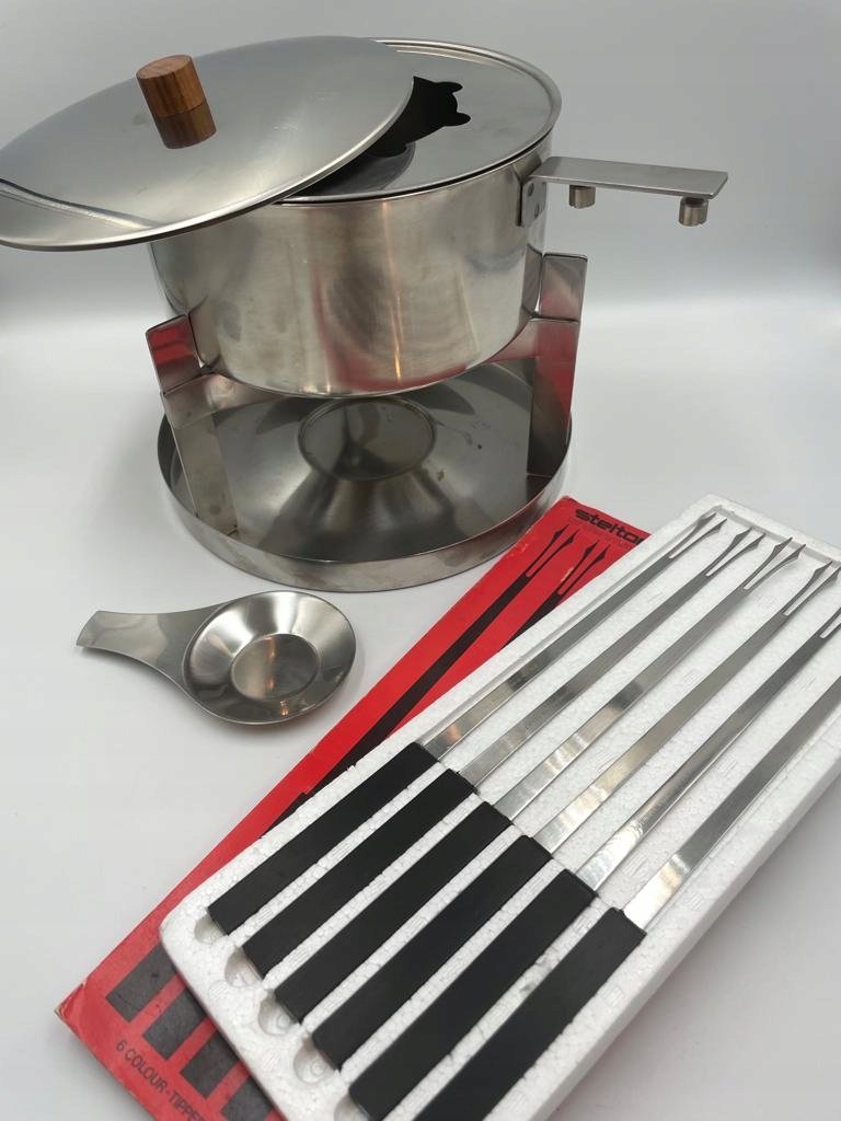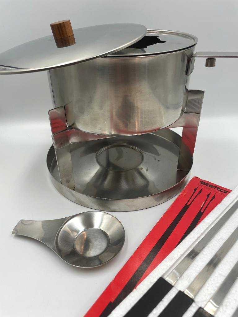 Bardzo piękne dziecięce fondue ze stali nierdzewnej firmy Stelton. Projekt pochodzi od pasierba Arne Jacobsena, Duńczyka Petera Holmblada. Projekt Petera Holmblada jest bardzo zbliżony do projektu Arne Jacobsena, zwłaszcza serii Cylinda-Line.