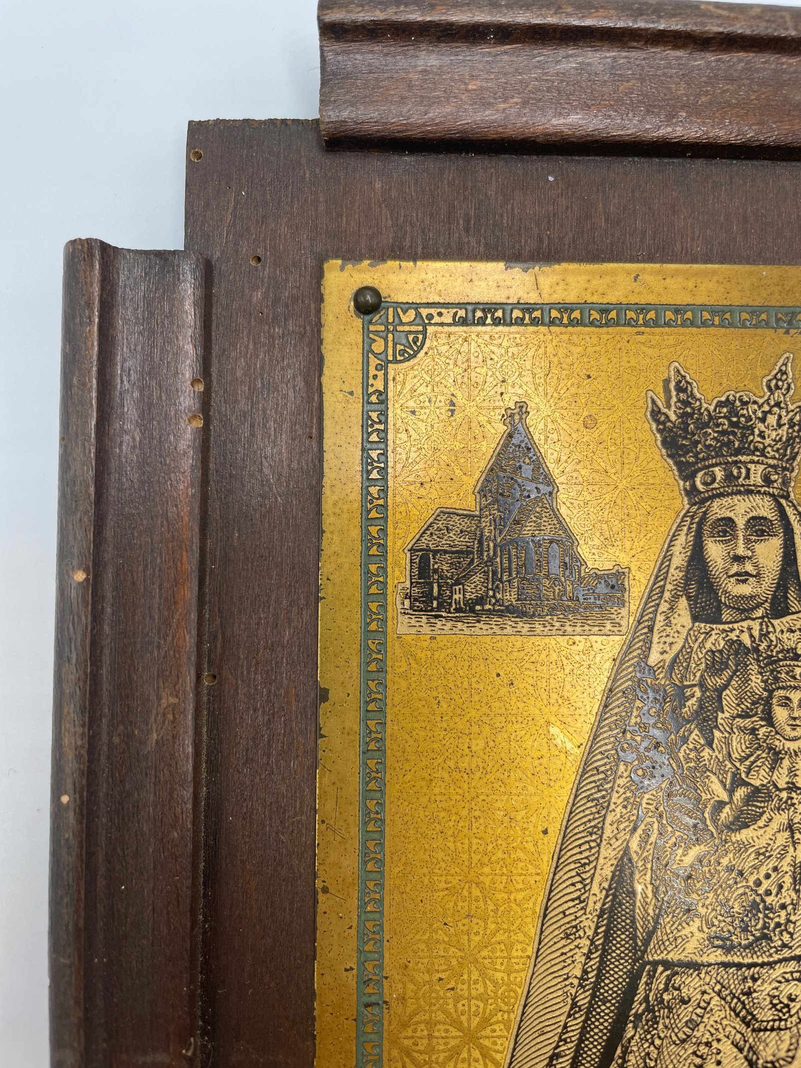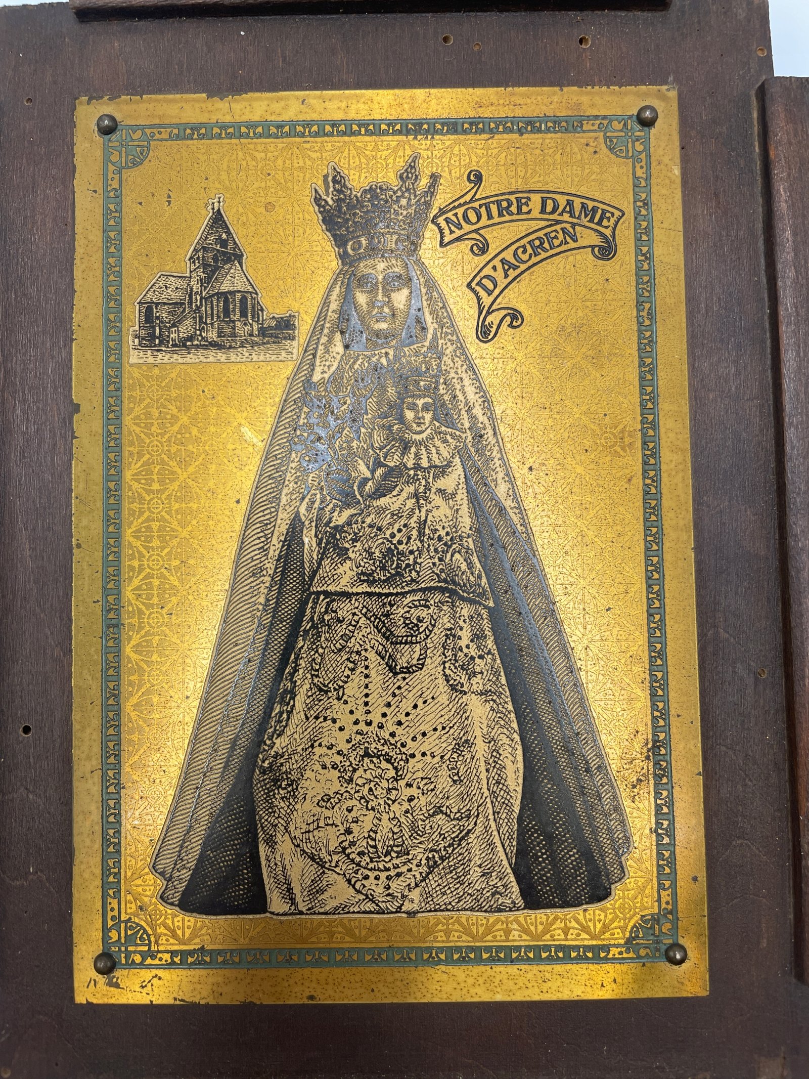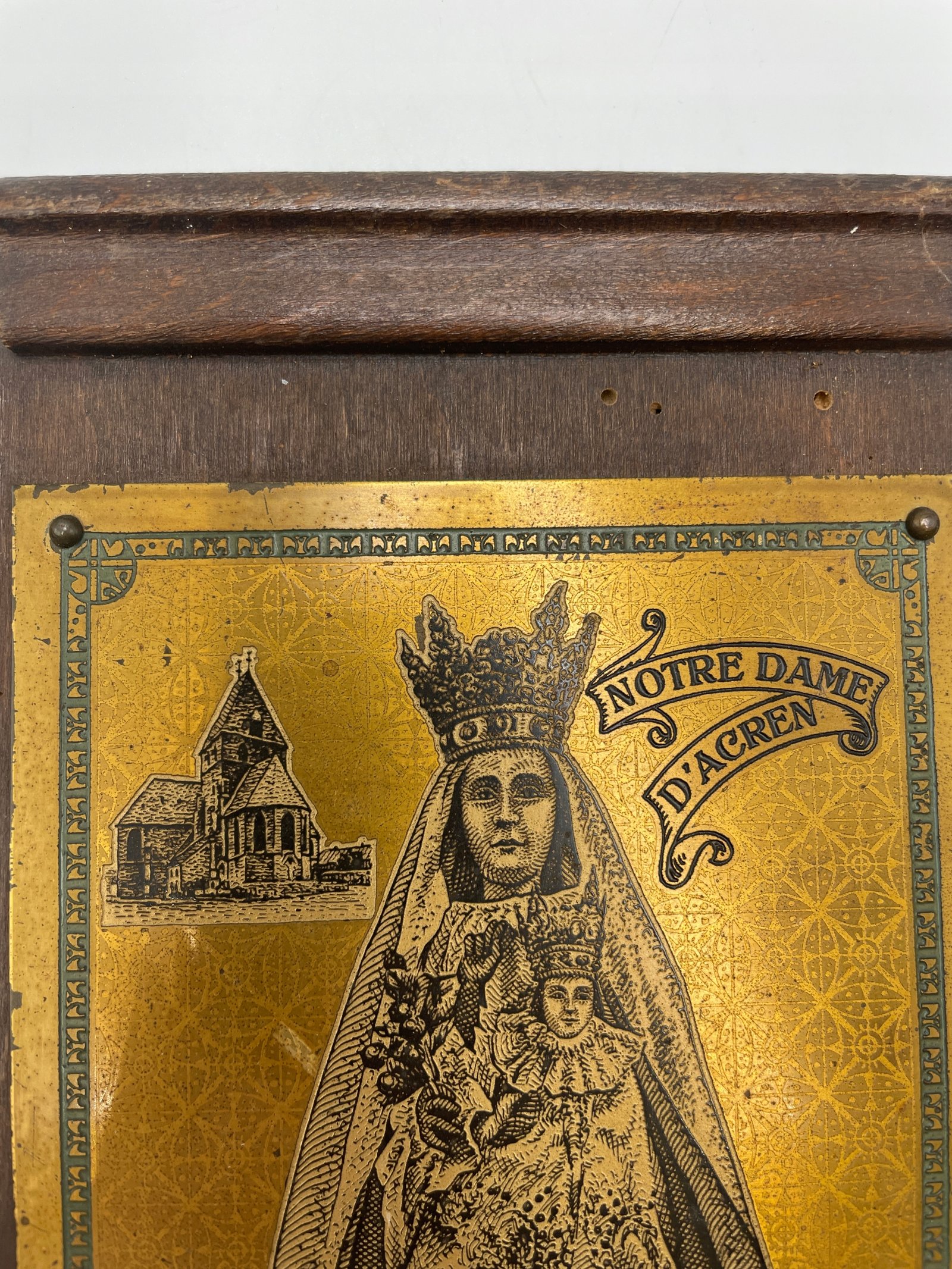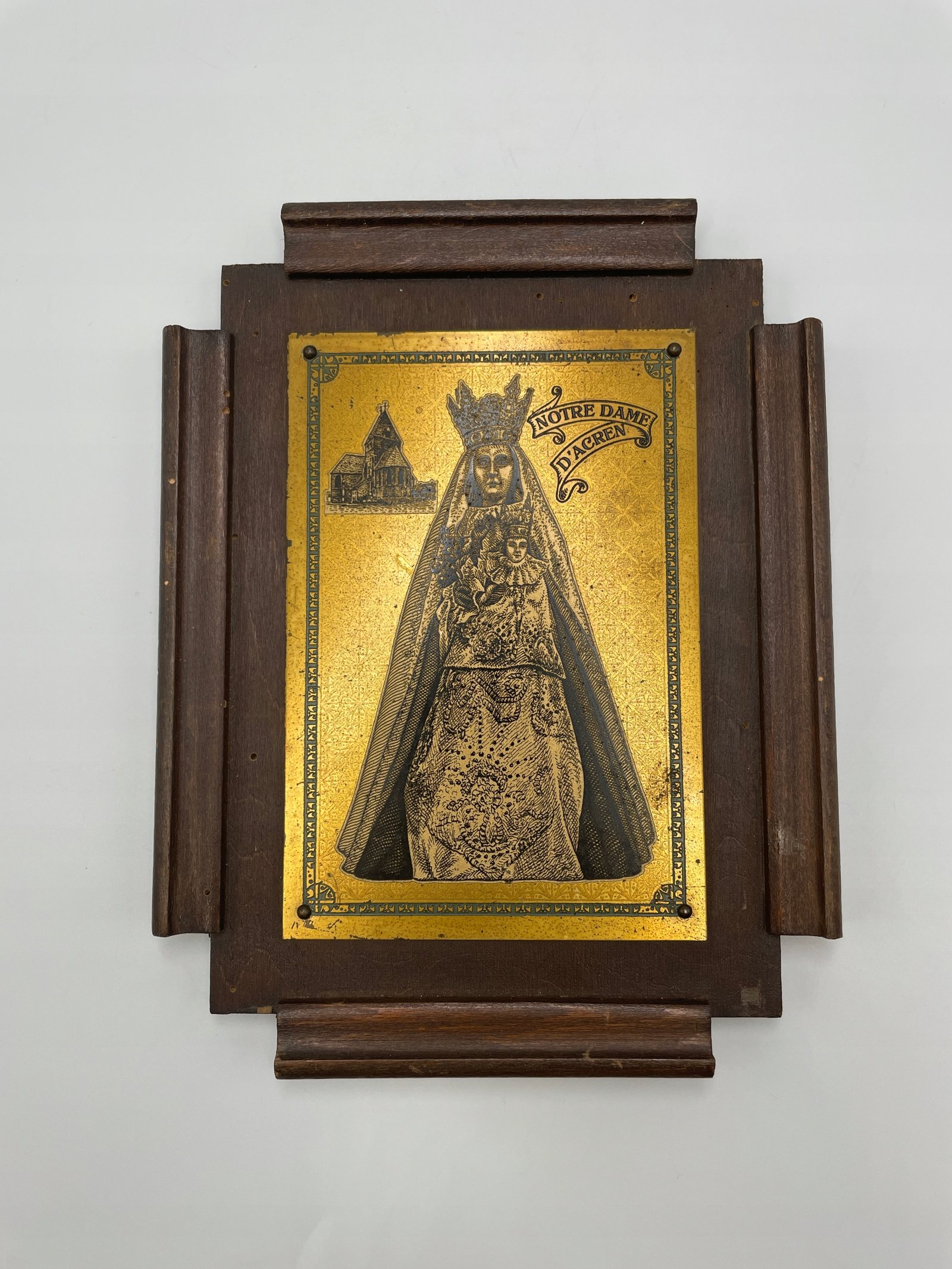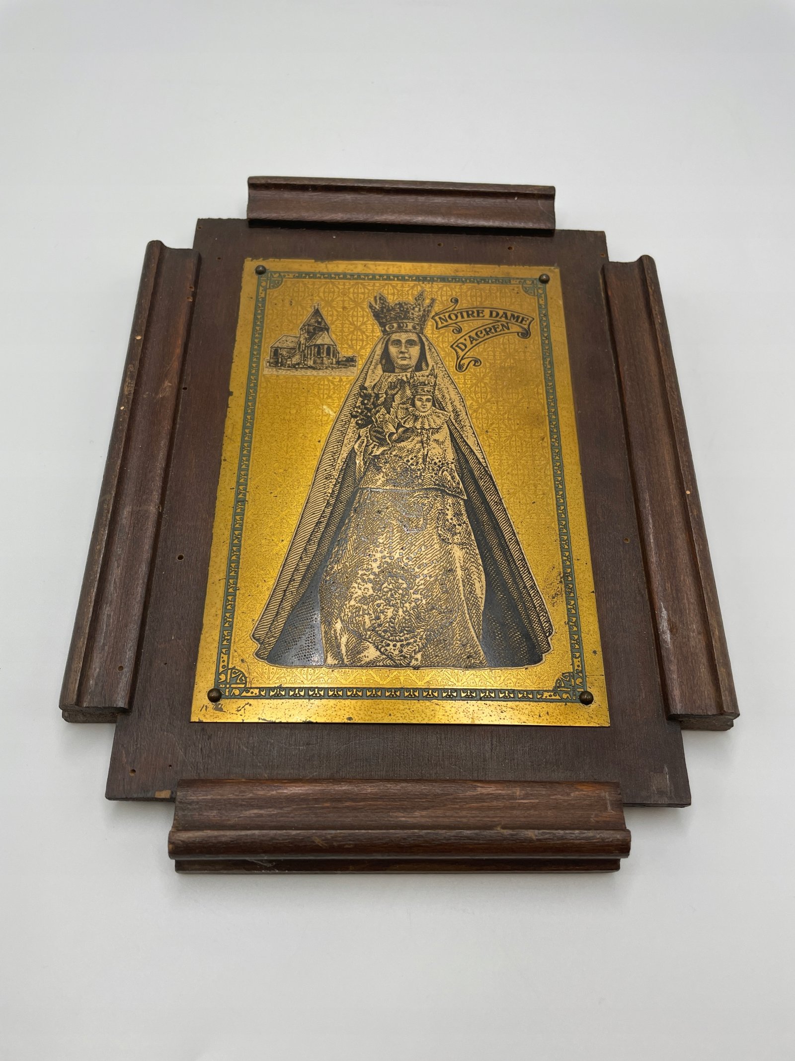 Stylowa, religijna tabliczka ścienna z wizerunkiem Notre Dame d’Acren – Matki Bożej z Dzieciątkiem Jezus, wykonana techniką grawerunku na mosiężnej płytce, osadzona na drewnianej ramie.