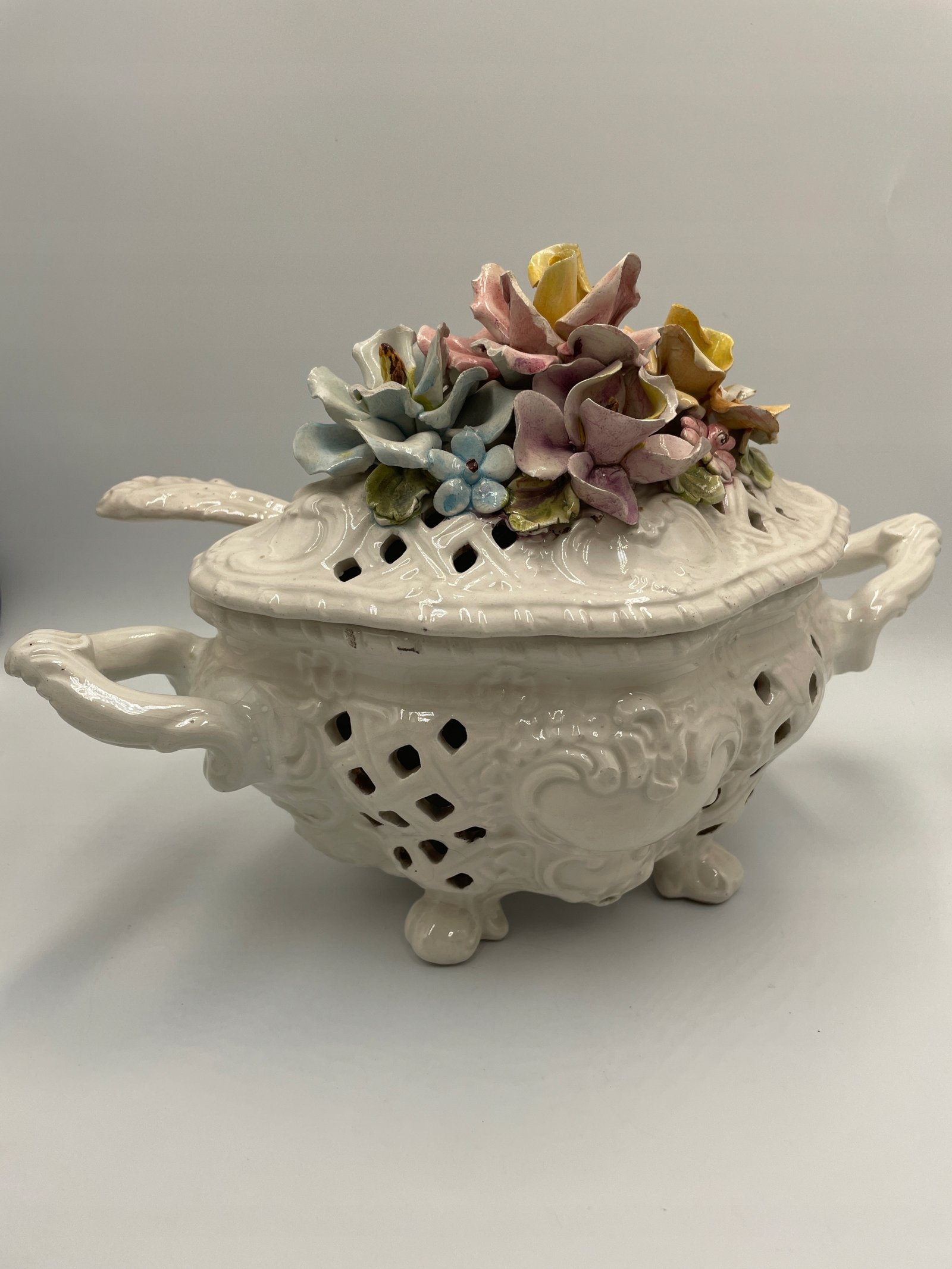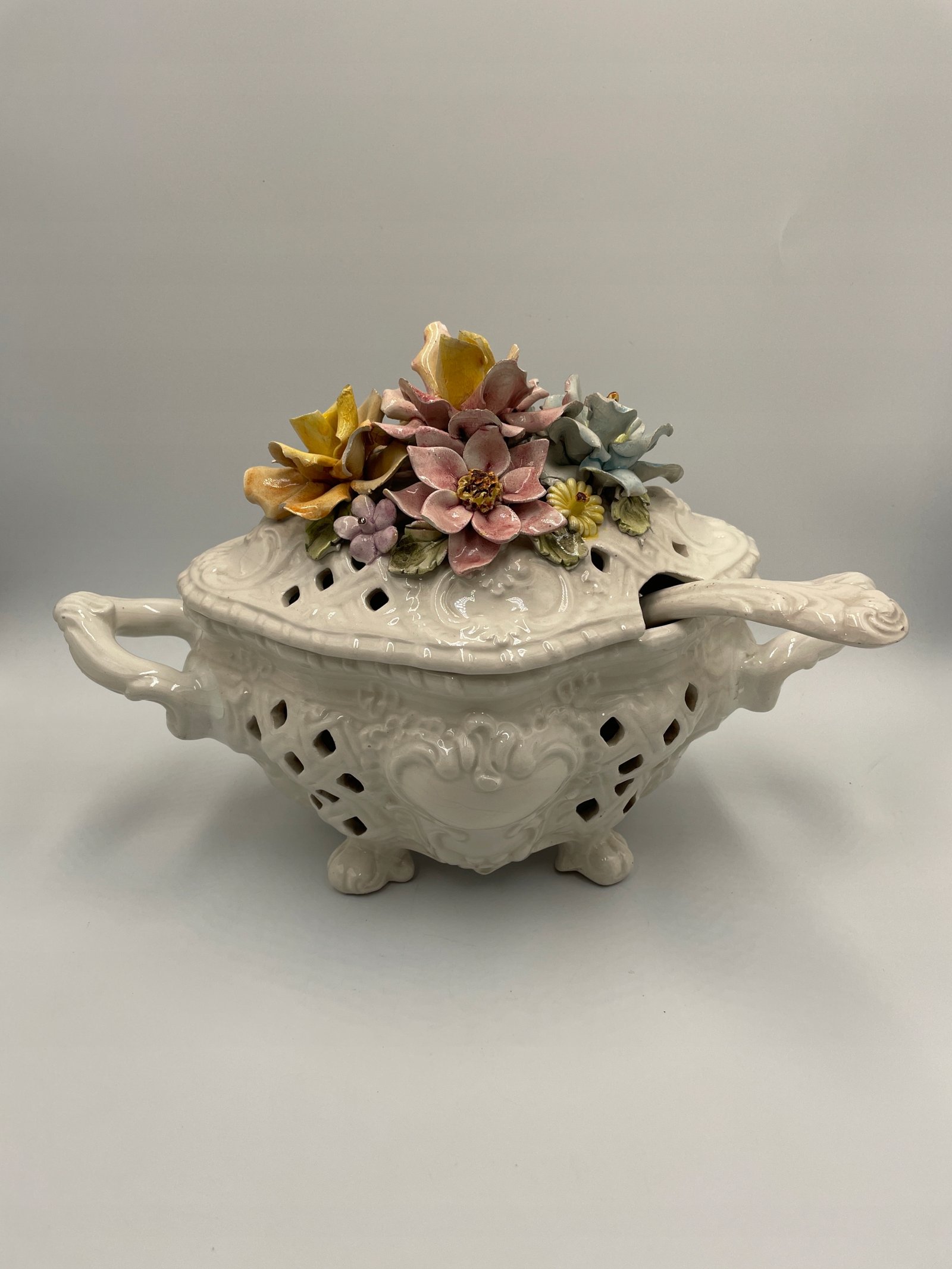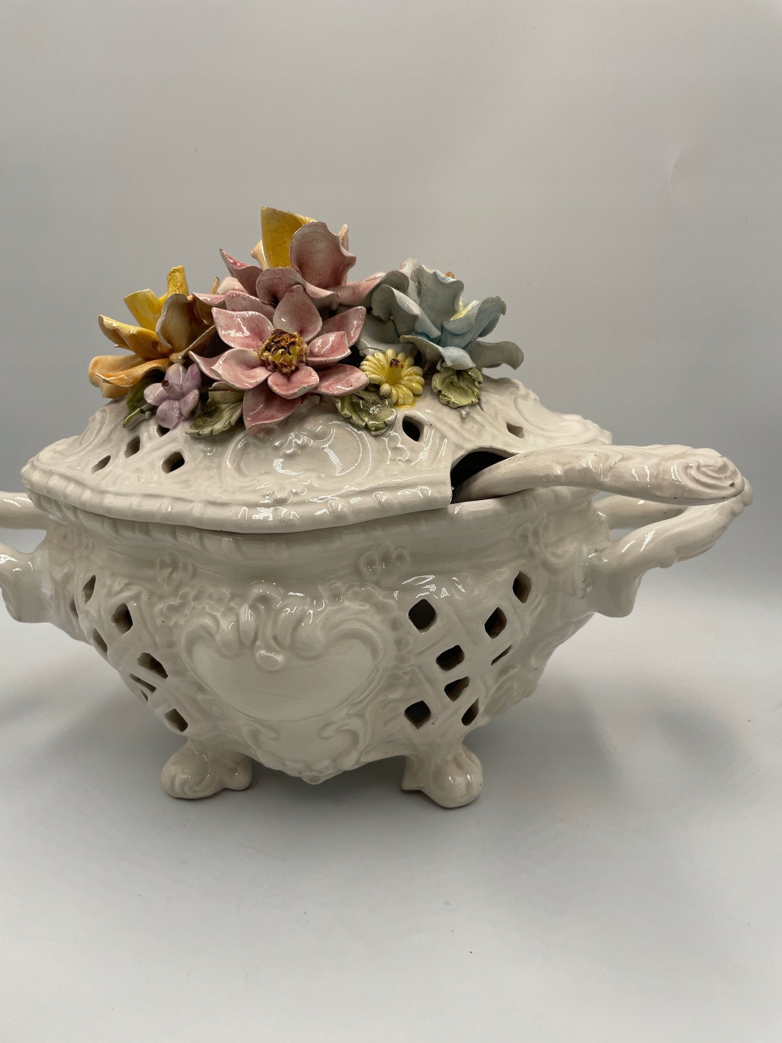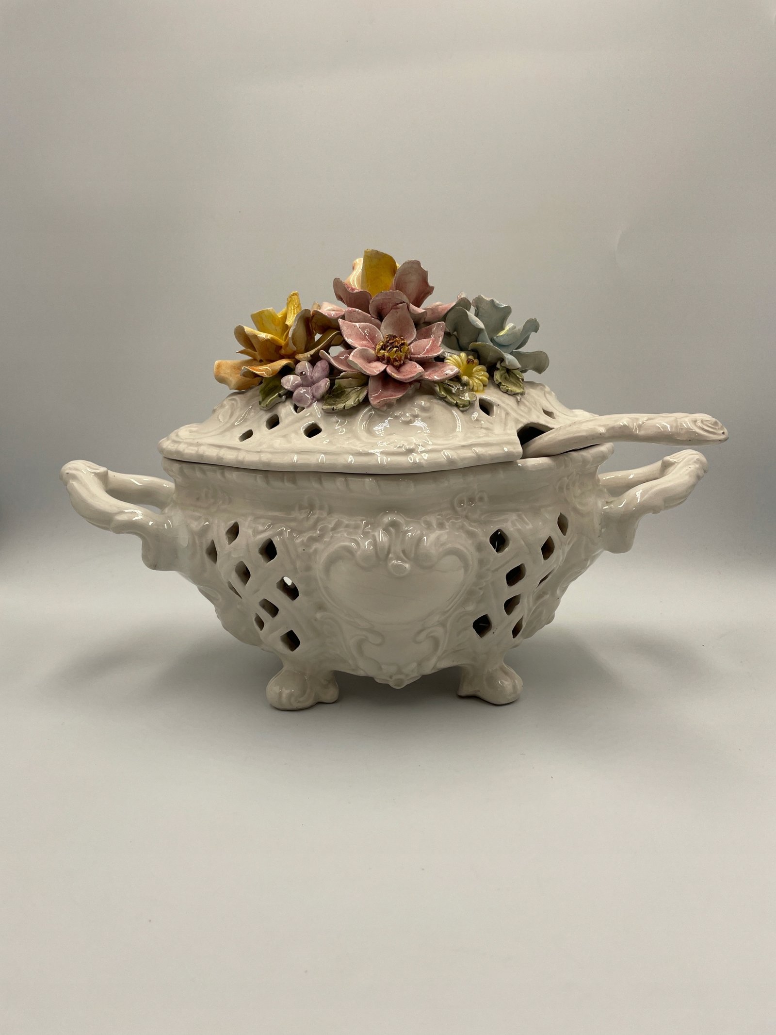 Waza do zupy Bassano z pokrywką i kwiatową dekoracją Włochy vintage