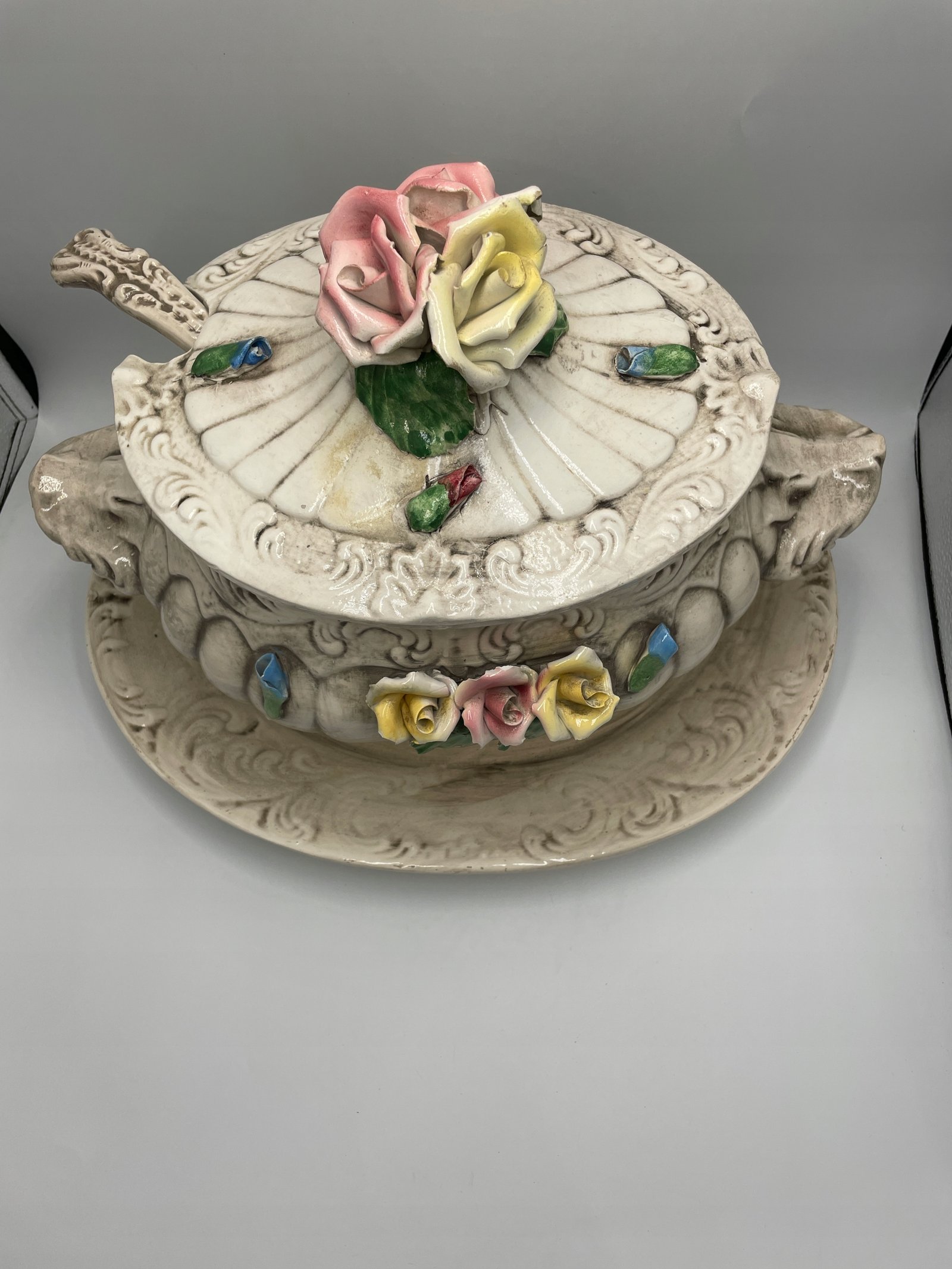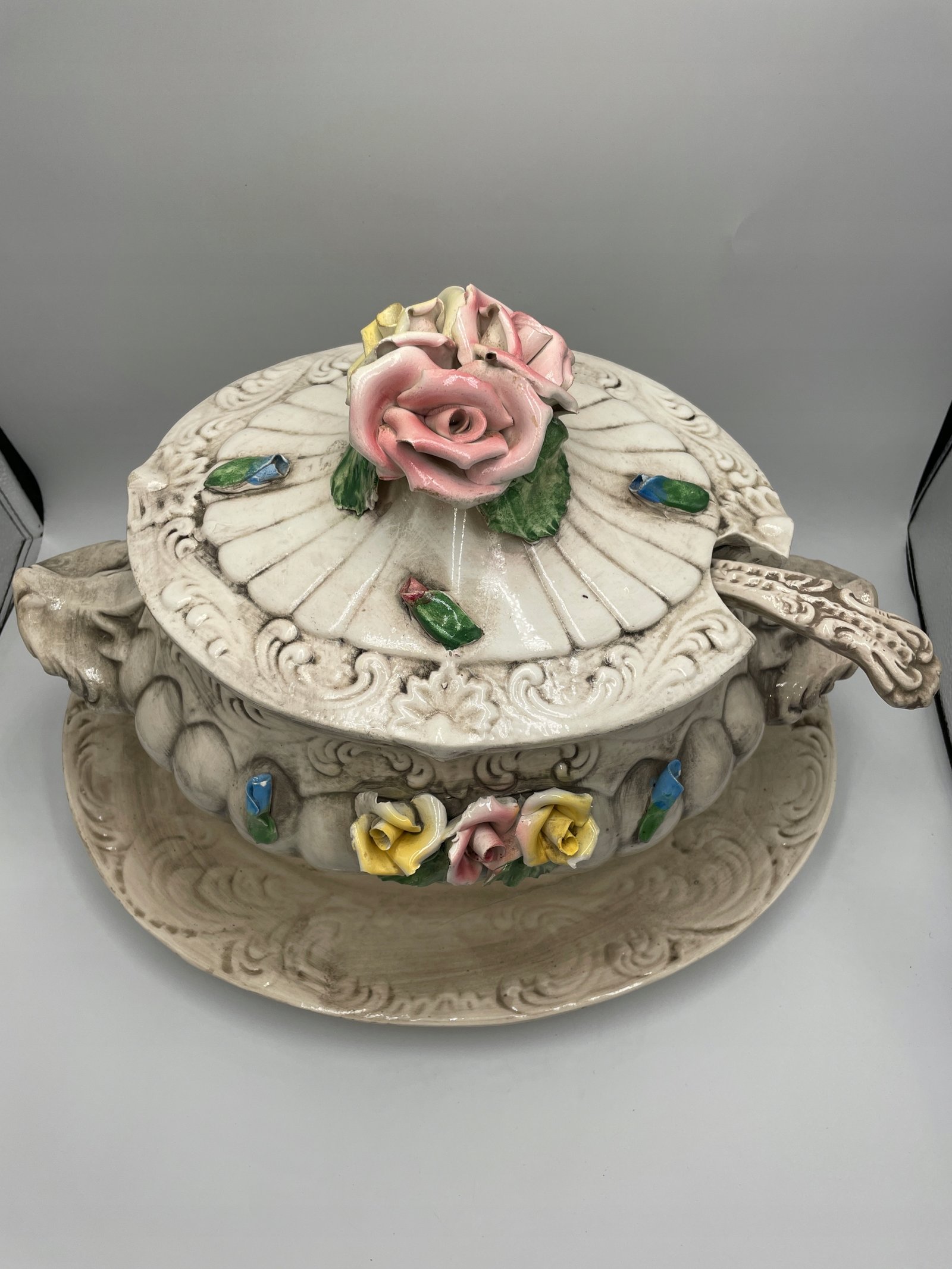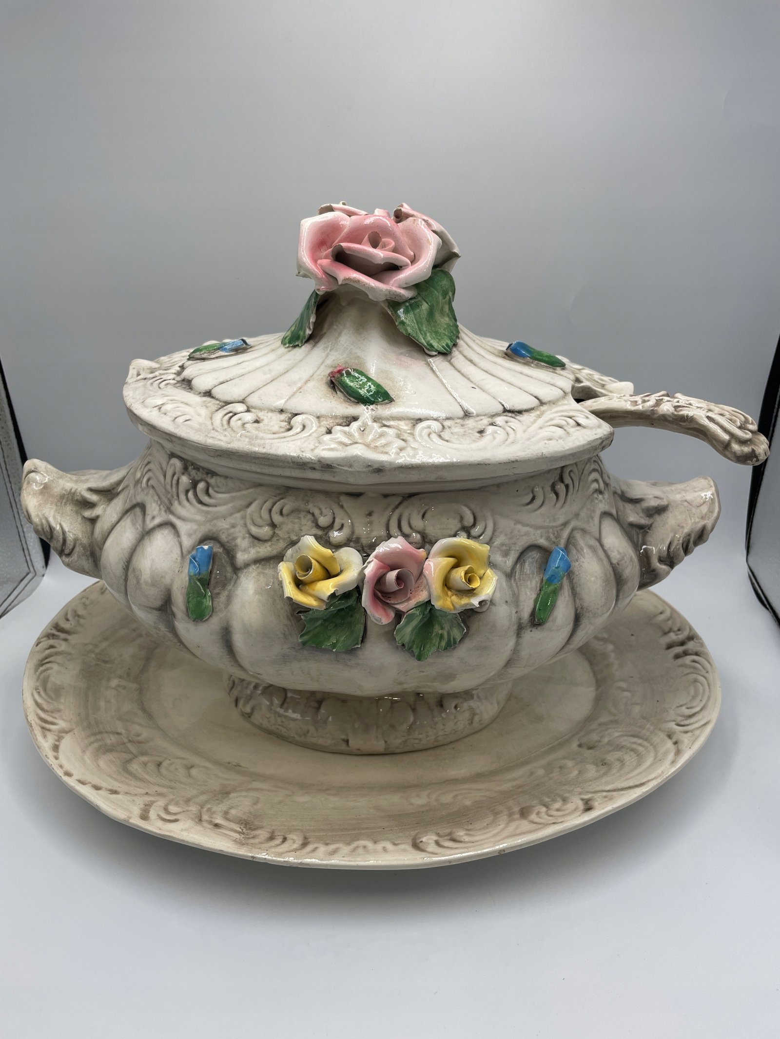 Waza do zupy ceramiczna Włochy z motywem kwiatowym i tacą