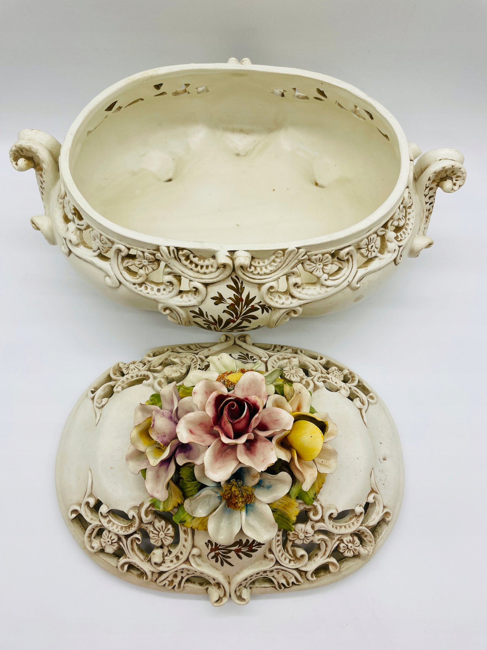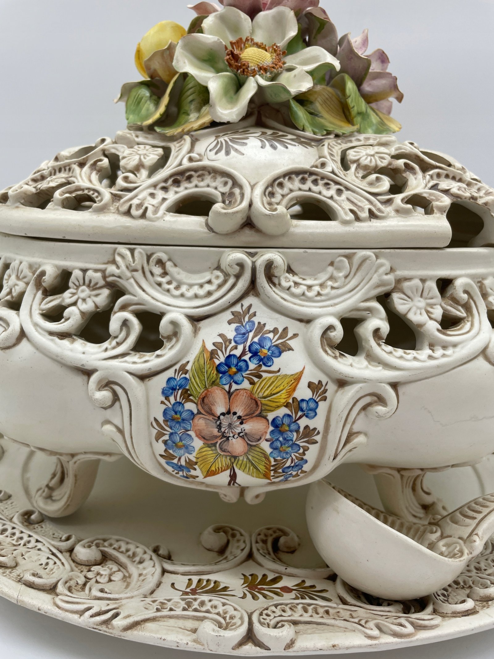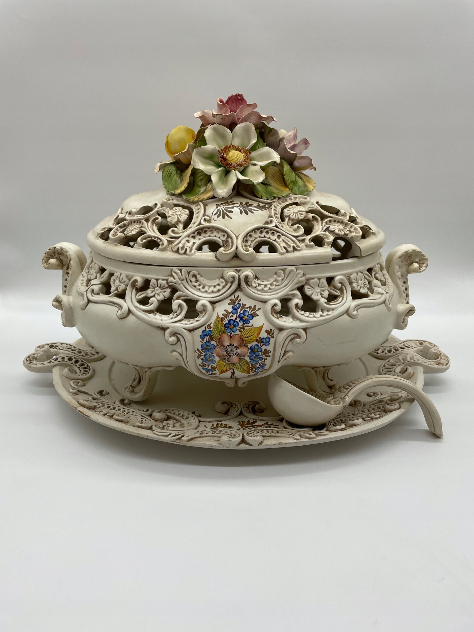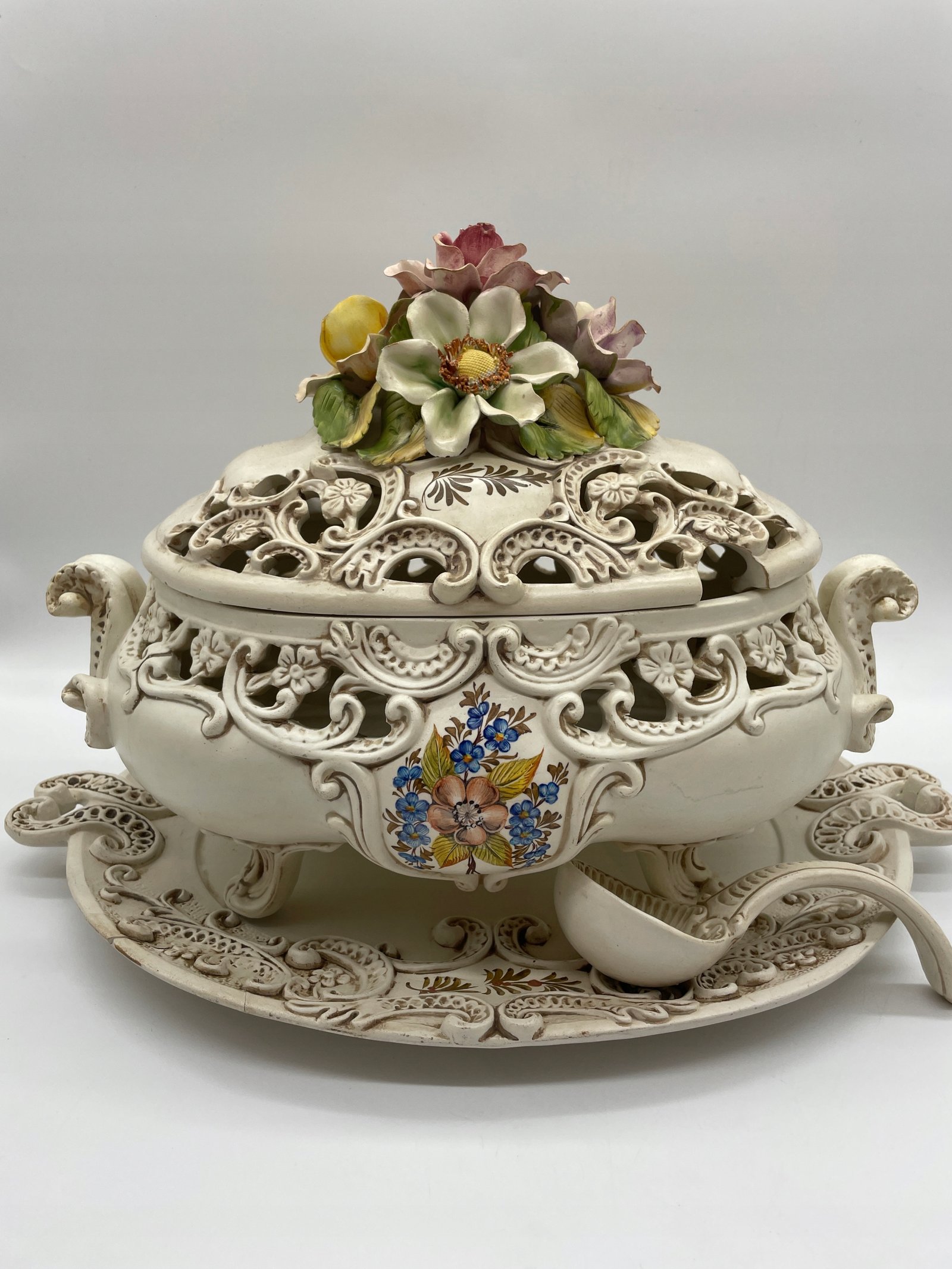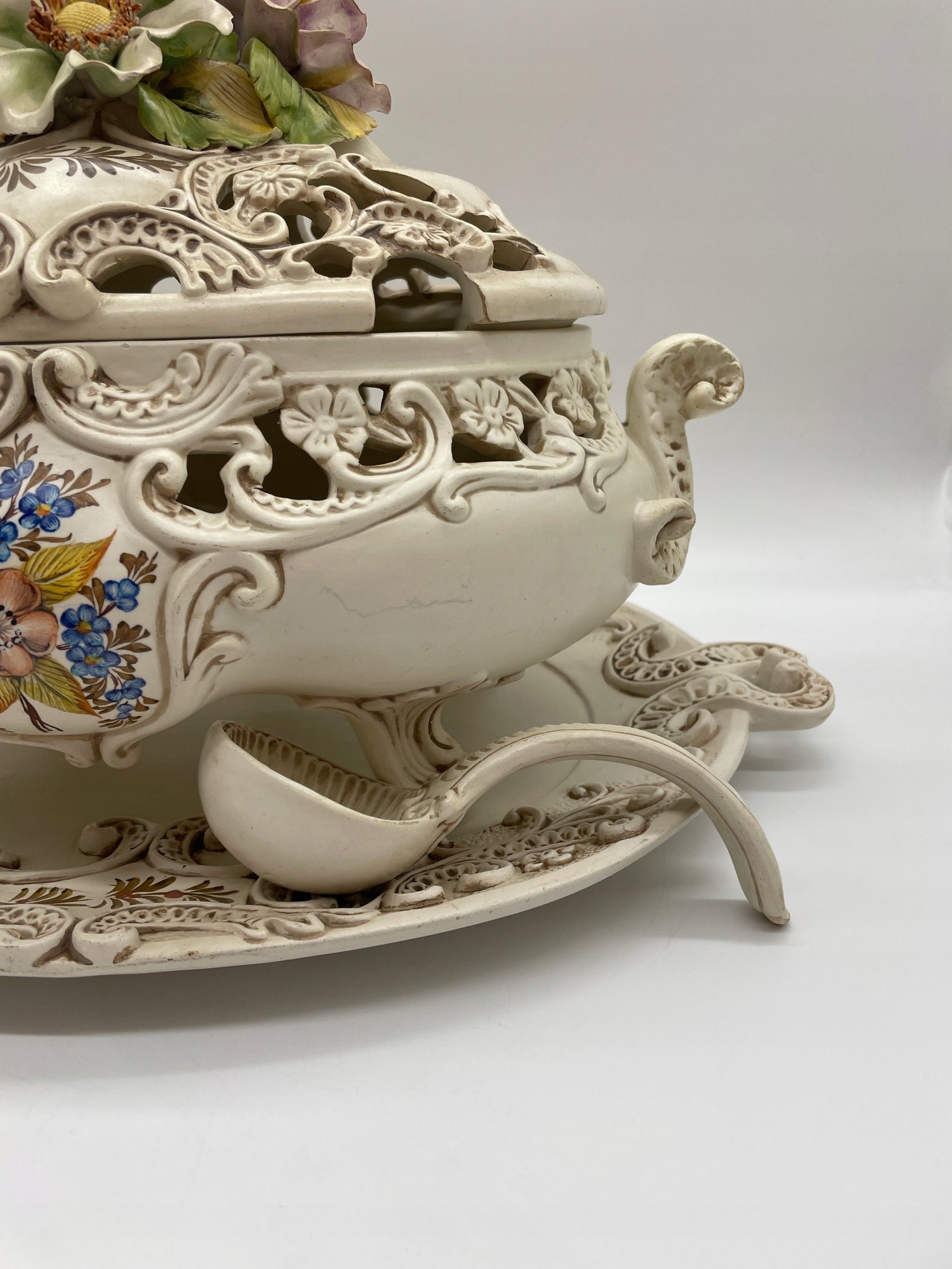 Waza na zupę Włochy 1950s ceramika ażurowa kwiaty tacka chochla