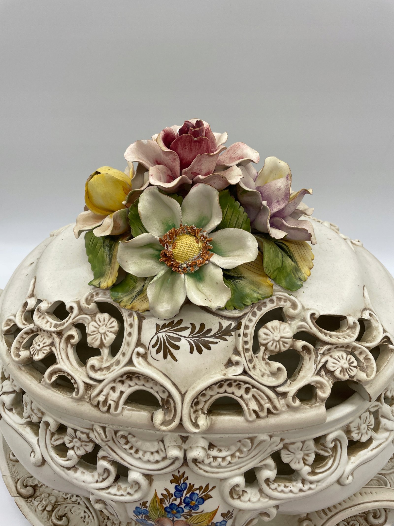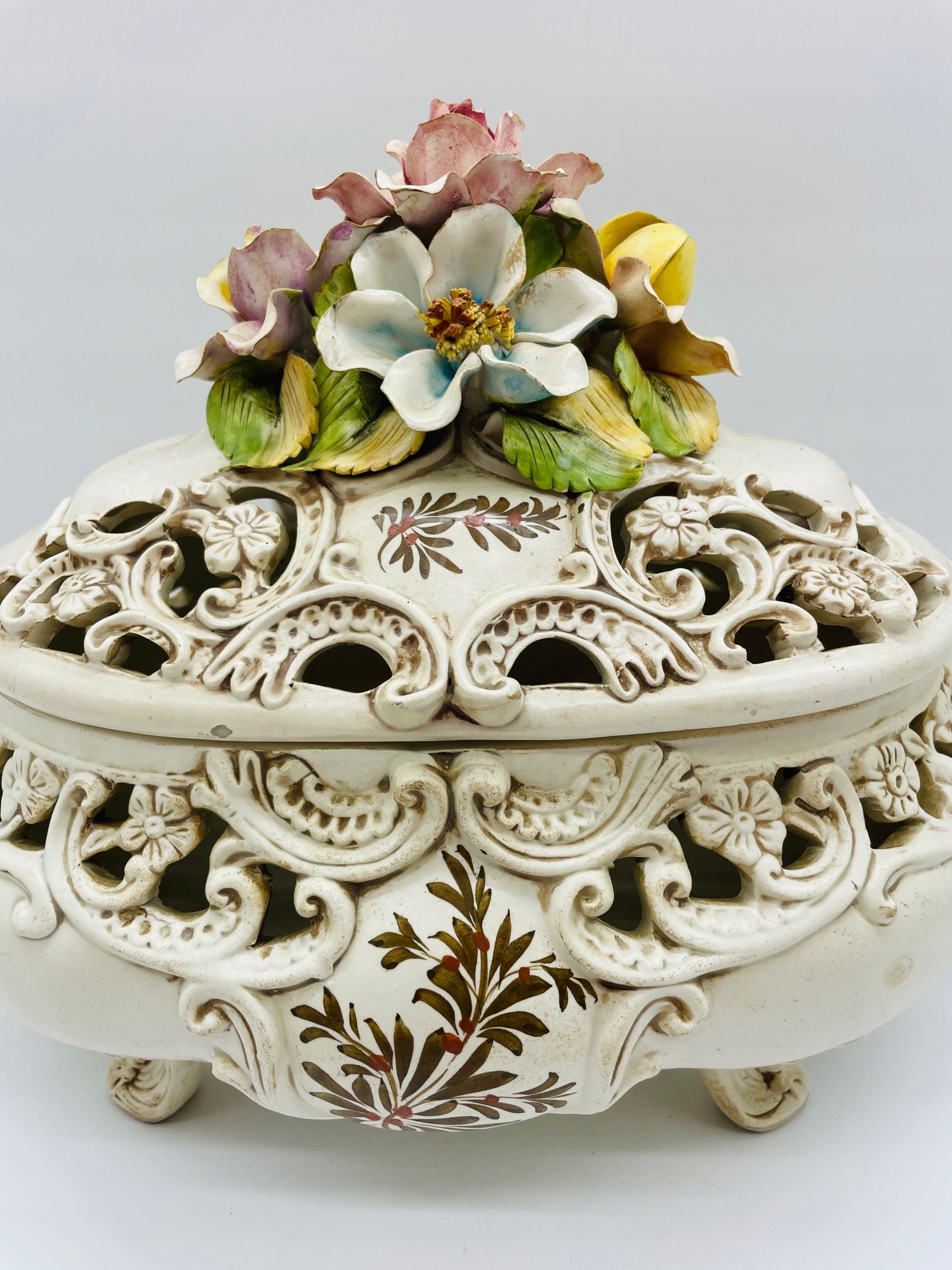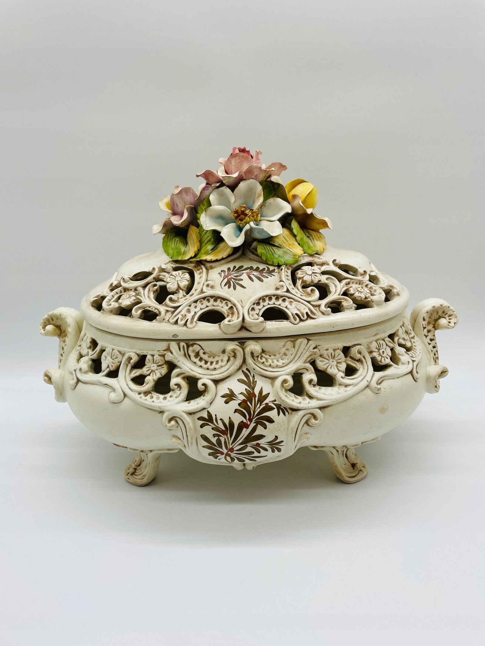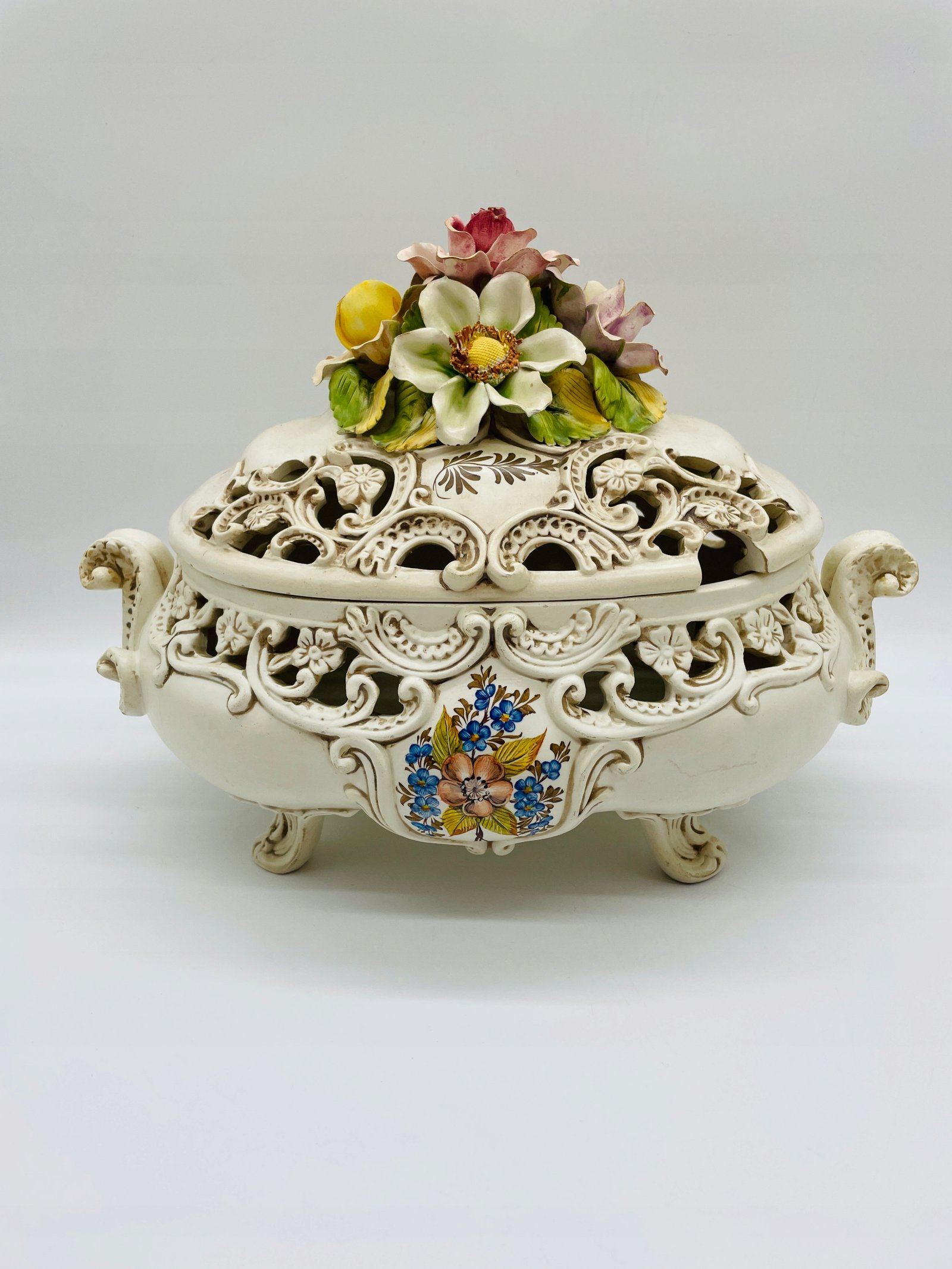 Waza na zupę Włochy lata 50. XX wieku z pokrywką zdobioną kwiatami, ażurowym wzorem i reliefowym dekorem. W zestawie znajduje się tacka i chochla z reliefowym motywem. Datowanie orientacyjne — połowa XX wieku, typowa włoska ceramika z kwiatową aplikacją. Wymiary wazy — 32×40×26 cm, tacka — 49×35 cm (uszkodzona), chochla — 18×7 cm. Materiał — ceramika szkliwiona, ręcznie malowana i zdobiona.