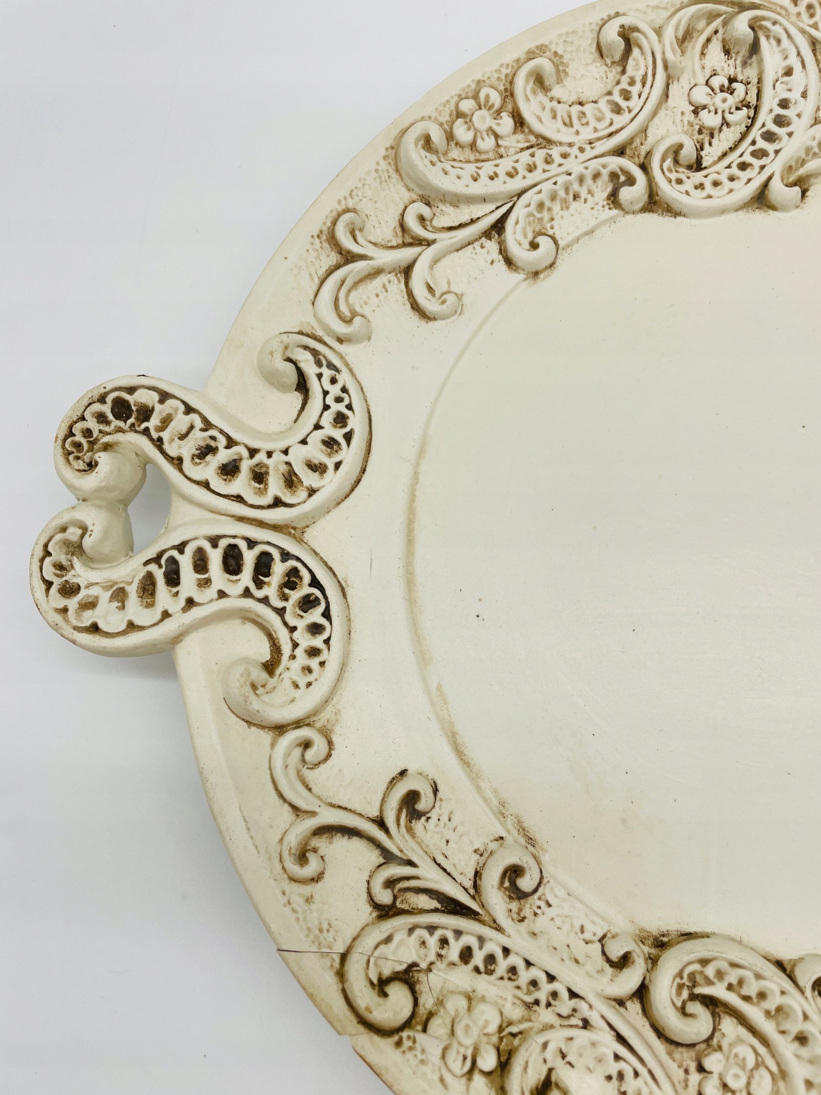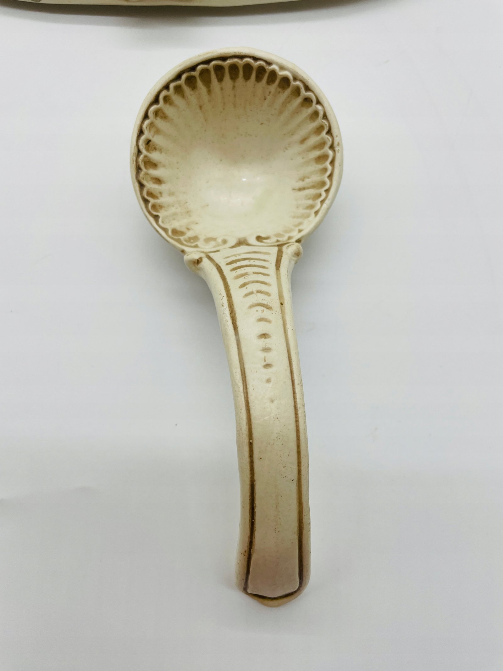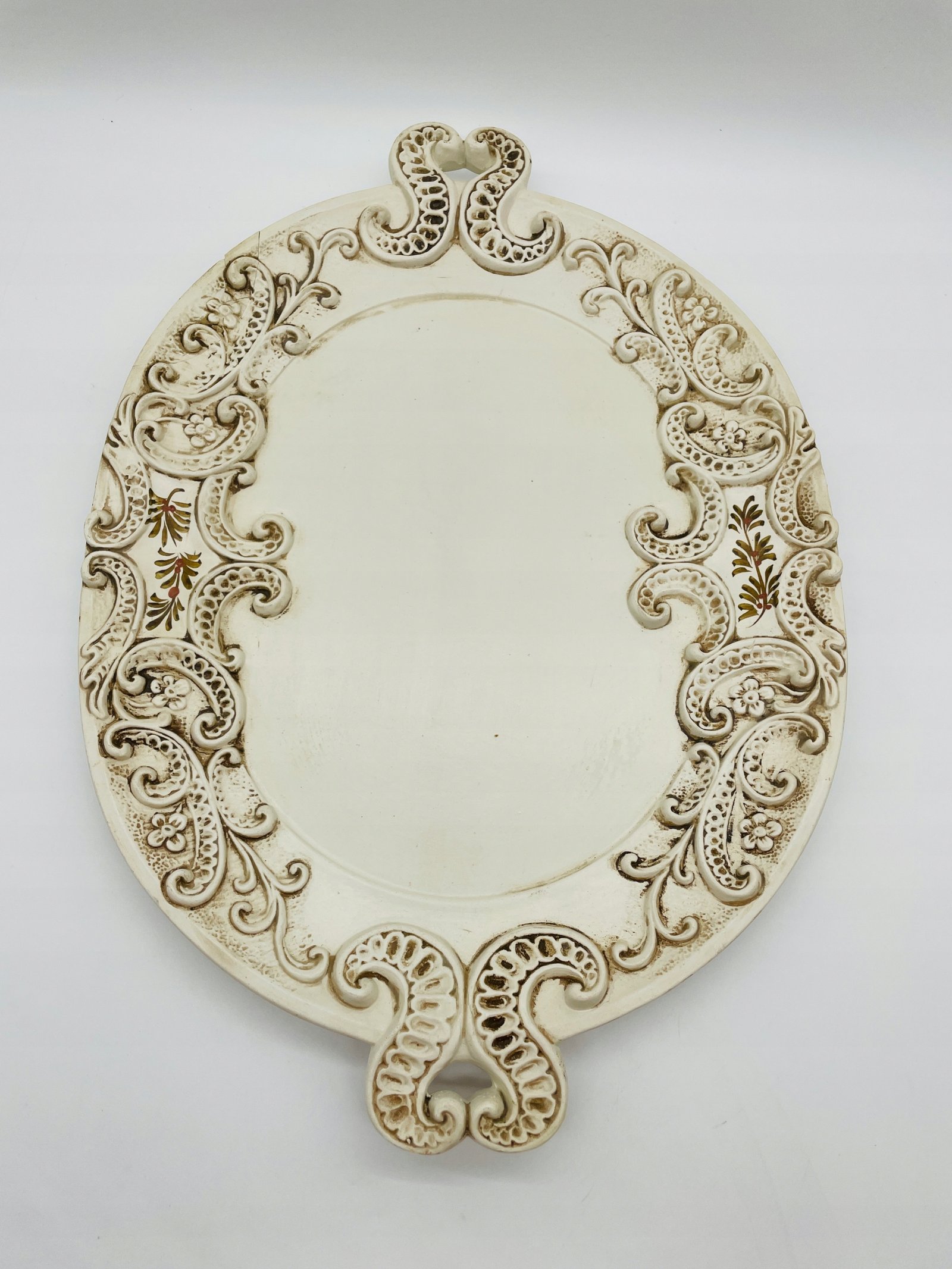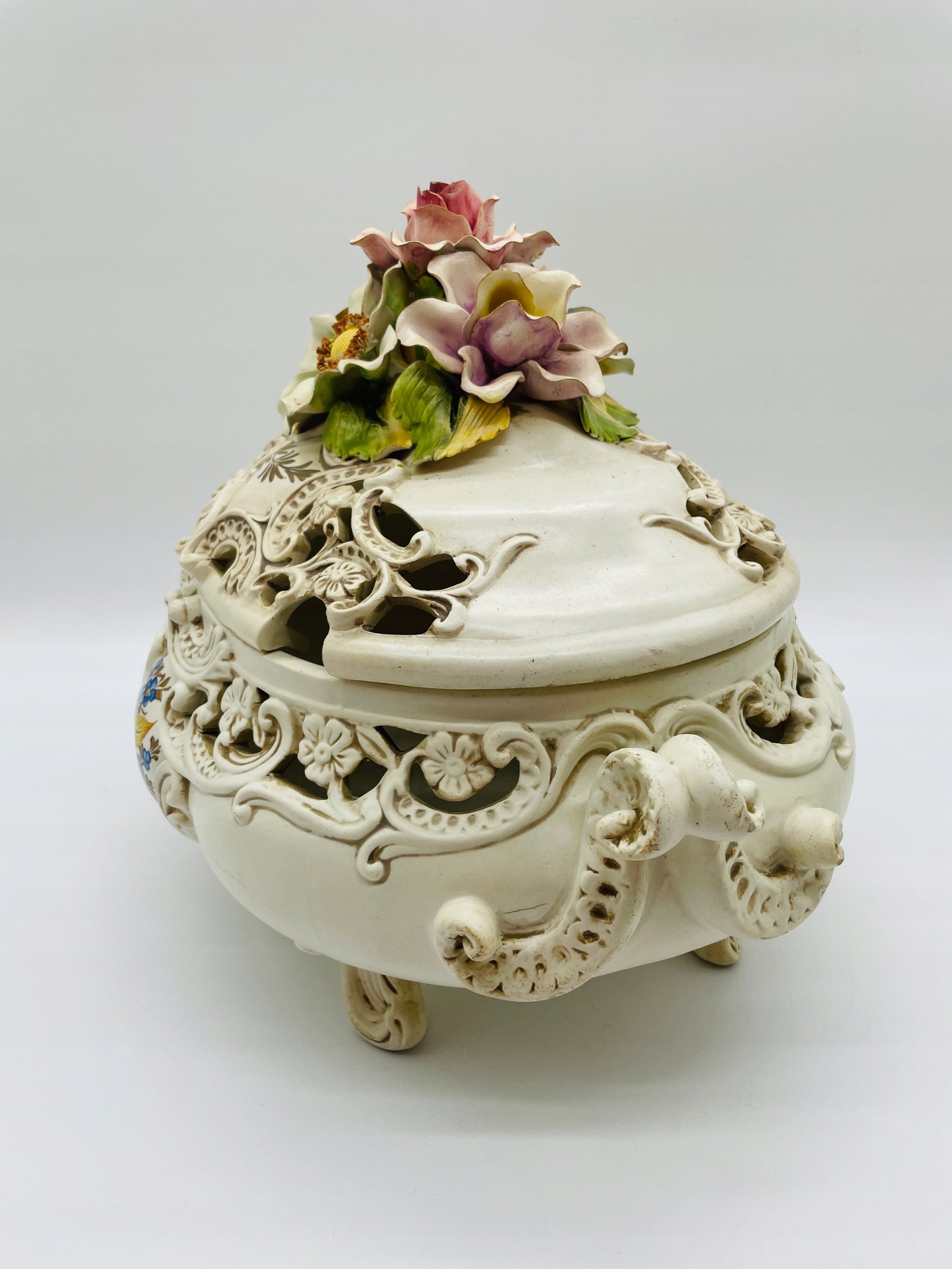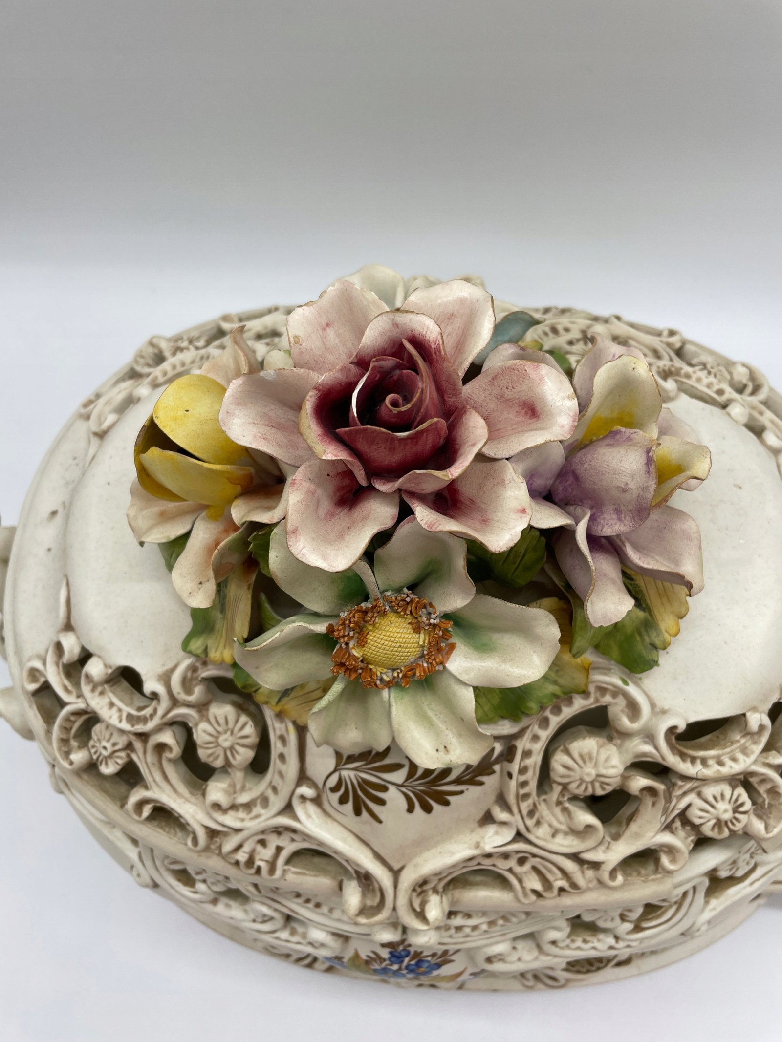 Waza na zupę Włochy lata 50. XX wieku z pokrywką zdobioną kwiatami, ażurowym wzorem i reliefowym dekorem. W zestawie znajduje się tacka i chochla z reliefowym motywem. Datowanie orientacyjne — połowa XX wieku, typowa włoska ceramika z kwiatową aplikacją. Wymiary wazy — 32×40×26 cm, tacka — 49×35 cm (uszkodzona), chochla — 18×7 cm. Materiał — ceramika szkliwiona, ręcznie malowana i zdobiona.