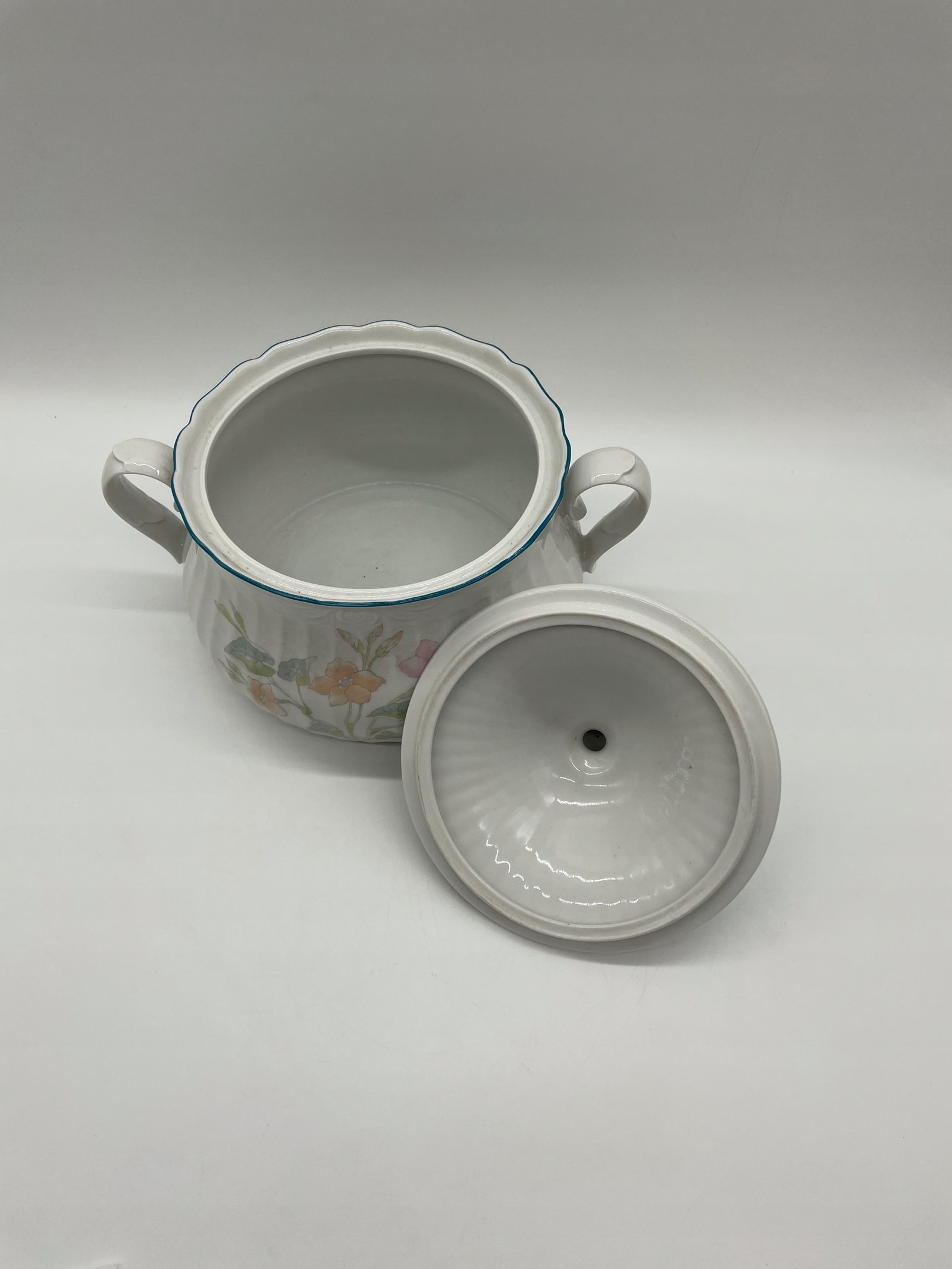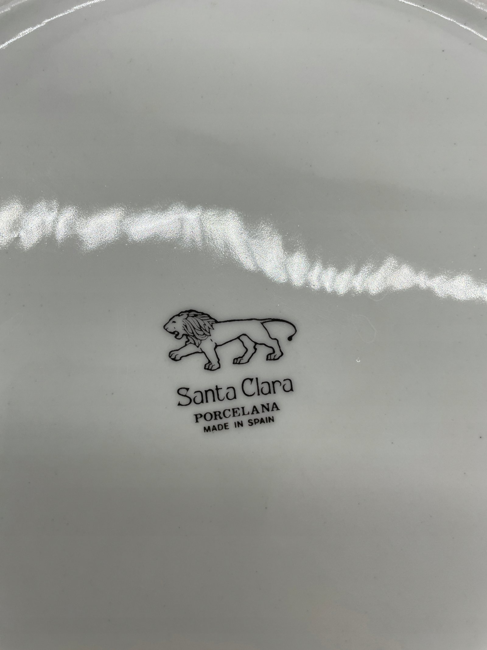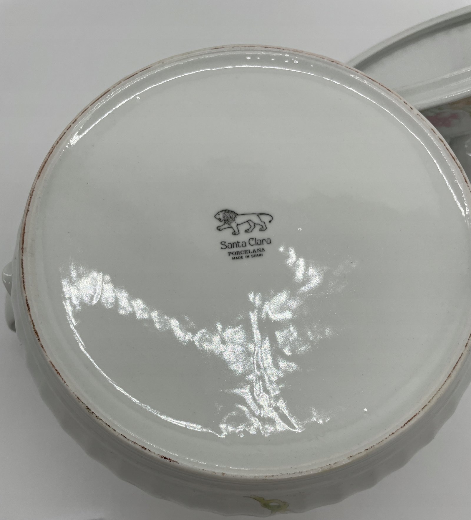 Porcelanowa waza do zupy wyprodukowana przez fabrykę Santa Clara w Hiszpanii. Powierzchnia zdobiona ornamentem kwiatowym w pastelowych kolorach. Forma reliefowa z falowanymi brzegami i dwoma uchwytami. Na spodzie znajduje się znak firmowy z lwem oraz napisem Santa Clara Porcelana Made in Spain, charakterystyczny dla wyrobów z lat 70. XX wieku.