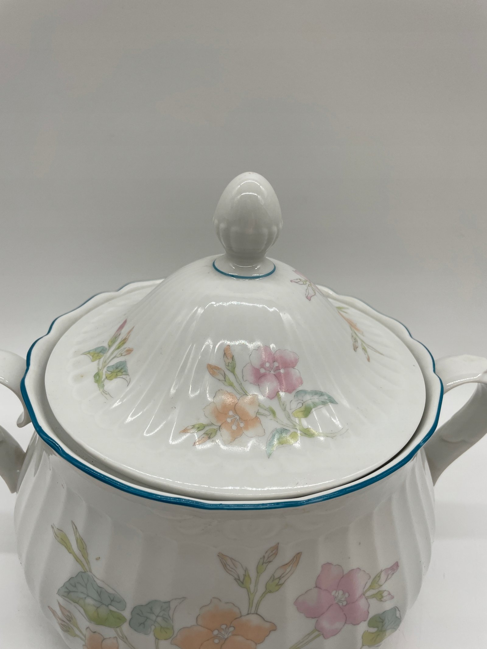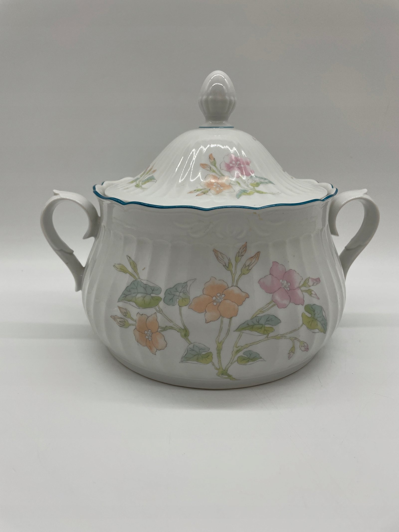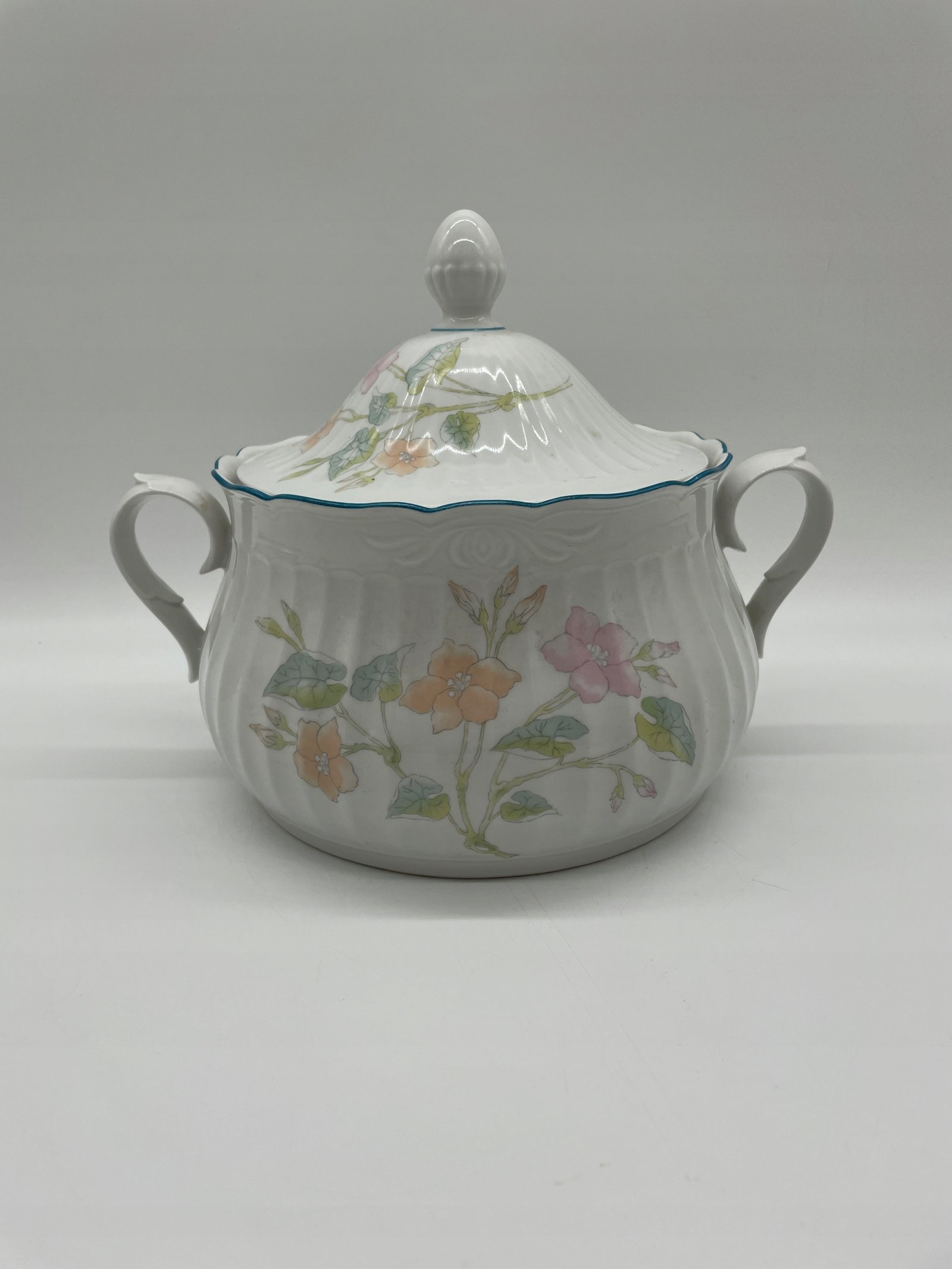 Porcelanowa waza do zupy wyprodukowana przez fabrykę Santa Clara w Hiszpanii. Powierzchnia zdobiona ornamentem kwiatowym w pastelowych kolorach. Forma reliefowa z falowanymi brzegami i dwoma uchwytami. Na spodzie znajduje się znak firmowy z lwem oraz napisem Santa Clara Porcelana Made in Spain, charakterystyczny dla wyrobów z lat 70. XX wieku.