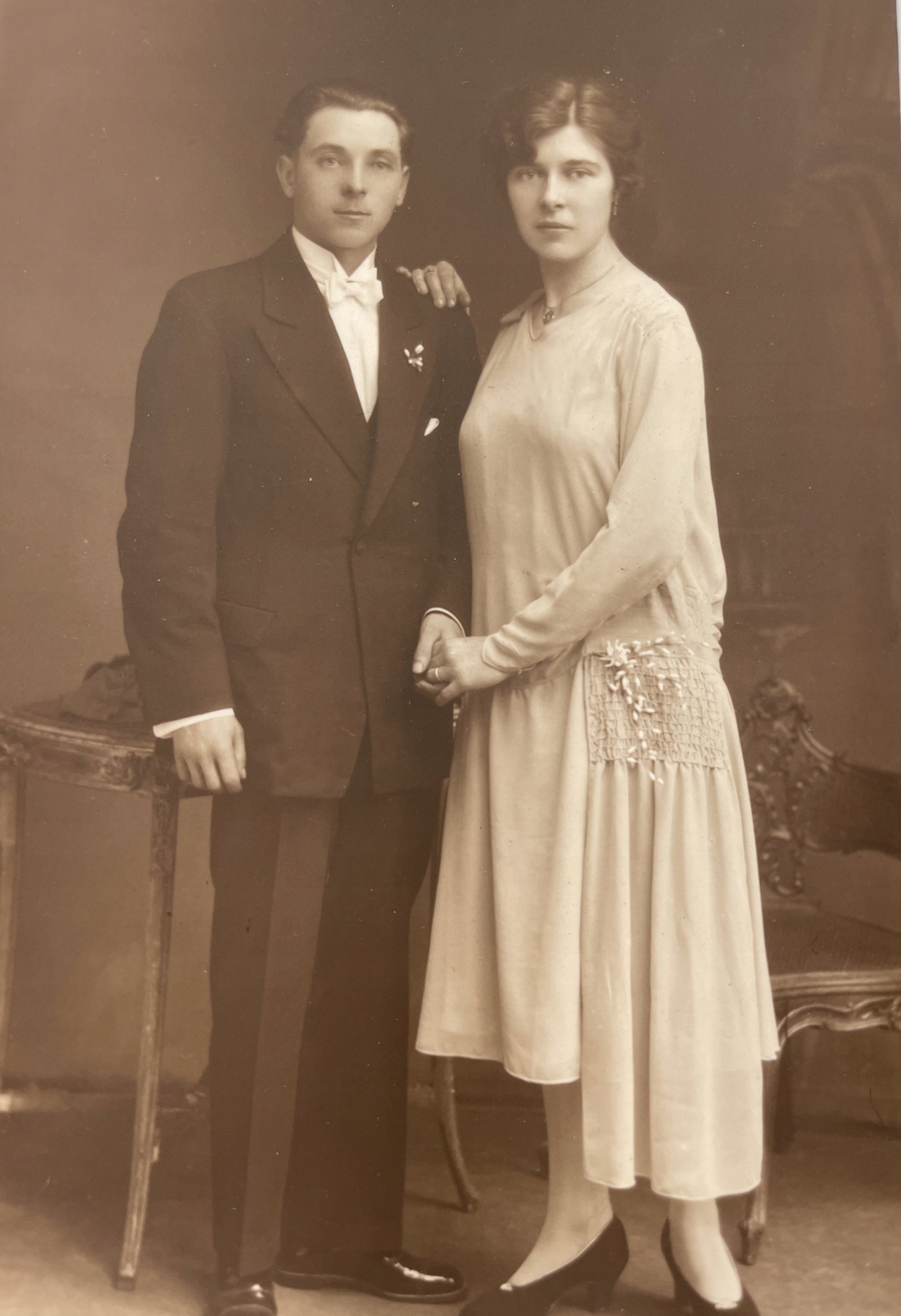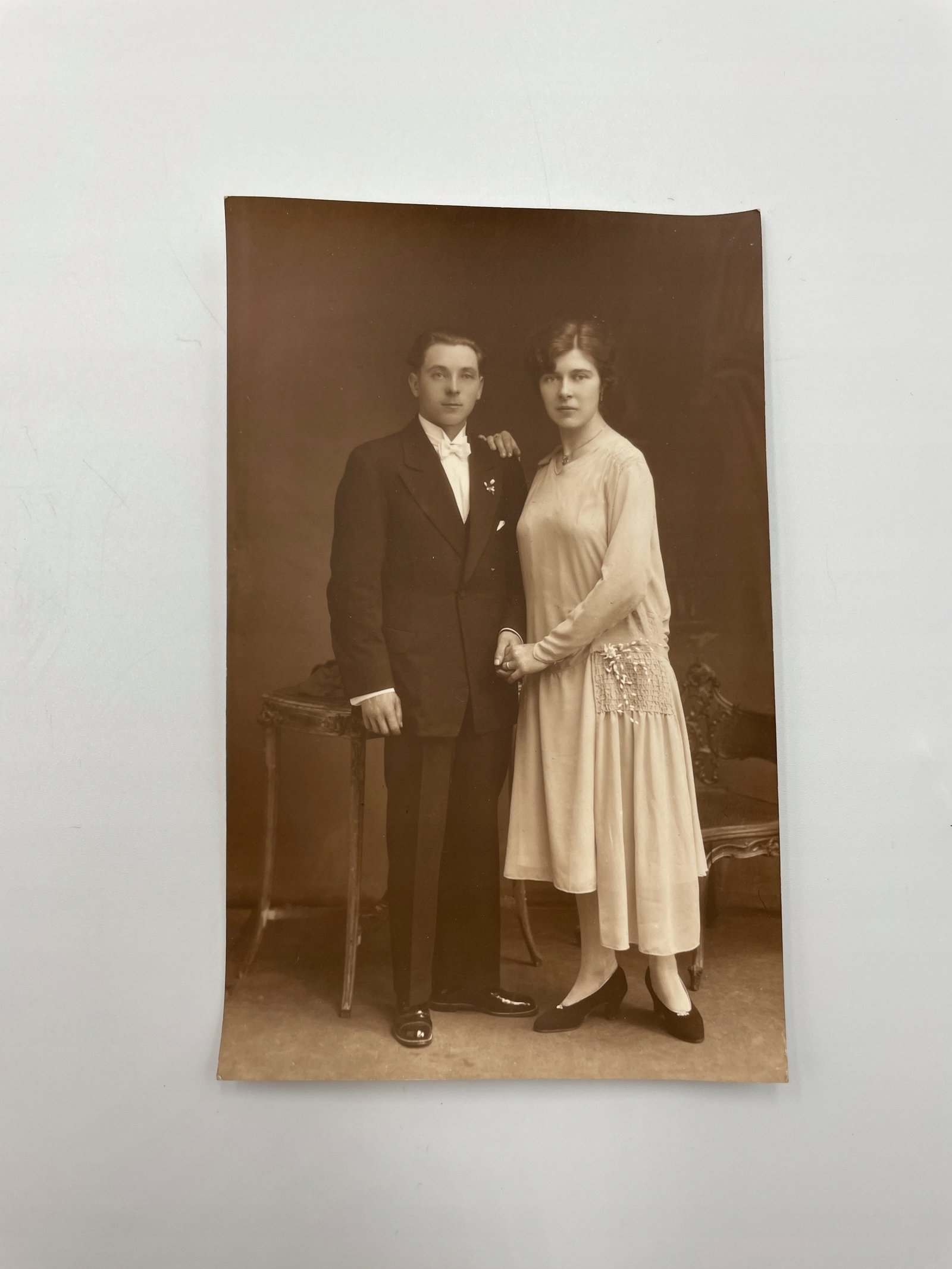 Oryginalne czarno-białe zdjęcie vintage z lat 20. XX wieku, przedstawiające elegancko ubraną parę – najprawdopodobniej portret ślubny lub zaręczynowy. Zdjęcie wykonane w atelier z charakterystycznym studyjnym tłem i umeblowaniem.