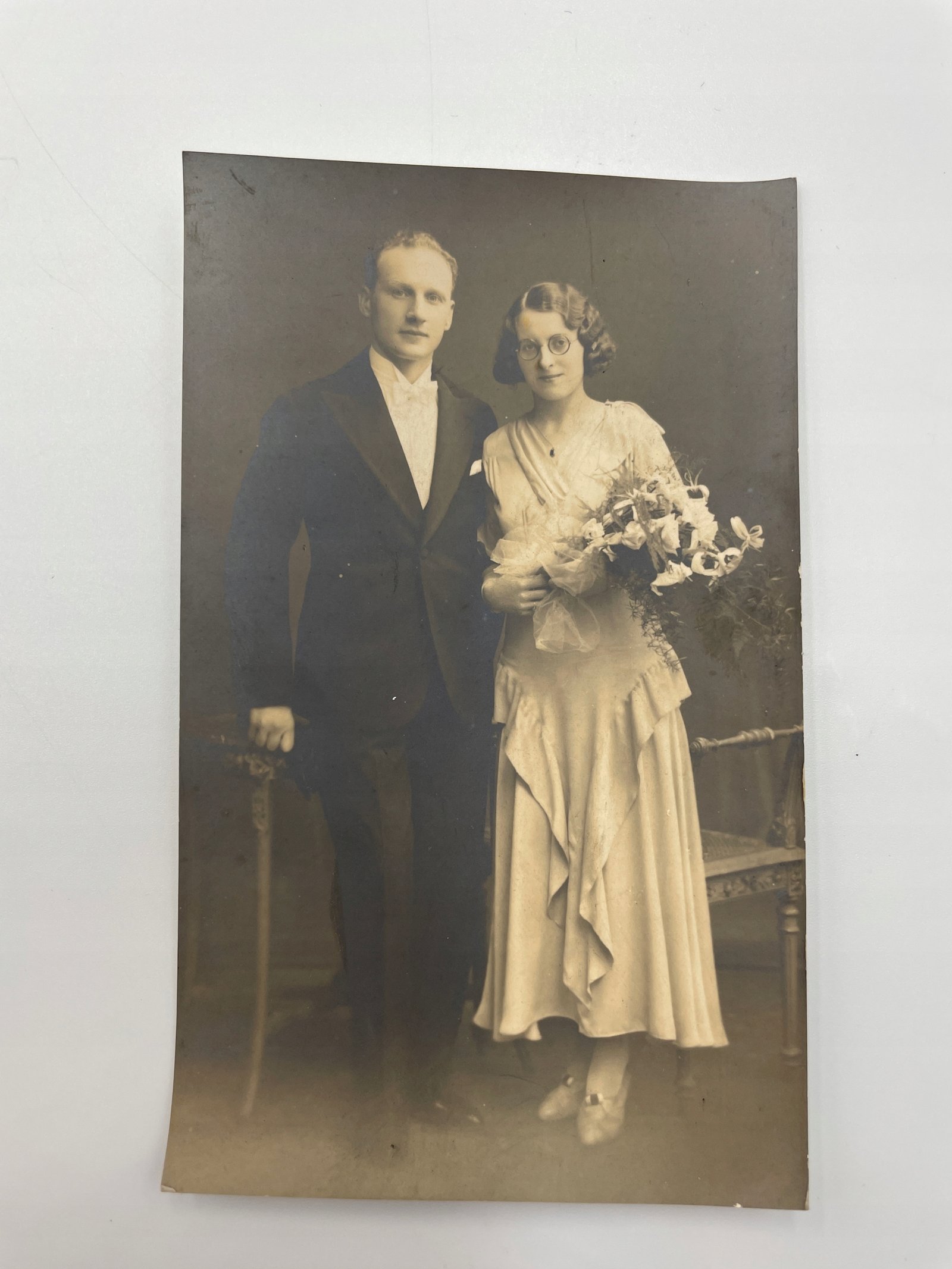 Oryginalne czarno-białe zdjęcie vintage z lat 20. XX wieku, przedstawiające elegancko ubraną parę – najprawdopodobniej portret ślubny lub zaręczynowy. Zdjęcie wykonane w atelier z charakterystycznym studyjnym tłem i umeblowaniem.