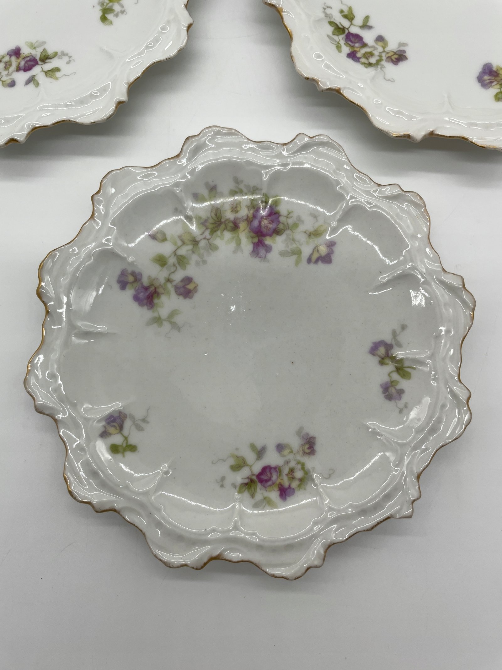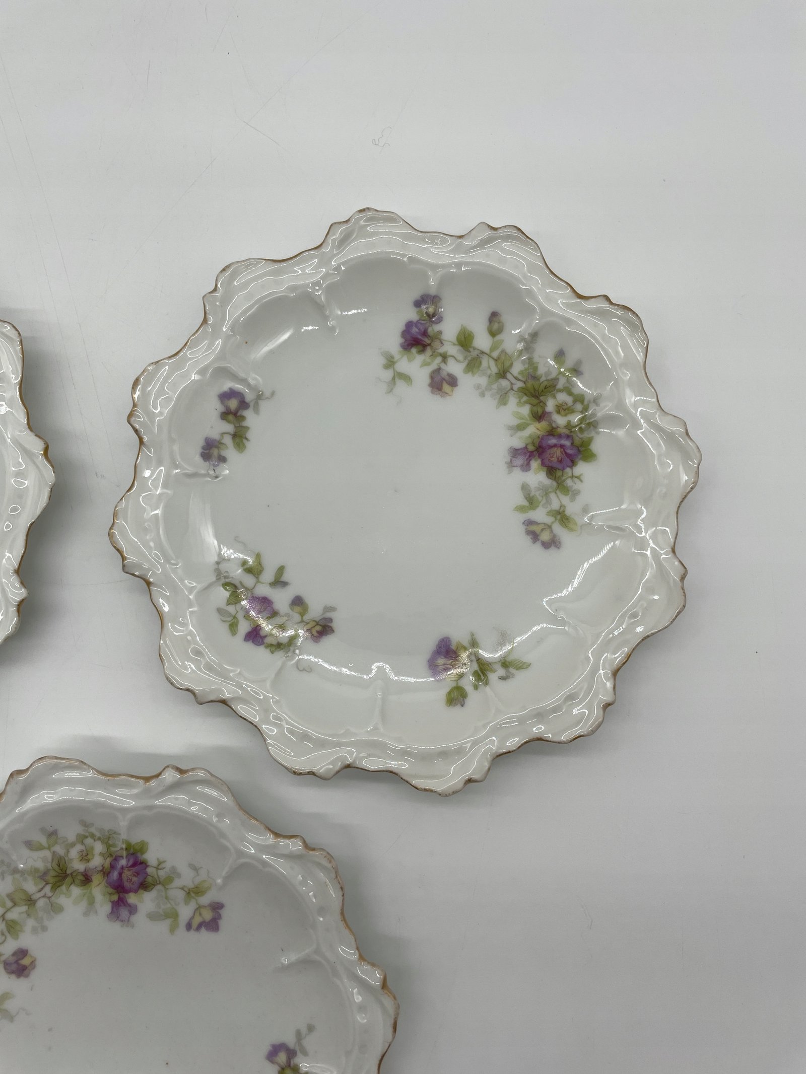 Zabytkowy zestaw trzech porcelanowych talerzyków deserowych z reliefowym brzegiem i złoceniem. Zdobione delikatnym kwiatowym motywem w odcieniach fioletu i różu. Na spodzie znajduje się niebieski znak L. Rossum-Voet, Palais du Cristal, Bruxelles, odnoszący się do belgijskiego domu handlowego, który sprzedawał porcelanę i kryształy na przełomie XIX i XX wieku. Same talerzyki najprawdopodobniej pochodzą z Europy Środkowej (Niemcy, Francja lub Austro-Węgry) i były dystrybuowane przez sklep w Brukseli.