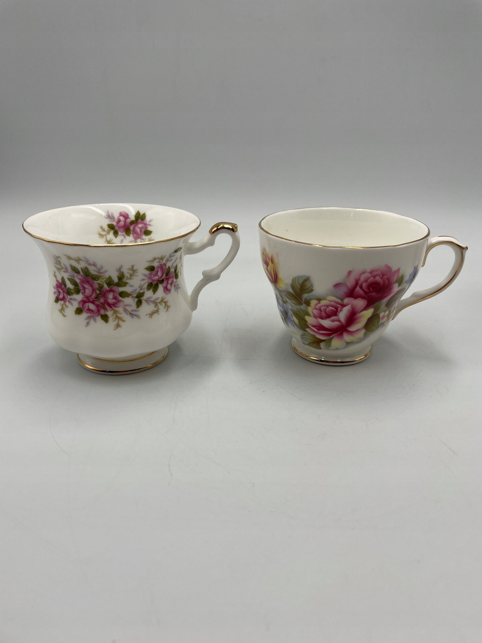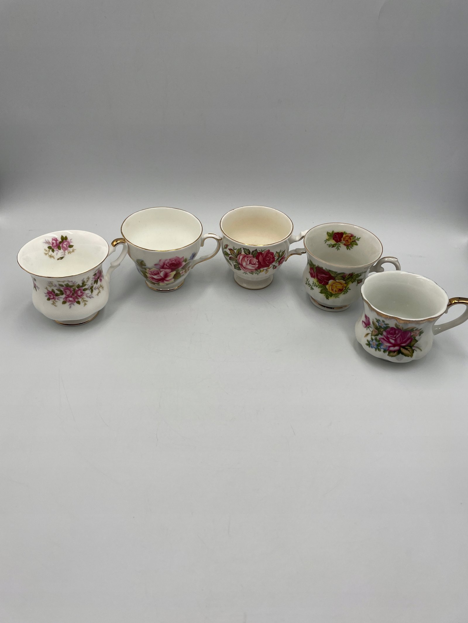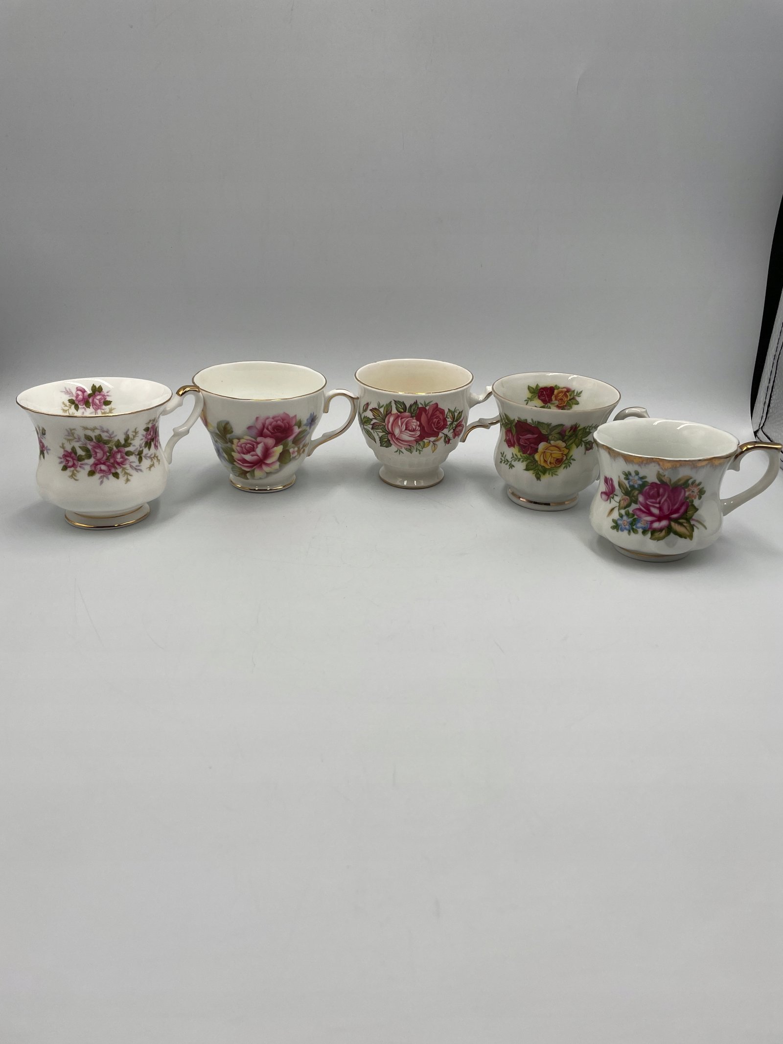 Zestaw 5 filiżanek porcelanowych z kwiatowym wzorem. Każda filiżanka ozdobiona jest delikatnymi różami oraz złoconymi detalami. Filiżanki różnią się wzorem, co nadaje różnorodności podczas serwowania.
