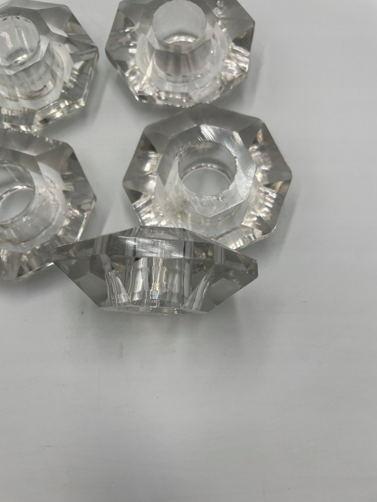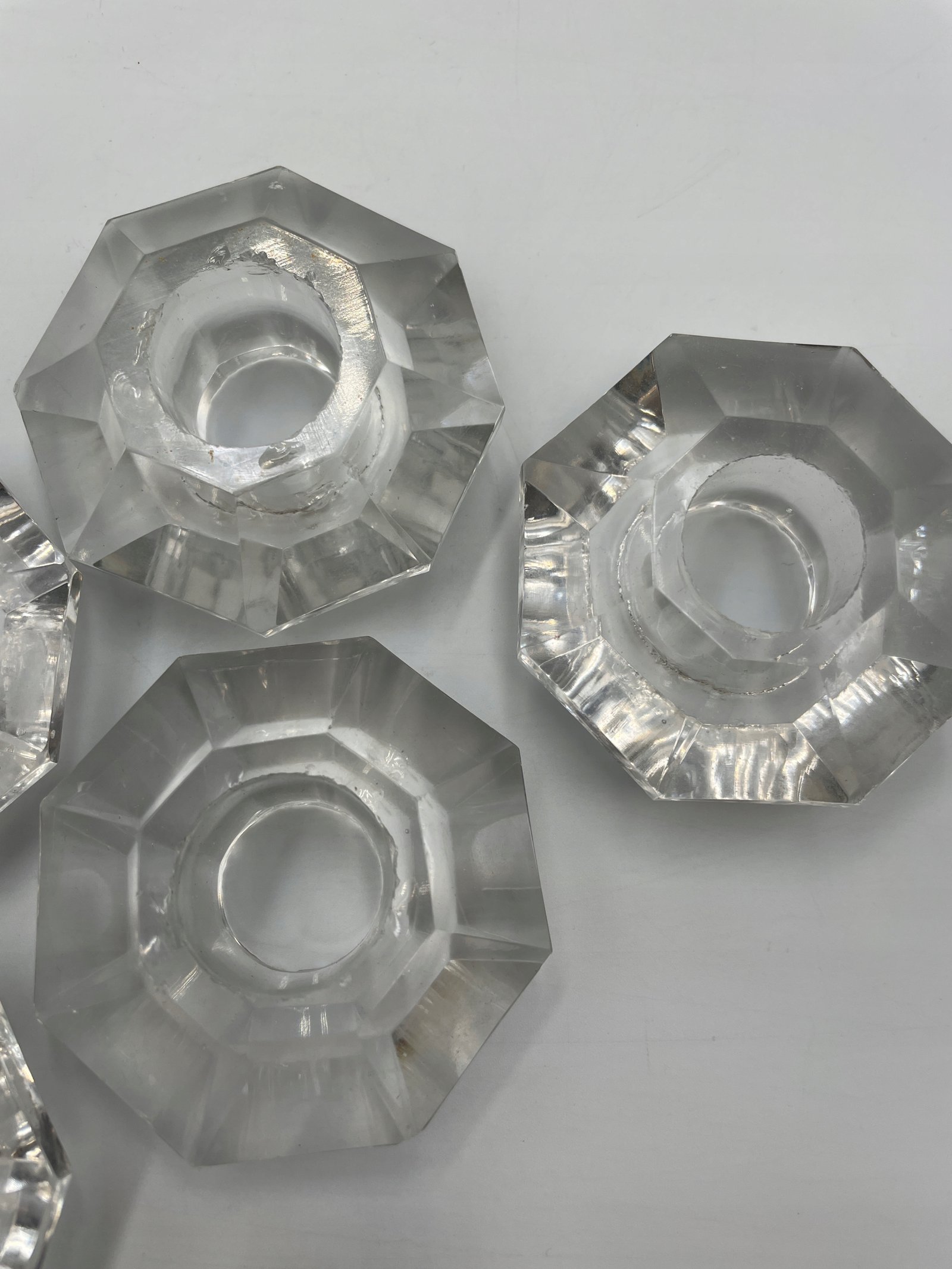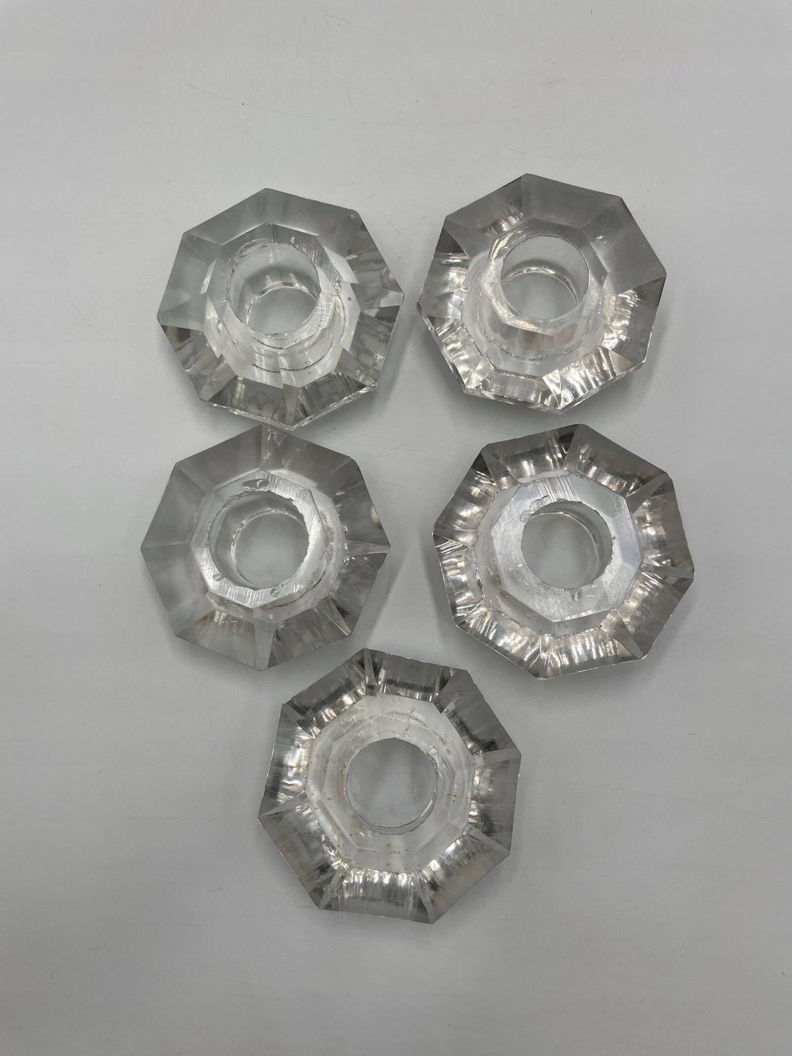 Opis przedmiotu: Zestaw składający się z 5 szklanych elementów o ośmiokątnym kształcie, idealnych jako części zamienne lub dekoracyjne do lamp, żyrandoli lub innych opraw oświetleniowych. Każdy element wykonany jest z przezroczystego szkła o fasetowanej powierzchni, co pozwala na efektowne załamanie światła.