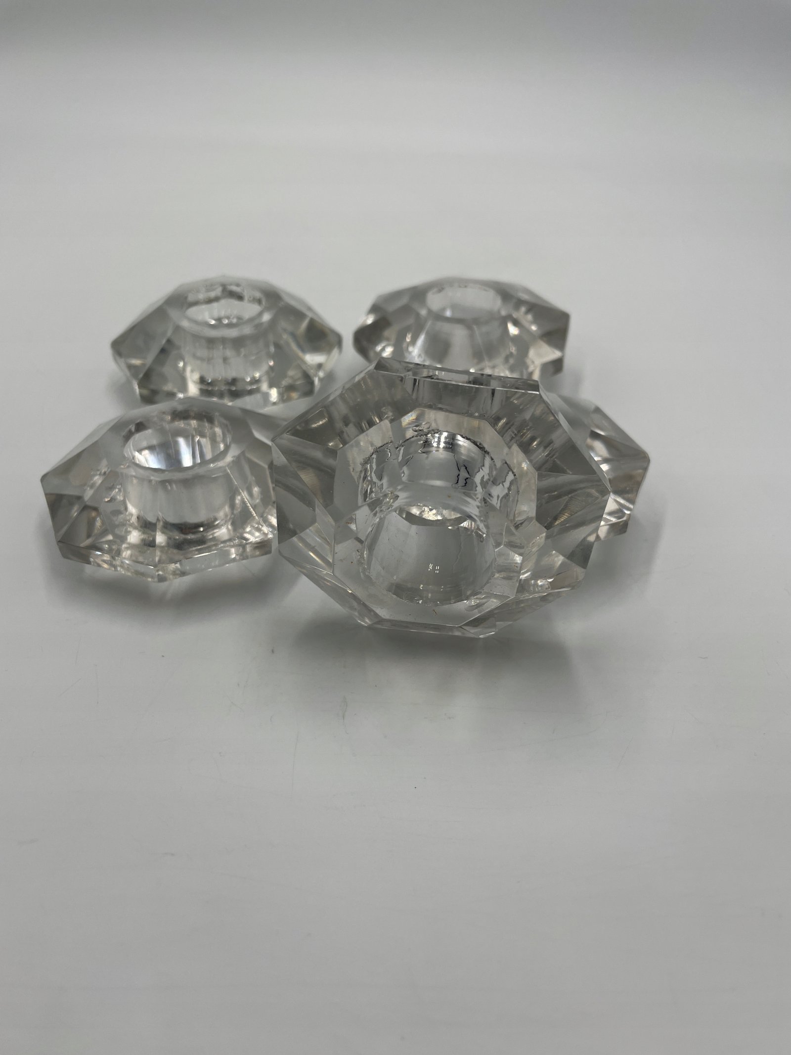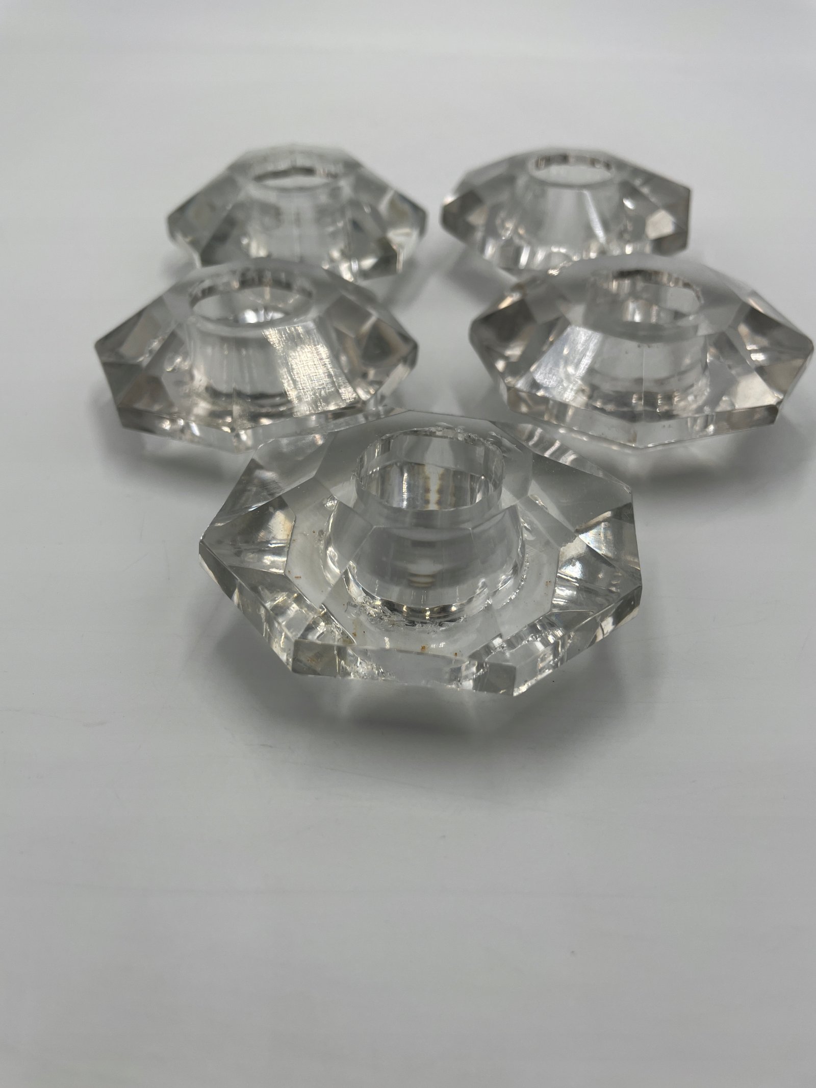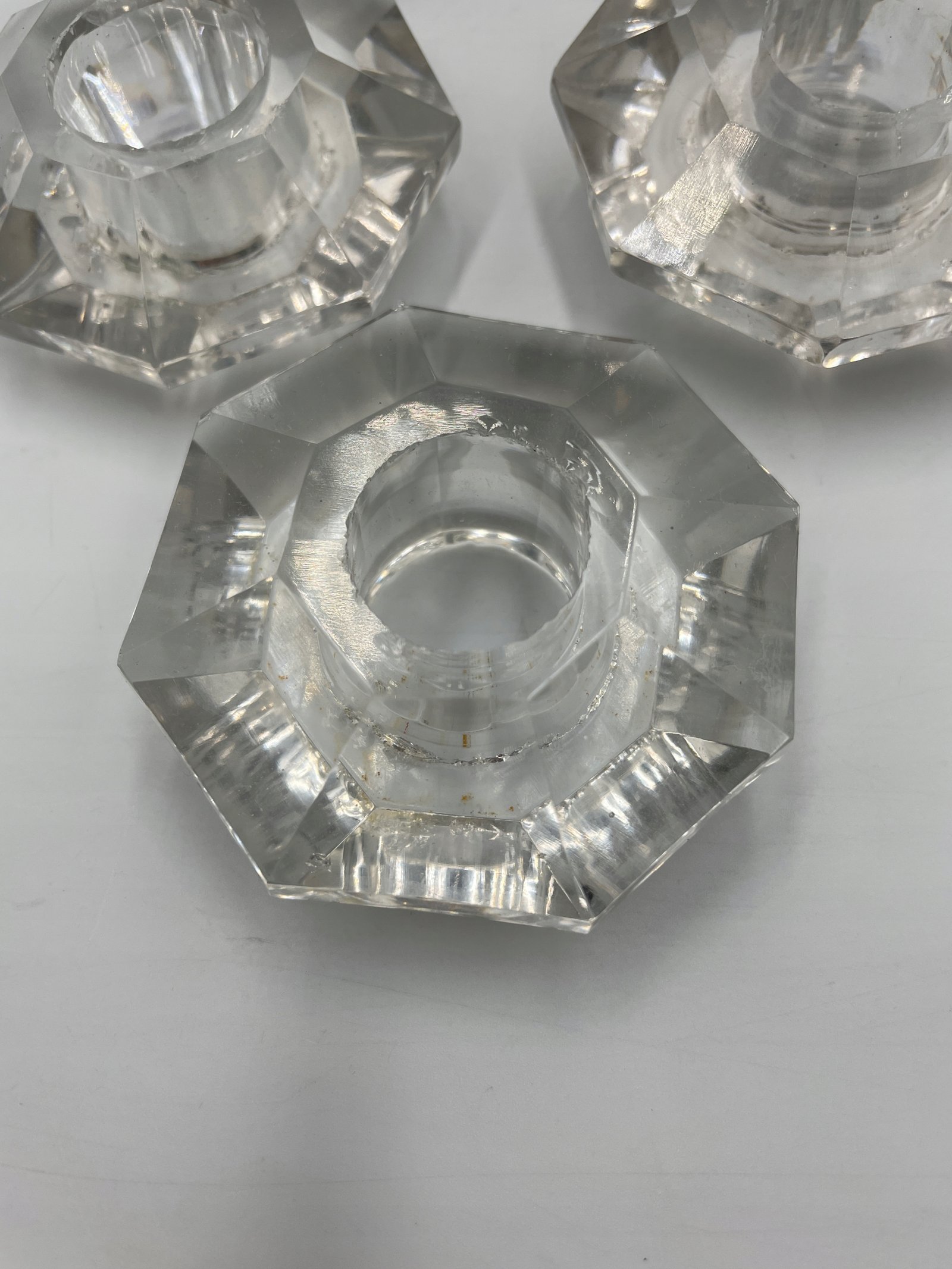 Opis przedmiotu: Zestaw składający się z 5 szklanych elementów o ośmiokątnym kształcie, idealnych jako części zamienne lub dekoracyjne do lamp, żyrandoli lub innych opraw oświetleniowych. Każdy element wykonany jest z przezroczystego szkła o fasetowanej powierzchni, co pozwala na efektowne załamanie światła.