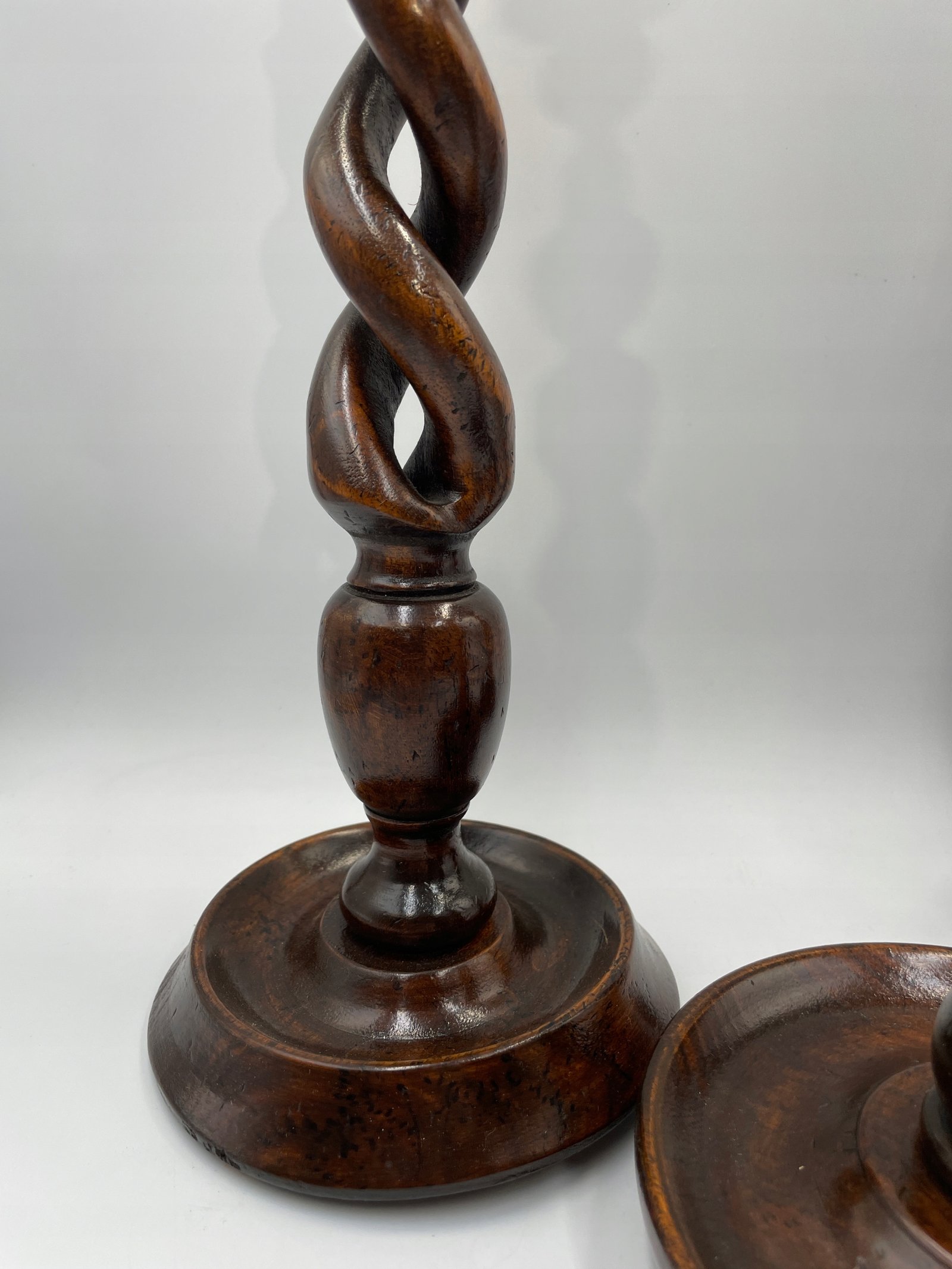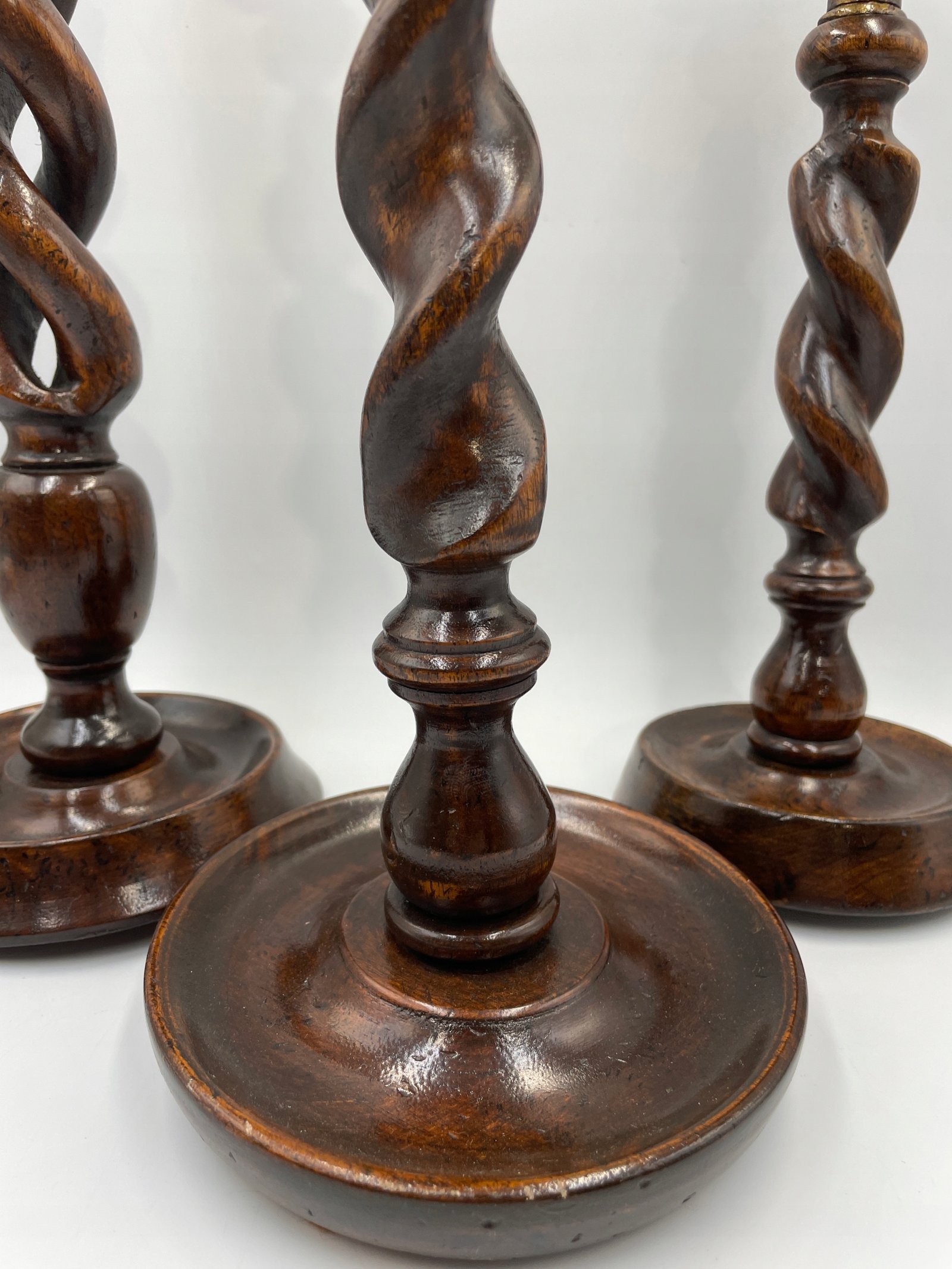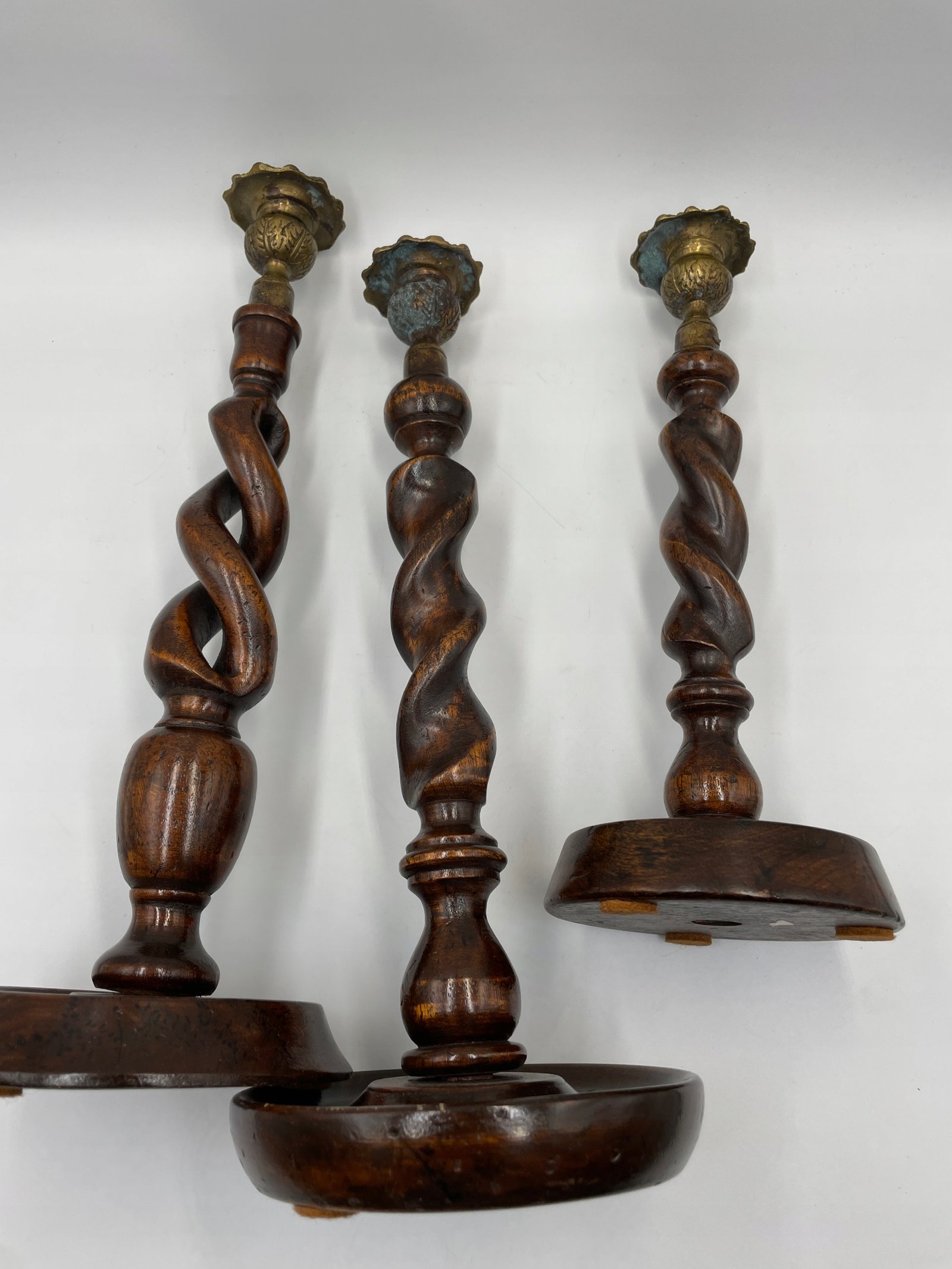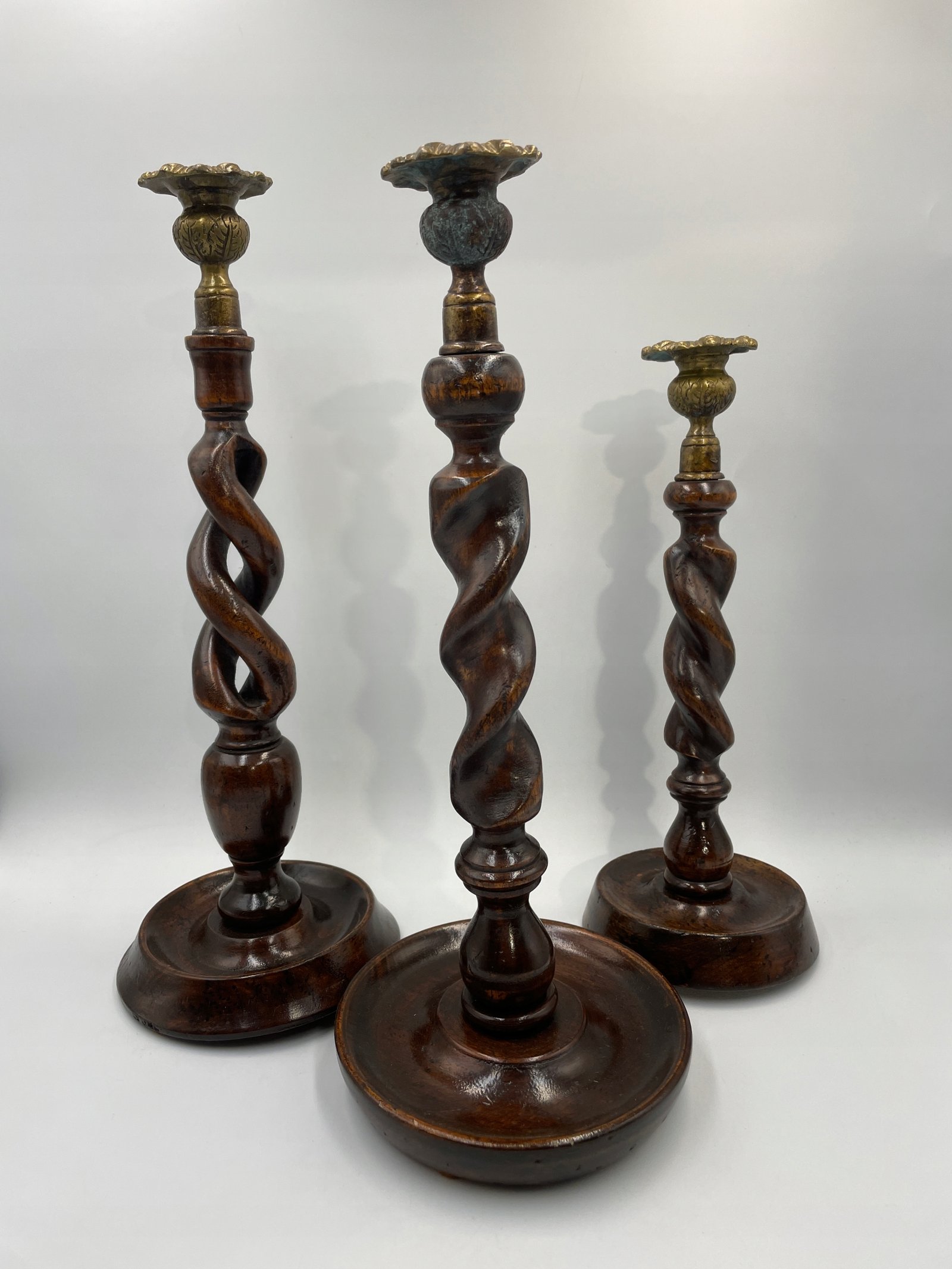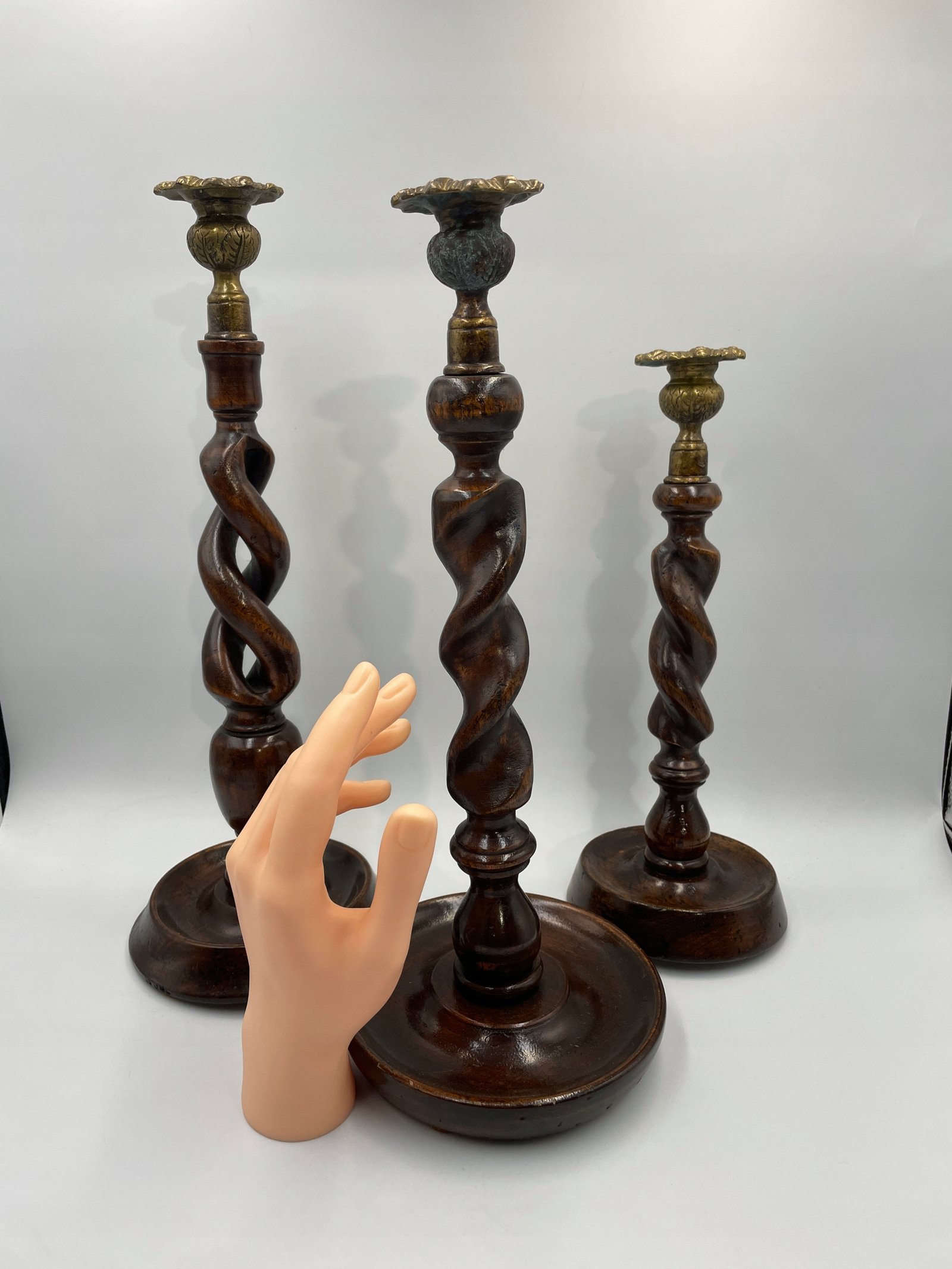 Elegancki zestaw trzech spiralnych świeczników w stylu angielskim będzie efektownym akcentem w każdym wnętrzu. Każdy egzemplarz wykonany jest z ciemnego, polerowanego drewna i posiada dekoracyjne, mosiężne uchwyty na świece, które dodają całości wyrafinowanego charakteru. Spiralna forma trzonów podkreśla kunszt rzeźbienia, a różne wysokości tworzą harmonijny komplet na kominku, stole jadalnym lub w salonie.