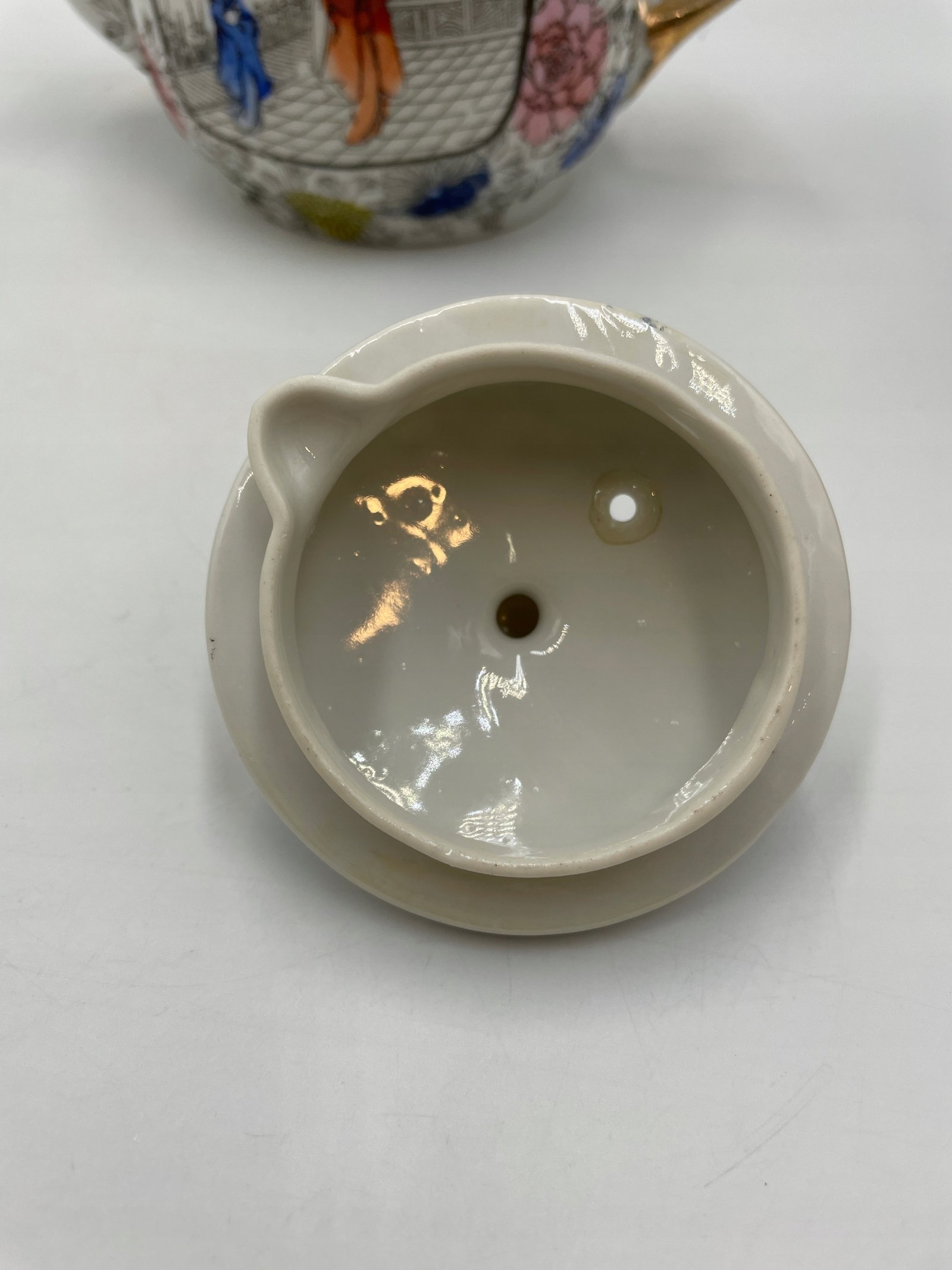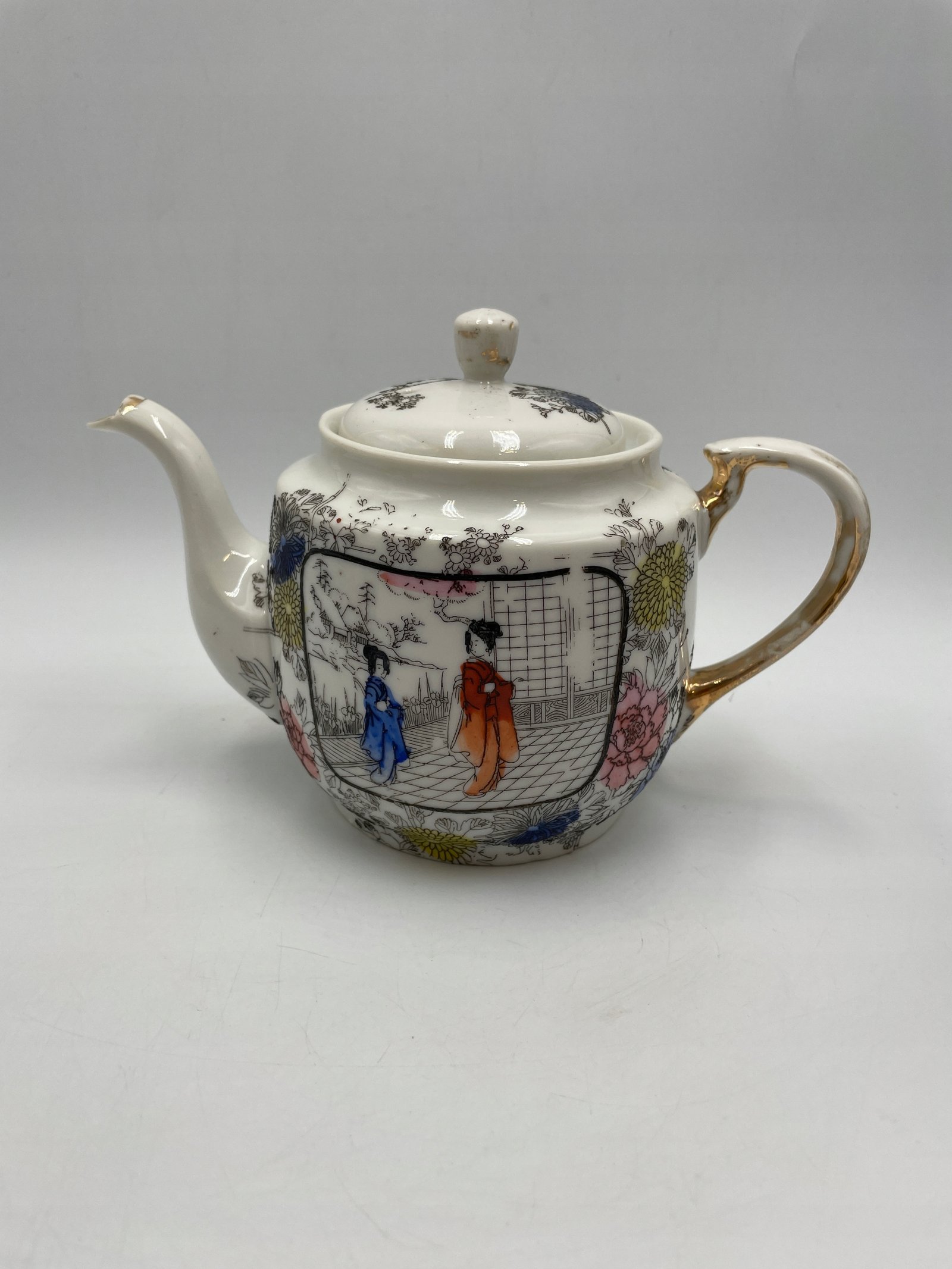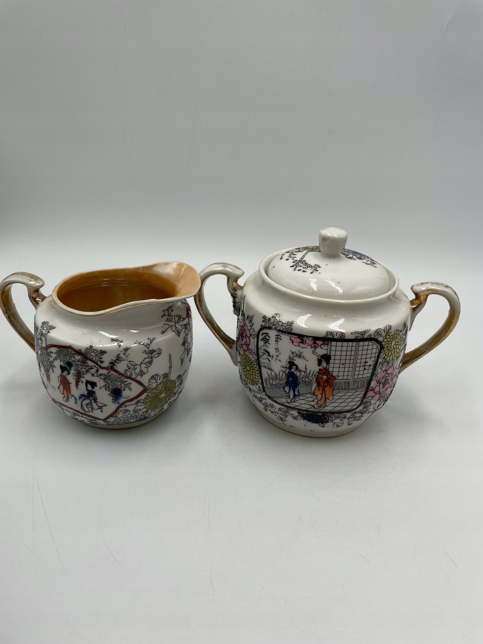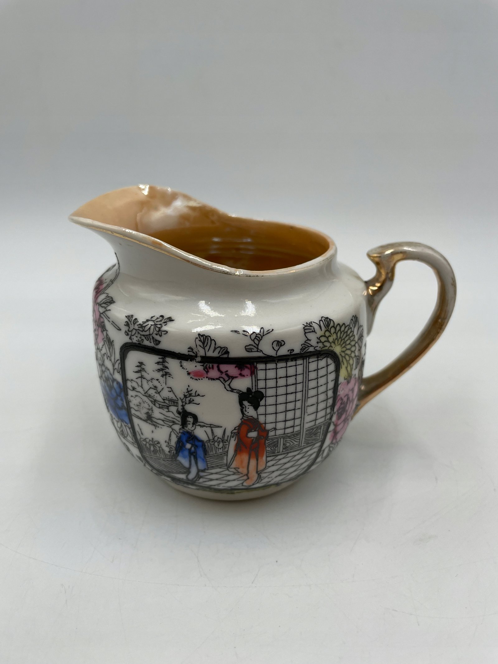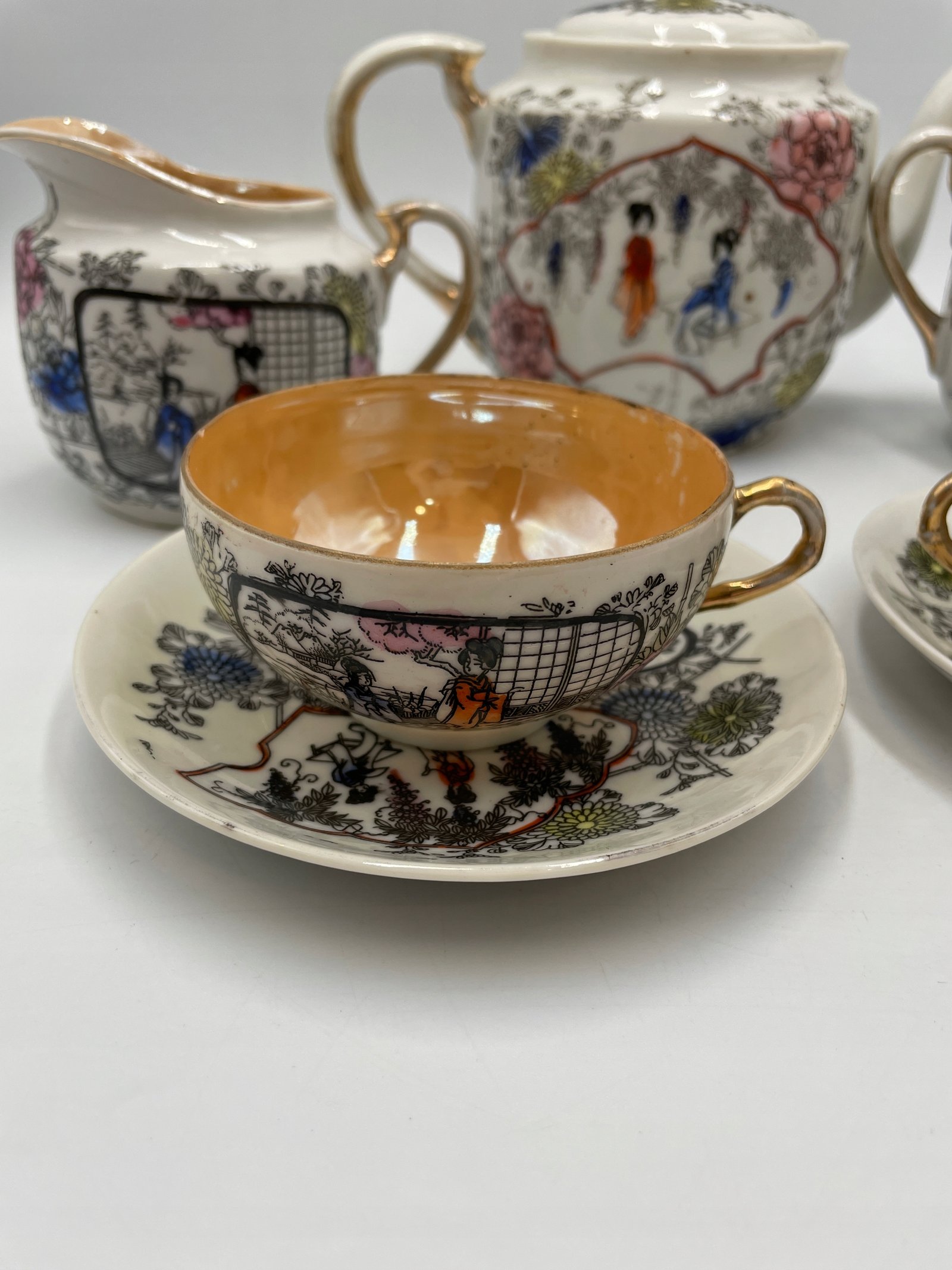 Design i dekoracja: Zestaw wykonany w eleganckim stylu wschodnim z delikatnym ornamentem i ręcznie malowanymi wzorami. Główny motyw to japońskie sceny z postaciami w tradycyjnych strojach na tle kwitnących ogrodów. Wnętrze filiżanek i mlecznika pokryte jest ciepłą złotawą powłoką, co tworzy efektowny kontrast z biało-czarnym dekorem.