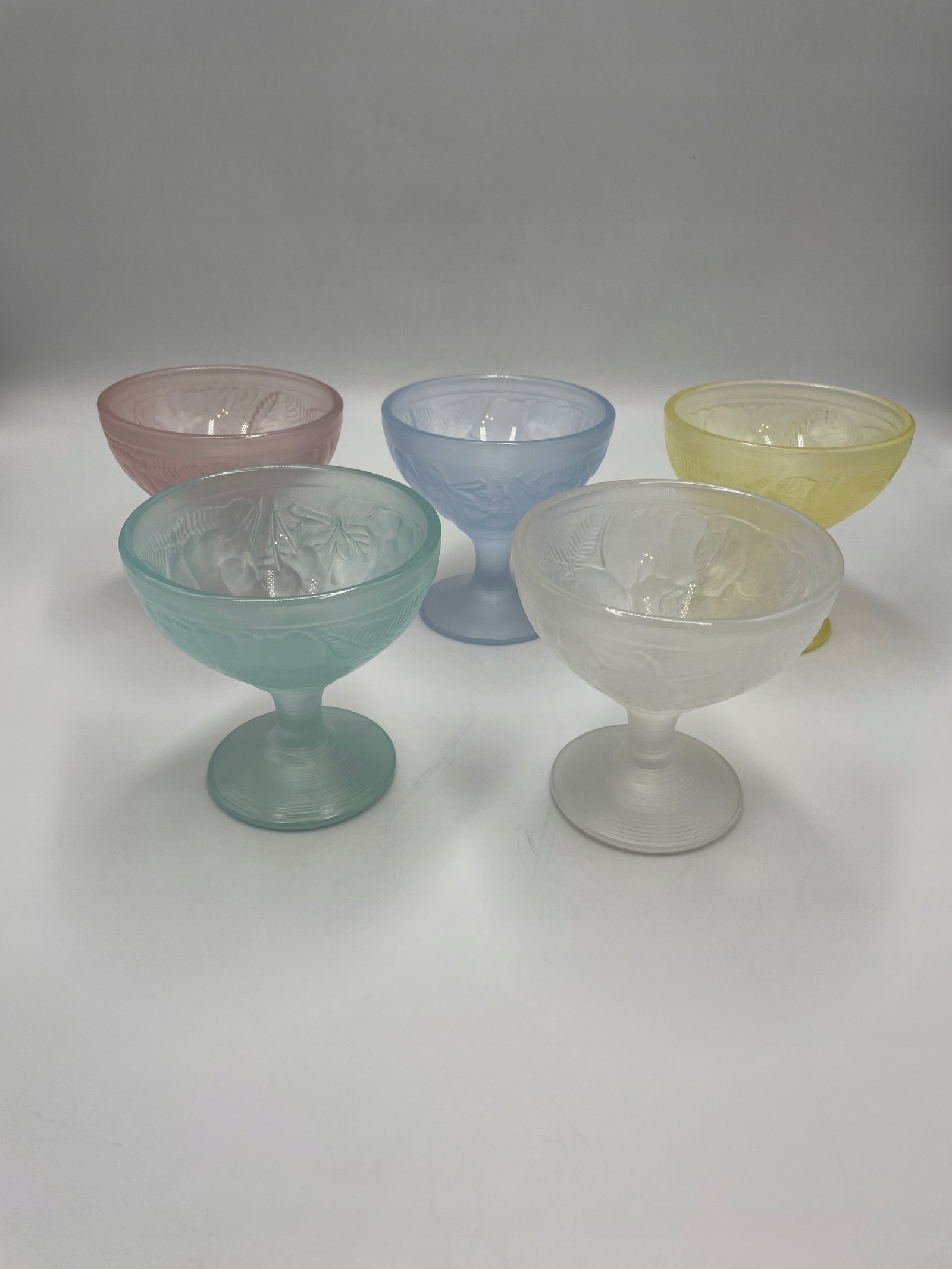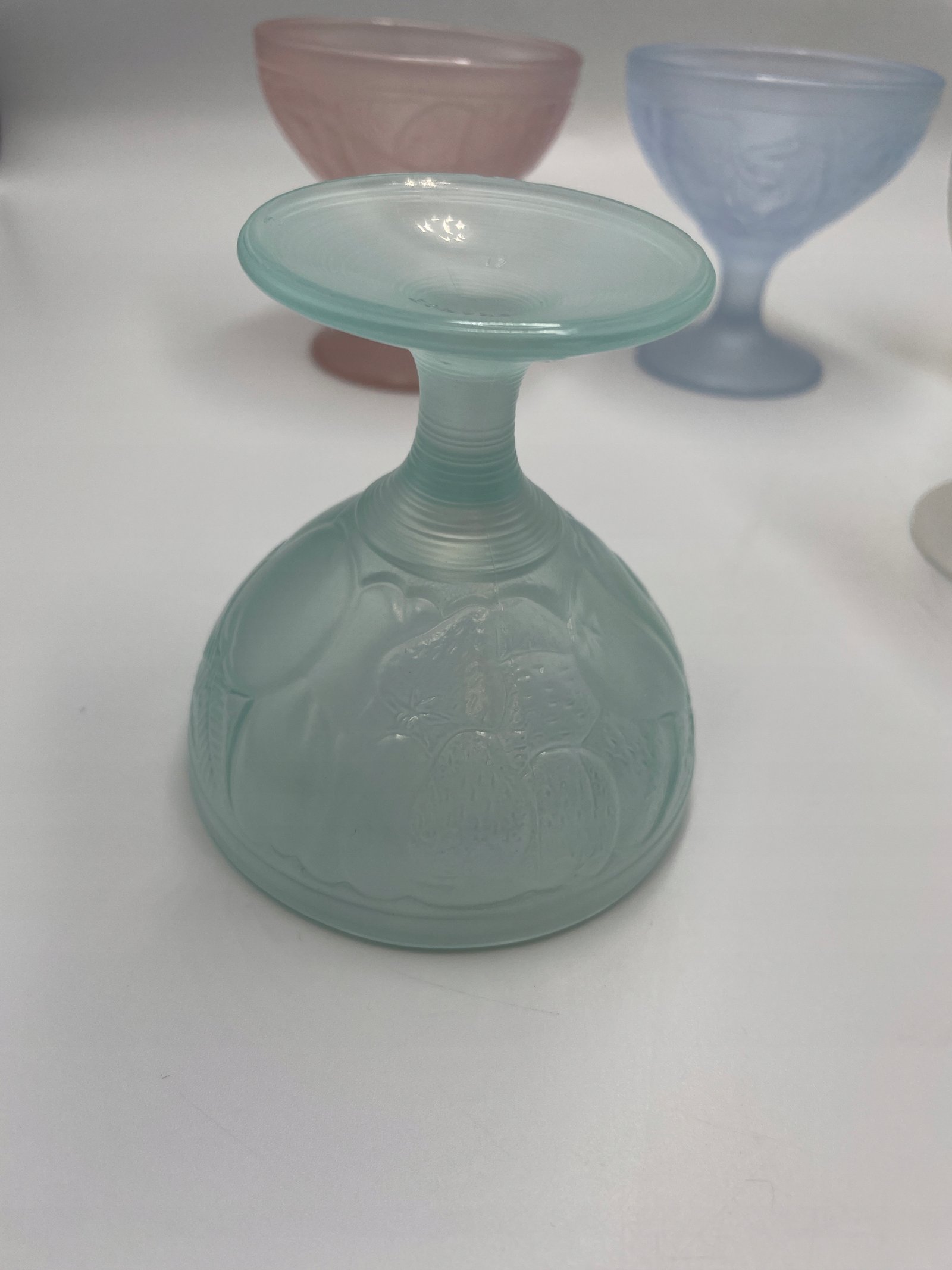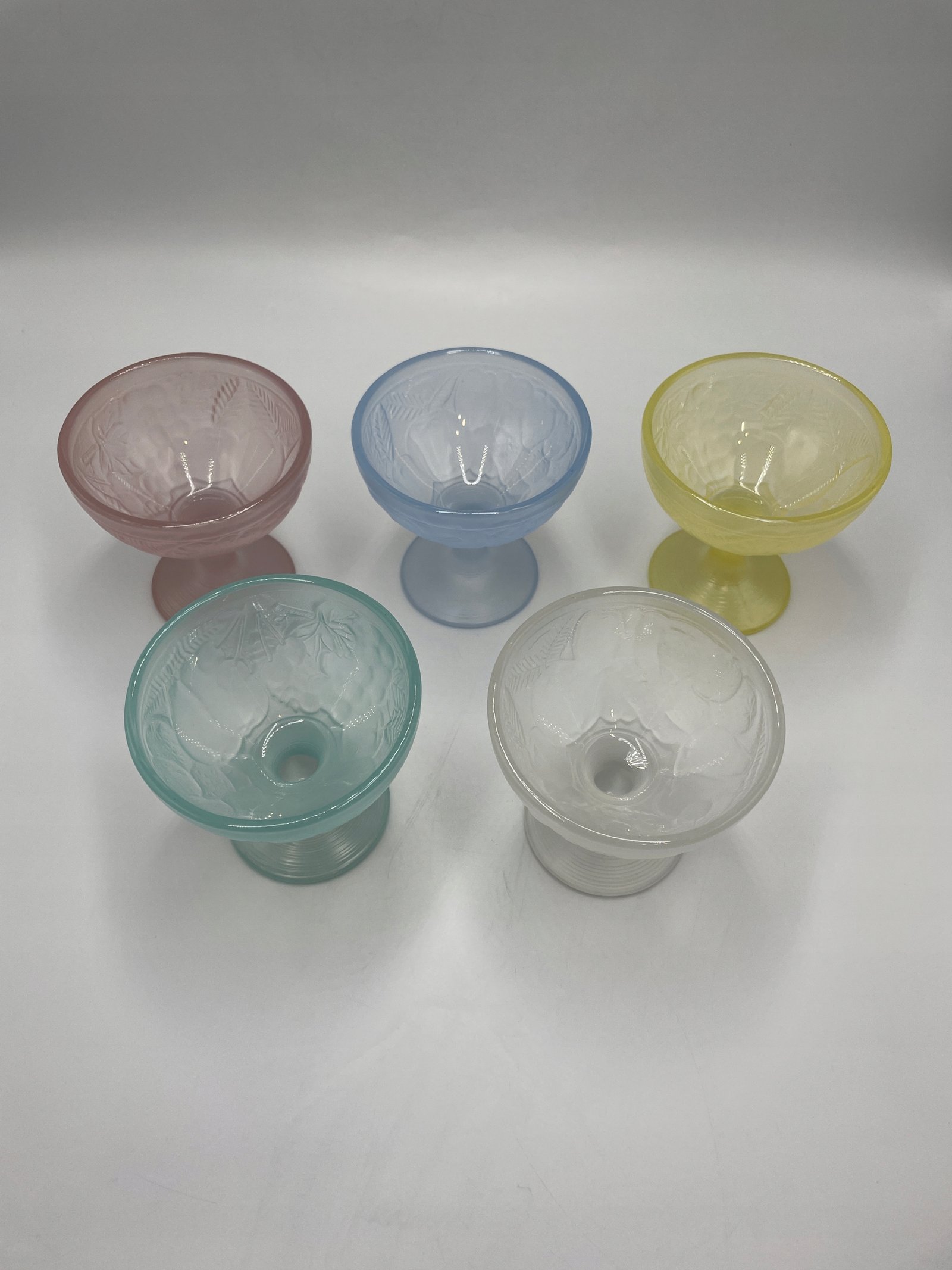 Antyczny zestaw 5 kielichów deserowych na nóżce, wykonanych we Francji. Kielichy zostały wykonane z matowego, kolorowego szkła w pastelowych odcieniach: niebieskim, różowym, żółtym, zielonym i białym. Każdy kielich ozdobiony jest reliefowym wzorem z motywami owoców i roślin, co nadaje mu wyjątkowy charakter.