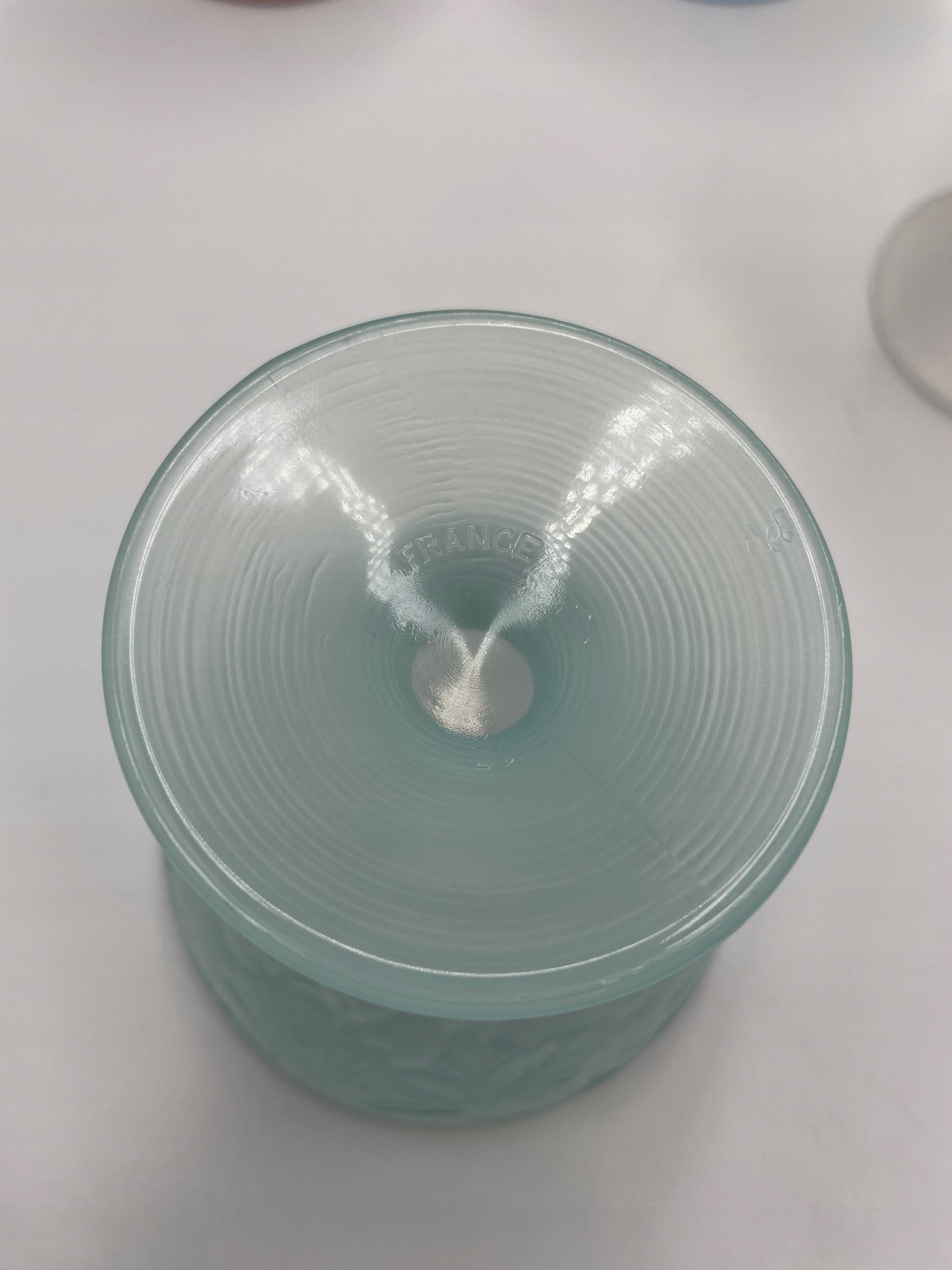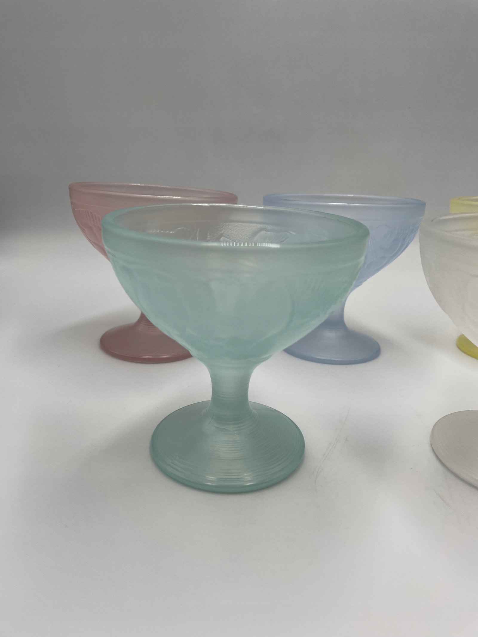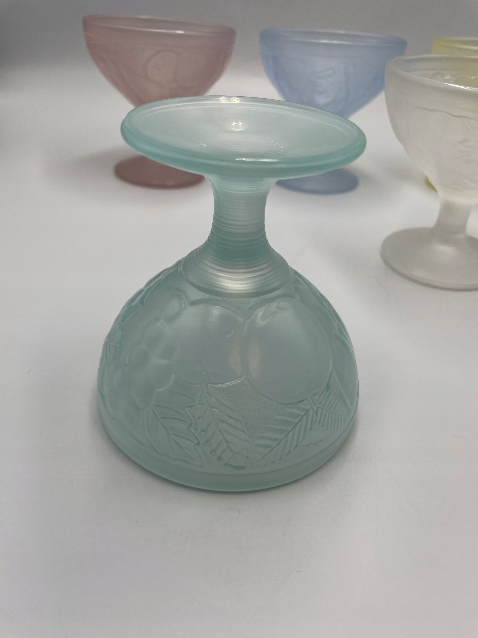 Antyczny zestaw 5 kielichów deserowych na nóżce, wykonanych we Francji. Kielichy zostały wykonane z matowego, kolorowego szkła w pastelowych odcieniach: niebieskim, różowym, żółtym, zielonym i białym. Każdy kielich ozdobiony jest reliefowym wzorem z motywami owoców i roślin, co nadaje mu wyjątkowy charakter.
